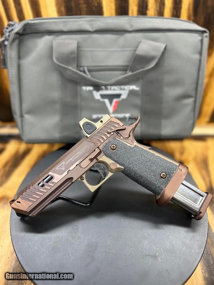 Description: Guns Listing ID: 819711 The Sand Viper was designed to be the ultimate 2gun/3gun pistol. This firearm runs flawlessly with any factory or handloaded ammunition. With its extremely flat shooting compensator and low bore axis optic cut, point of aim will be nearly dead on at every distance from 5 yards to 50! This gun is already the sickest serpent on the planet holding the overall win at the USPSA 2gun nationals. Unlike many other 2011s, the fit and finish is like nothing you‚‚ve ever held. These guns are tailor designed to fit and feel exactly like the guns Taran has used building his legacy. The memory groove is blended seamlessly to activate immediately. For any shooter this is the most astonishing handgun you’ll ever hold. Be careful of its hidden fangs! 5 Inch Large Single Port Compensator with DLC Coated Match Grade Barrel Precision Optic Cut for Trijicon RMR/SRO (Ultra Low) Coyote Bronze DLC Coating on Frame and High Polished Slide Extreme Engineering Fire Control Group (Lite Speed Hammer, Ultra Low Mass Sear, Match Disconnector and Titanium Hammer Strut) Aftec Extractor Oversized Magwell Extended Slide Release Extended Checkered Mag release 1.75-2.25 LBS trigger pull Stainless Steel Guide Rod Ultimate Ergonomic Beavertail and Safety Fit Ambidextrous Blended Safety Accessory Rail Cut DLC Coated Steel Checkered Mainspring Housing Extended Firing Pin TTI Grip Job Built in Bladed Stand-Off (Fangs) Includes one 126mm (17rd), one 140mm (22rd) and one 170mm (28rd SOLD Manufacturer: TARAN TACTICAL Model: Sand Viper Caliber Info: 9MM LUGER (9X19 PARA) Condition: Used - Non-Certified Barrels: 5 BARREL Finish: BRONZE |