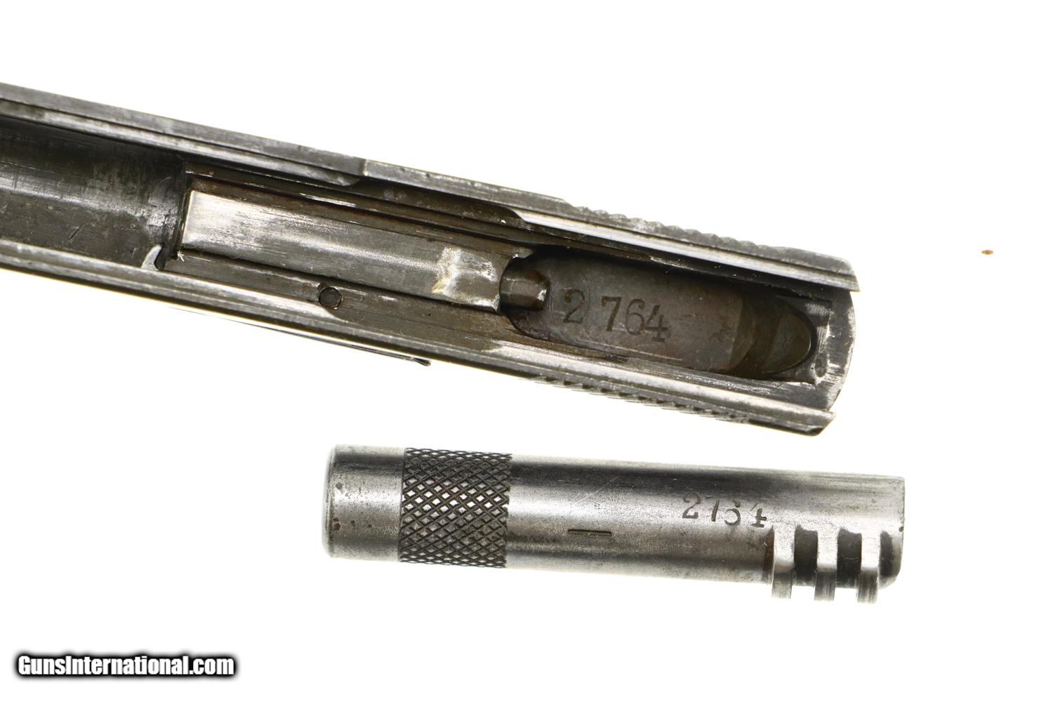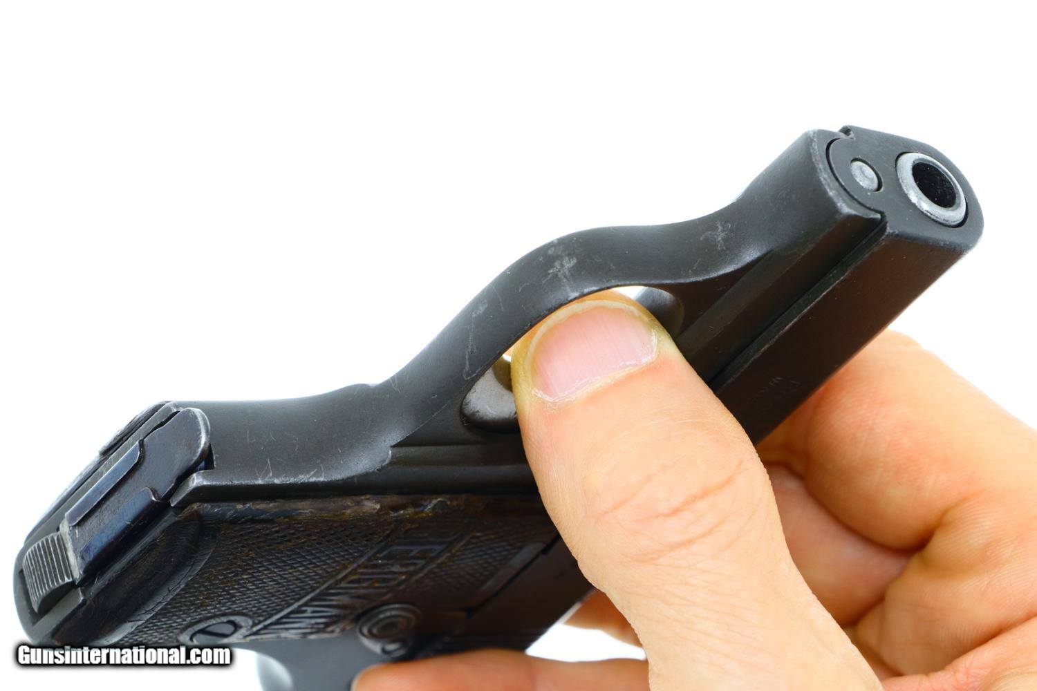Description: Conventional single action blowback pistol made by Theodor Bergmann, cal 6.35mm, designed similarly to most of the Spanish Eibar pistols, with a left tang mounted safety and bottom magazine release. Left side of slide marked with two line address. Crown/N proofing on right side of frame. Most major components blued, barrel in the white. Replacement magazine, with 6 indicator holes, is salt blued with folded lips over base. Matching slide, barrel, and frame. Synopsis: Bergmann Vest Pocket, 6.35mm, 2764, PCA-176 Condition: VG+ as redipped, now with a matte finish blue. Hard rubber grips with moderate wear, slight warpage, the left panel cracked at base as photographed. Near excellent, later era, replacement magazine. Dull pitted bore, rifling barely discernible. Pistol will cock and fire properly. SAFETY WILL ENGAGE, BUT, IF TRIGGER HAS BEEN PULLED, THE PISTOL WILL DISCHARGE WHEN THE SAFETY IS ROTATED TO THE FIRE POSITION. A scarce gun whose mechanics, as related to the safety, will need some attention to operate properly by a competent gunsmith!!!! ~~Insured shipping fee of $45; most packages shipped using FedEx 2nd Day.~~ SOLD Manufacturer: Bergmann Serial Number: 2764 Caliber Info: 6.35mm |