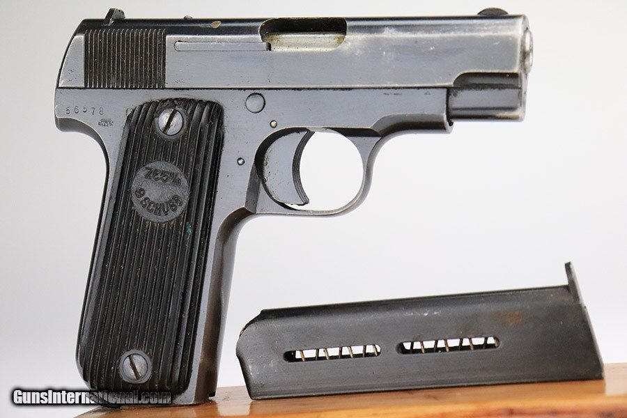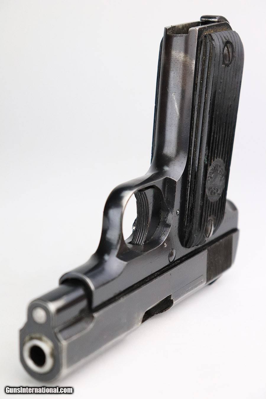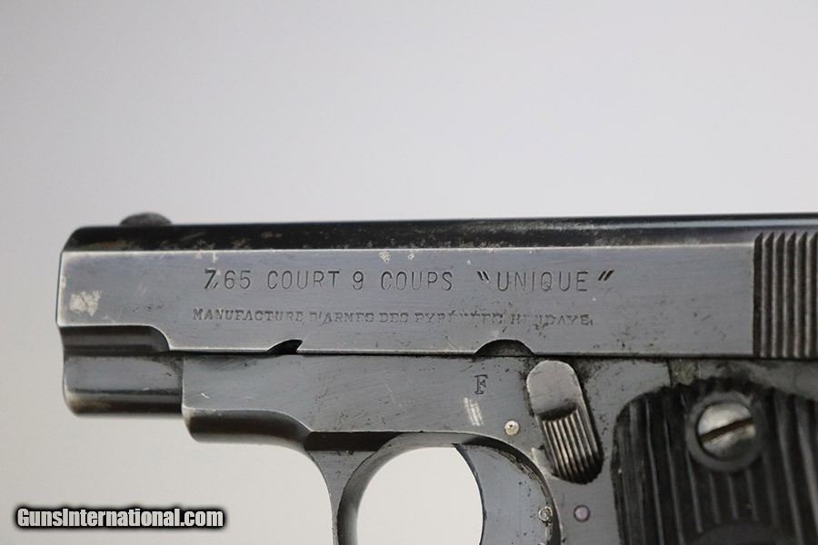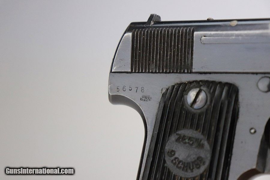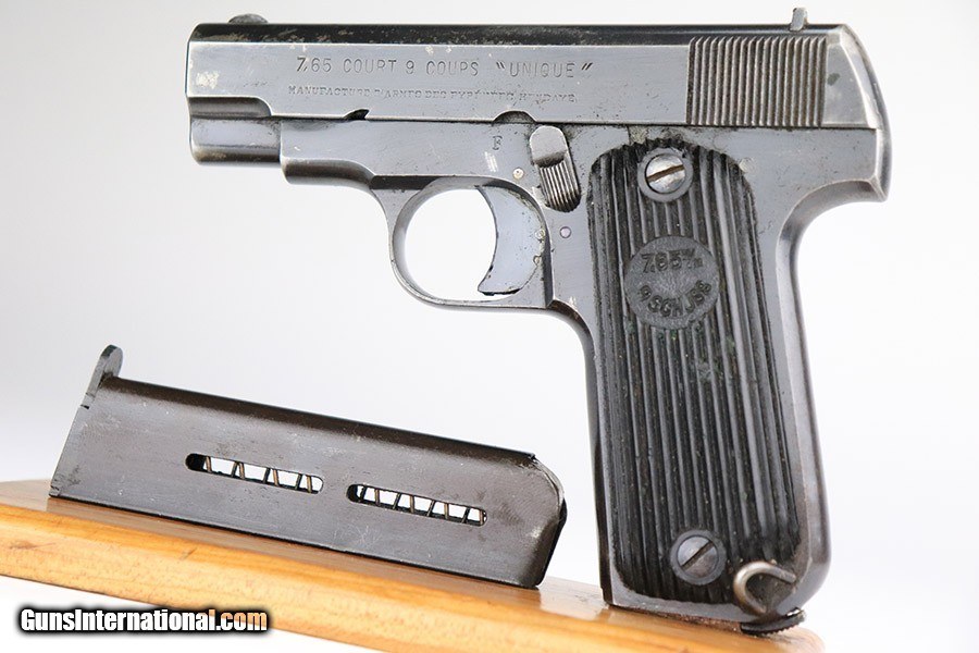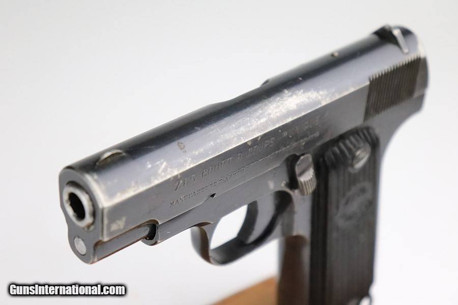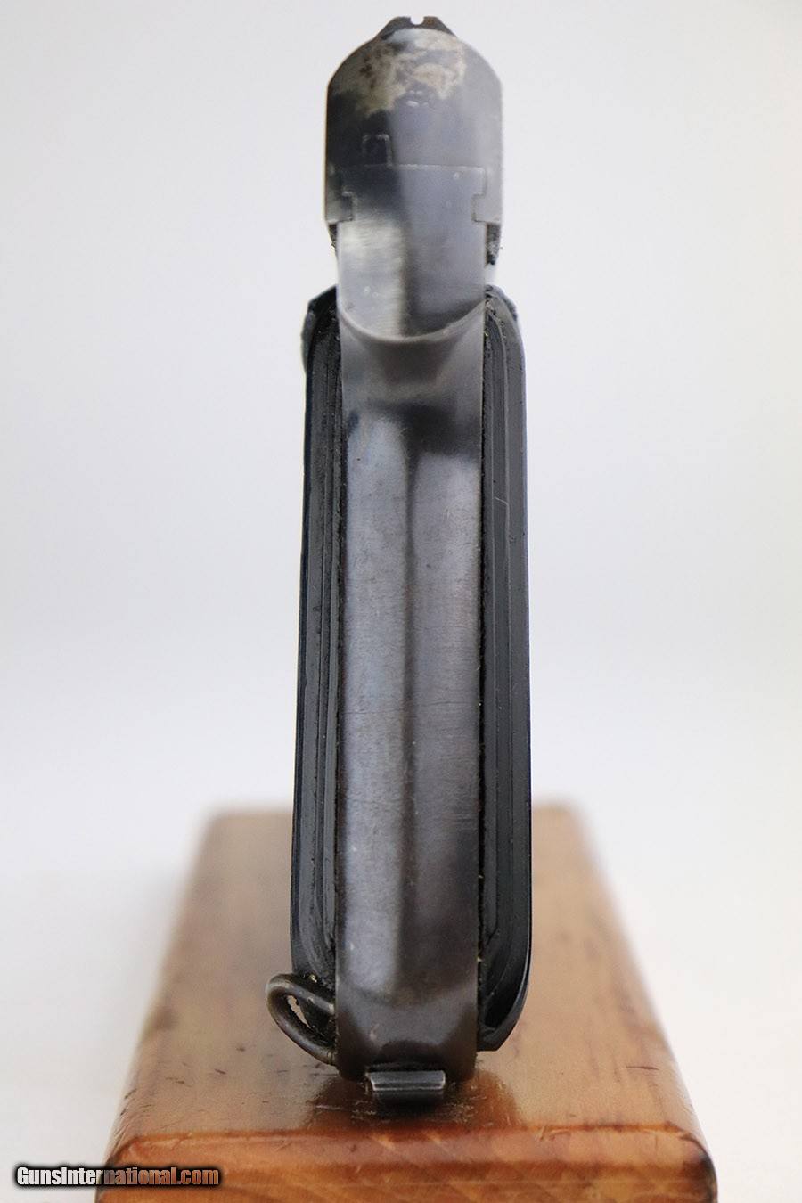 Description: This is a very nice example of a French Unique Model 17 issued to the Nazi military during WW2. It is all matching and has the proper "Waffen 251" military acceptance proof on the right side of the tang. It has retained about 90% of its original bluing. There is minor wear around the high edges in general, but most of the finish loss comes in the form of spotty discoloration along the left side and back of the slide. A couple of small spots of wear and a light scratch on the front strap. Very minor freckling on both straps. Comes with excellent period-correct black bakelite grips and one proper magazine. Excellent bore with strong rifling. SOLD Curio/Relic: Yes Handgun Caliber: 7.65x22mm Parabellum (7.65x22mm Luger, .30 Luger) |