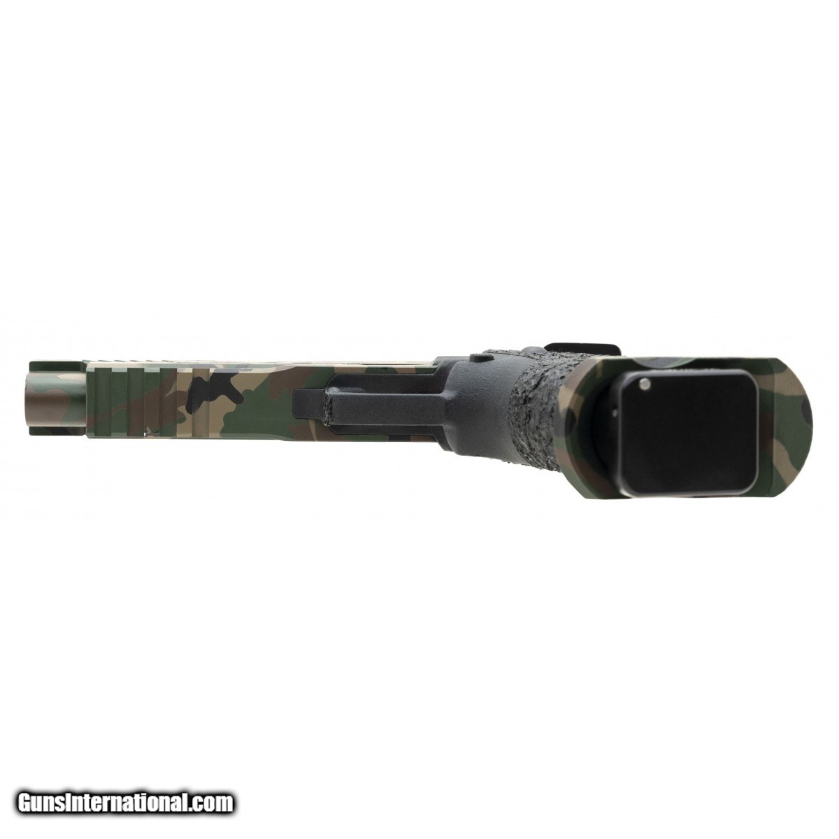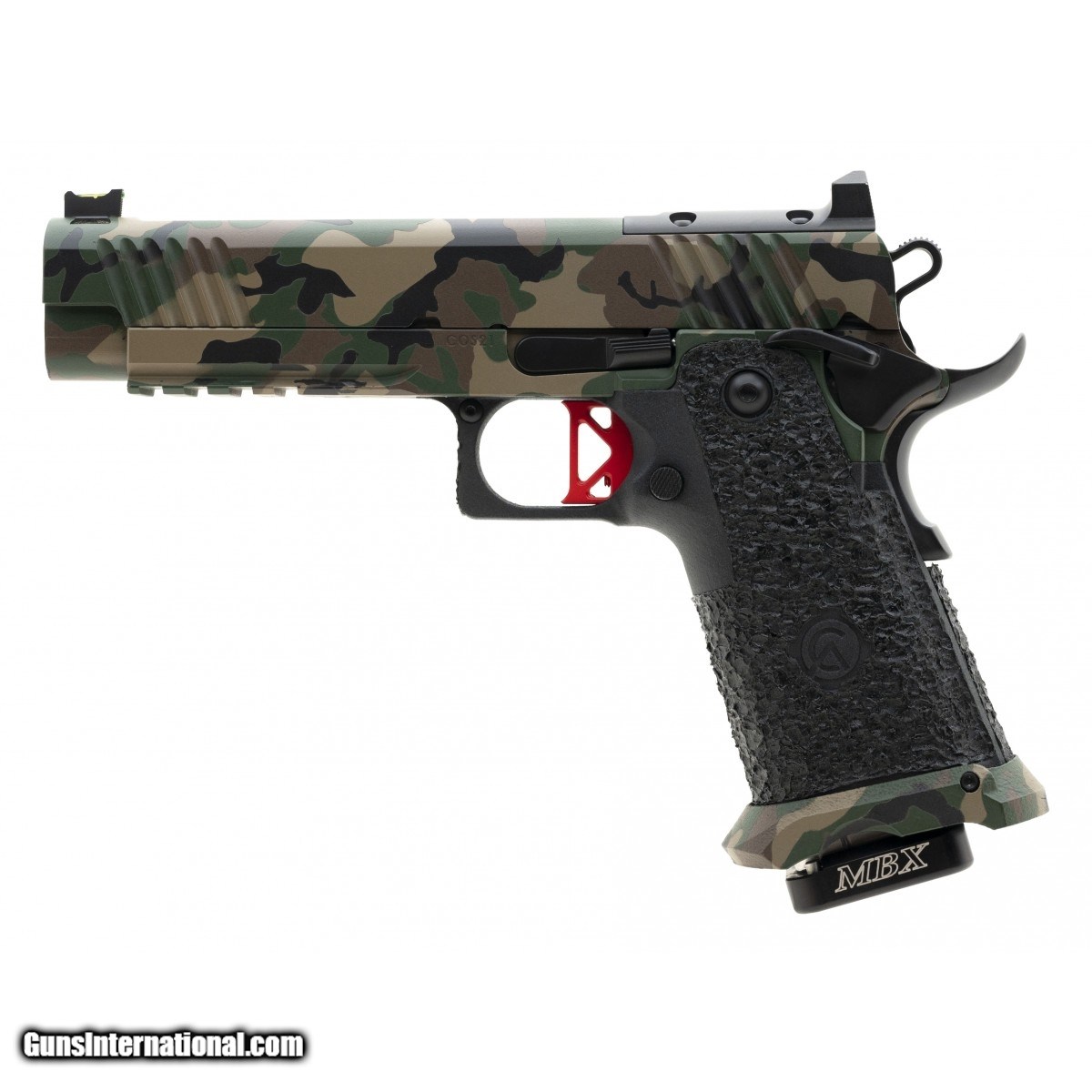 Description: " SN:D0012. 5"" full size 20RD steel framed 1911 pattern handgun with an optics ready slide and a woodland cerakote. In excellent condition. Comes with spare mag and foam filled Plano box. SOLD |