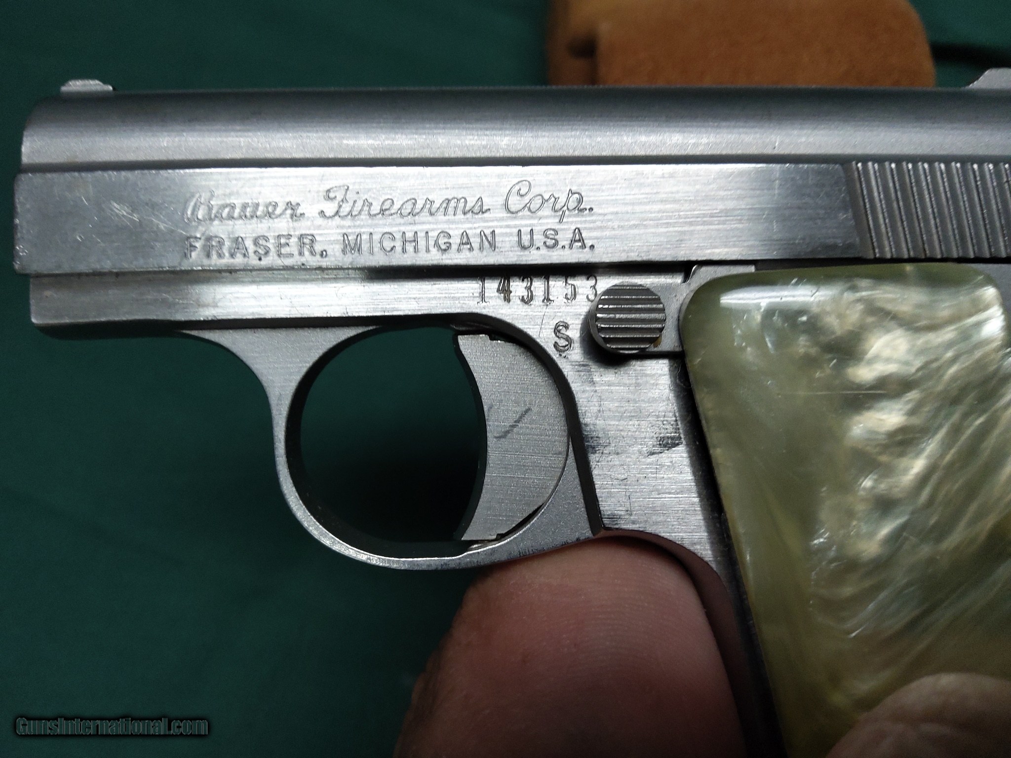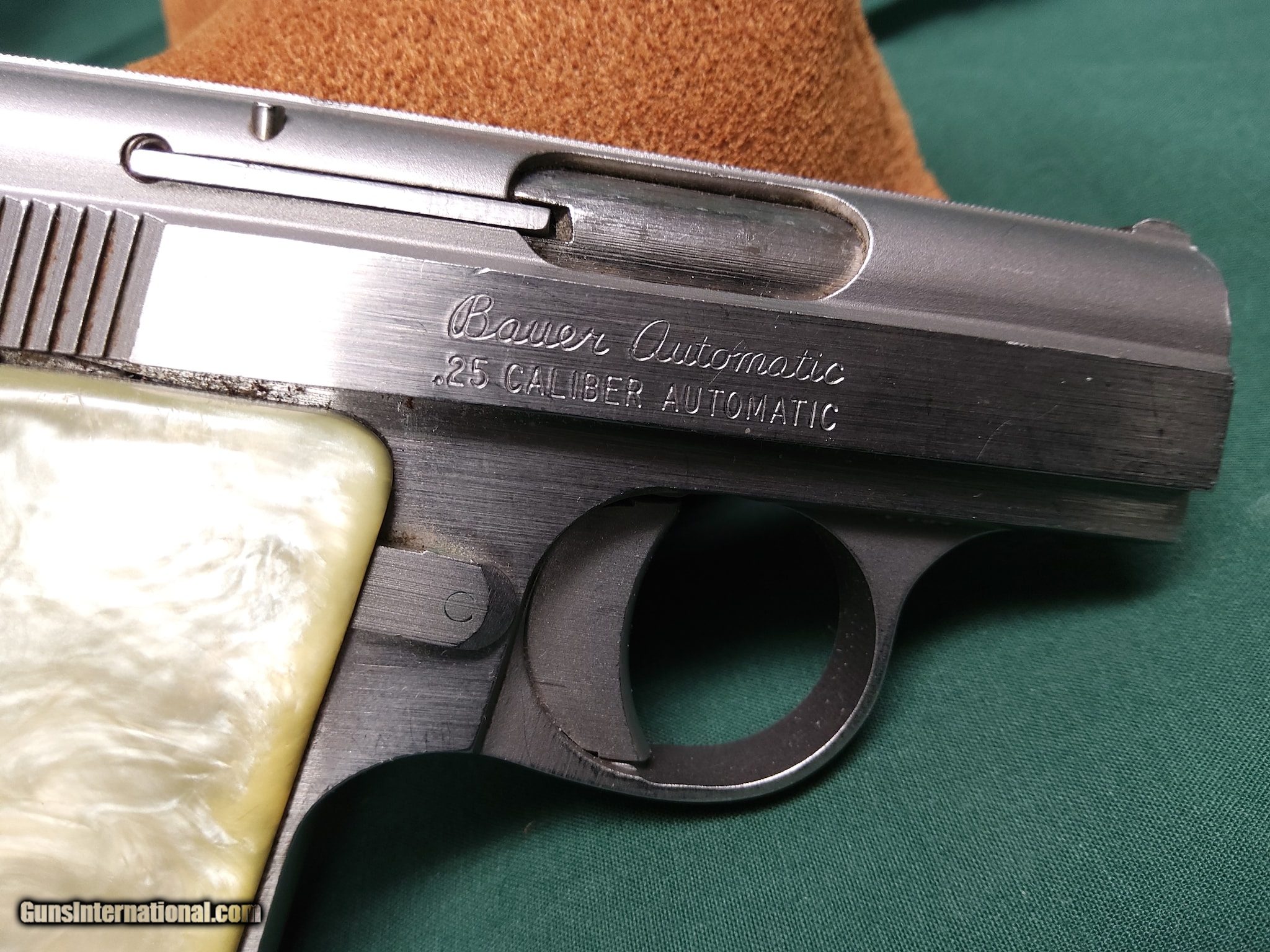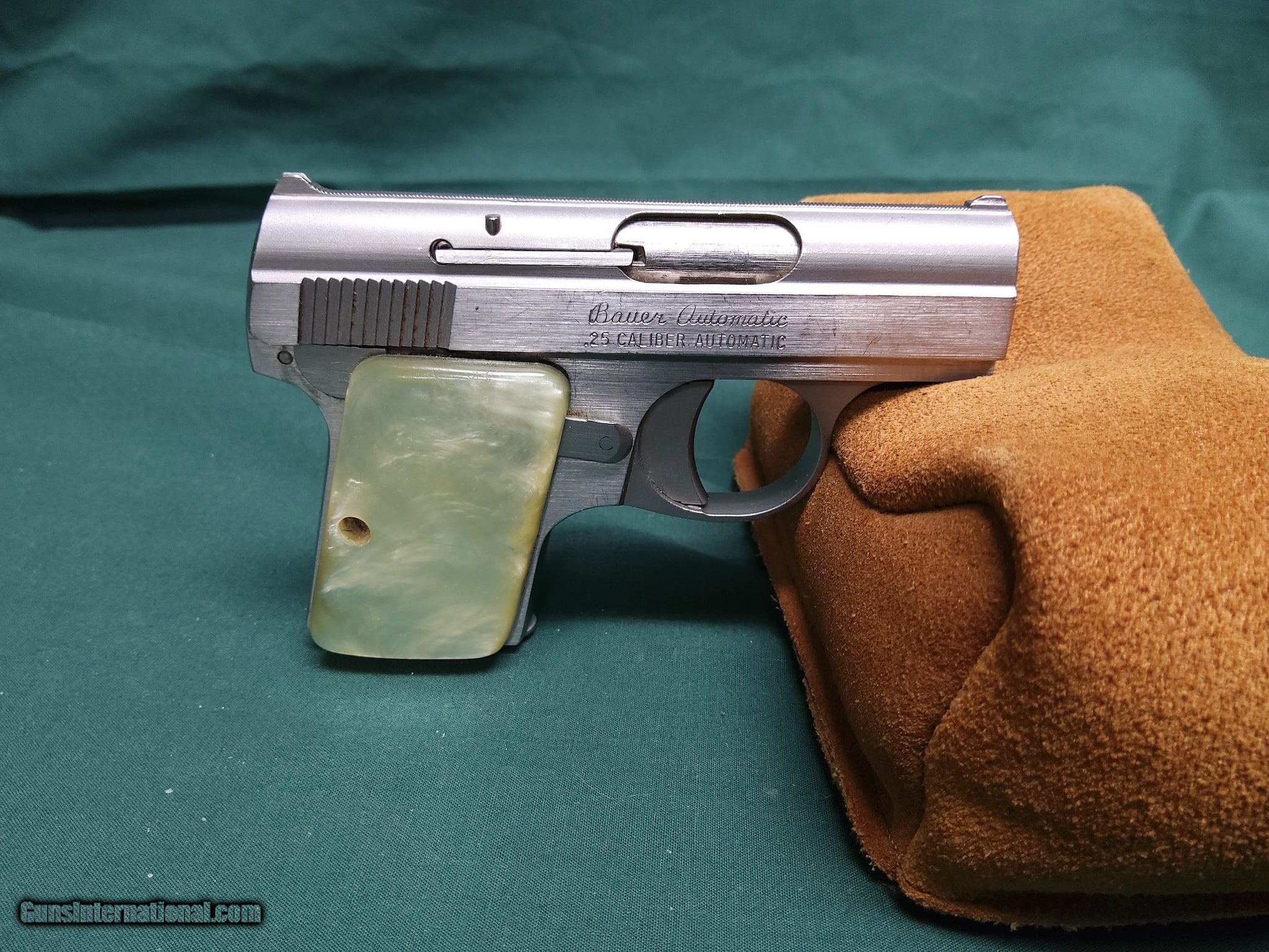 Description: Guns Listing ID: 580640 Very good pre-owned condition, Bauer 25 Automatic, 25 acp with a 6 round capacity and a 3\" barrel length. Comes with 2 extra magazines. SOLD Manufacturer: BAUER FIREARMS Model: BAUER AUTOMATIC Caliber Info: OTHER Condition: Used - Non-Certified Barrels: 3 BARREL Finish: STAINLESS |