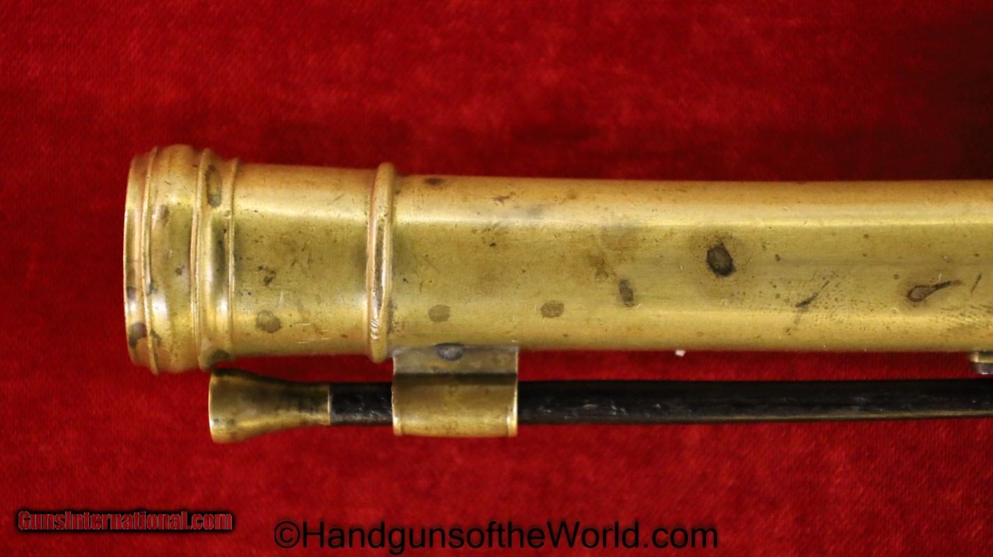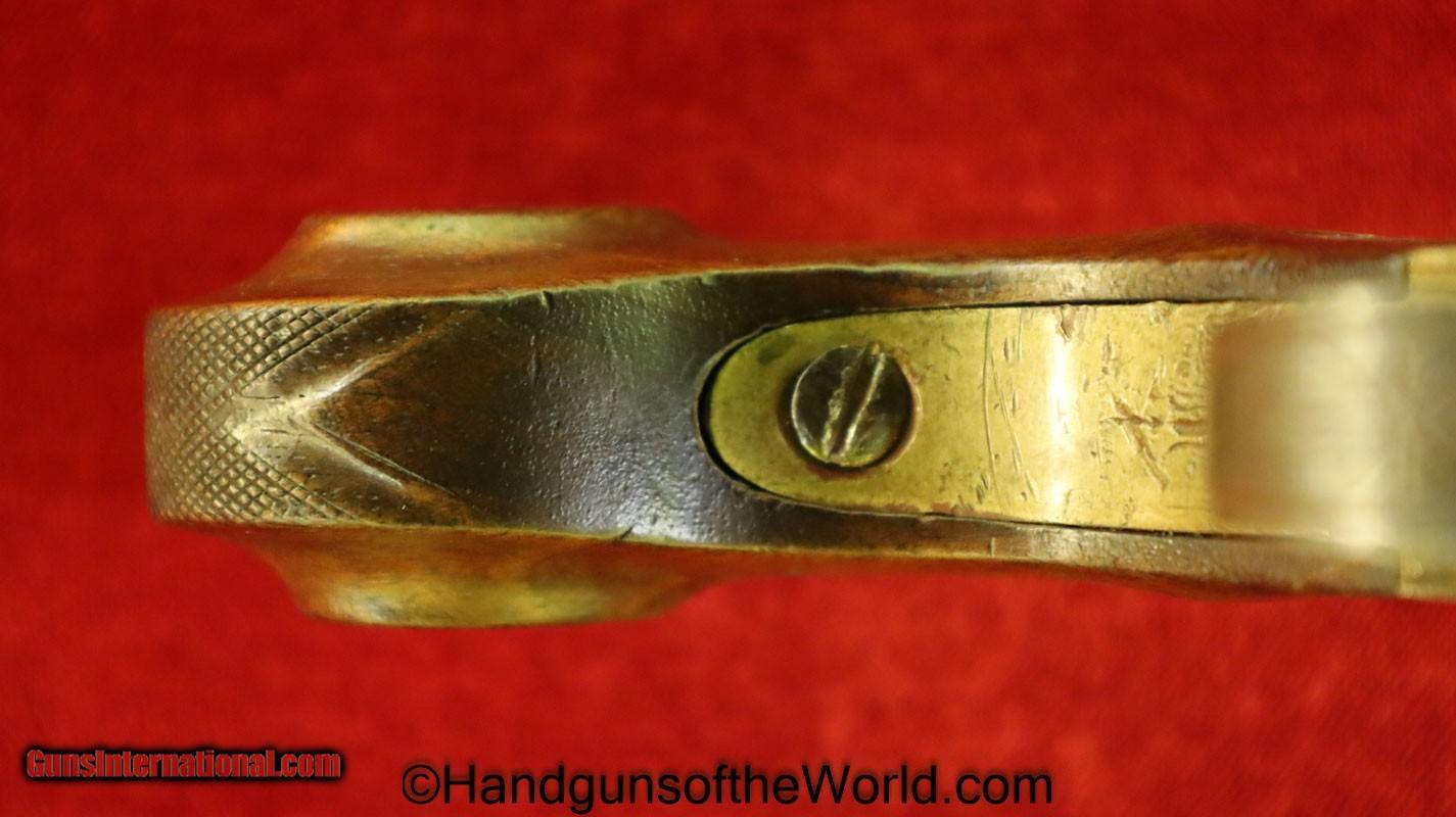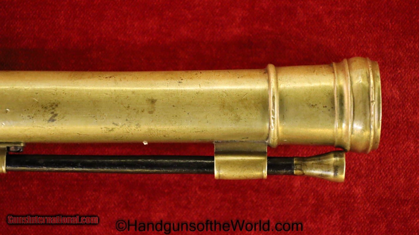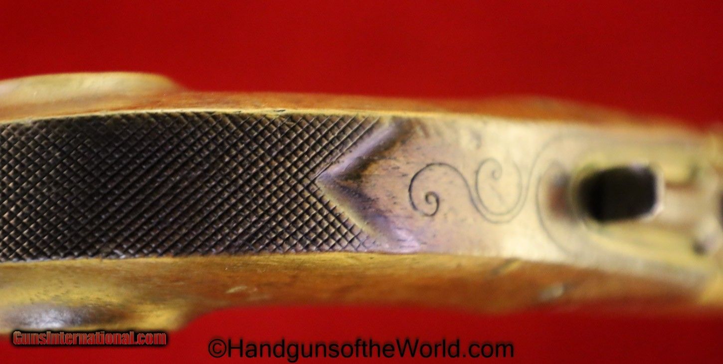 Description: Flintlock Single Shot Belt Pistol. .50 caliber. This is all brass with a cannon barrel. This has a smooth walnut grip with fine checkering on the back, along with many wire inlays. This is about 10 1/2″ overall and has an old replaced ramrod. This well made, likely USA built pistol has the sliding Frizzen lock, and is VG-VG+ overall. This works Fine. Antique. Antique: Yes Handgun Caliber: .50 Manufacturer: Flintlock Model: Single Shot Price: $1,375.00 Shipping: $35.00 Contact Seller |