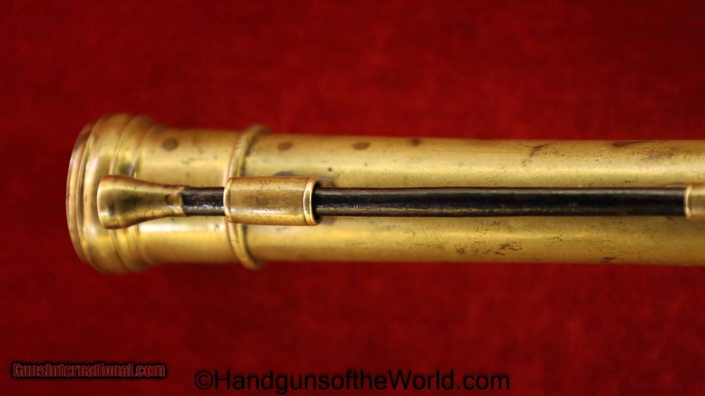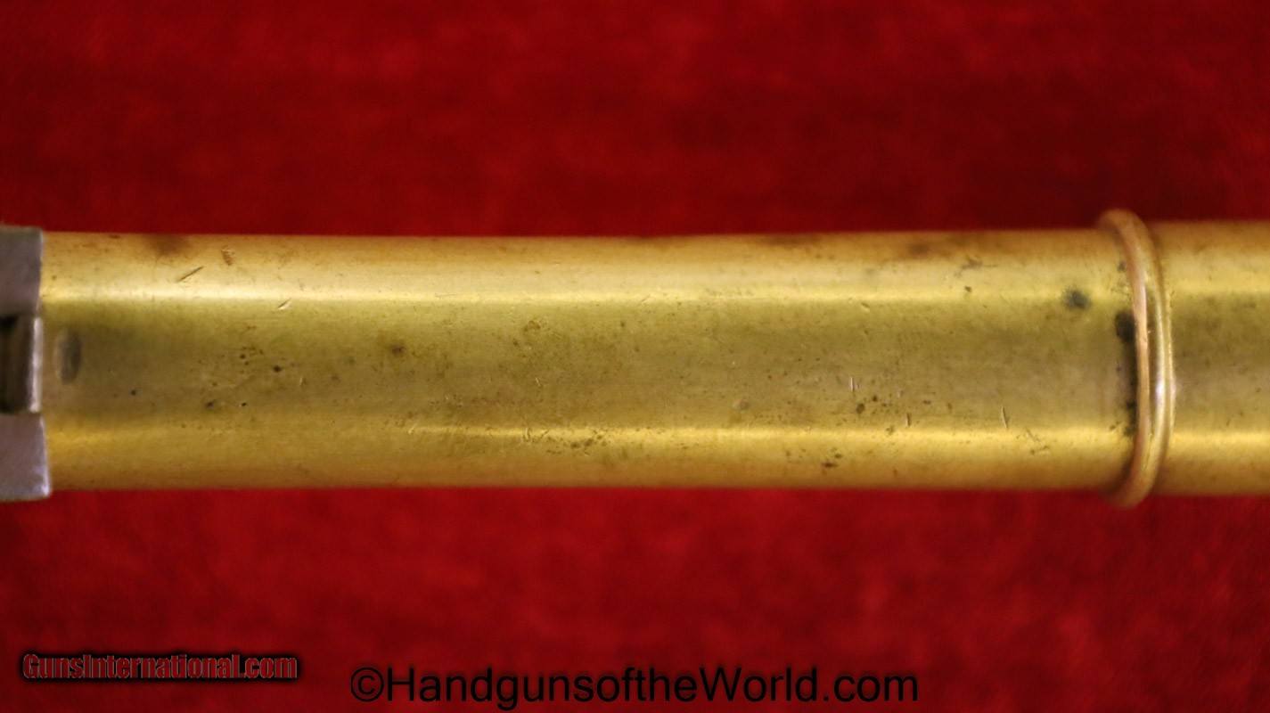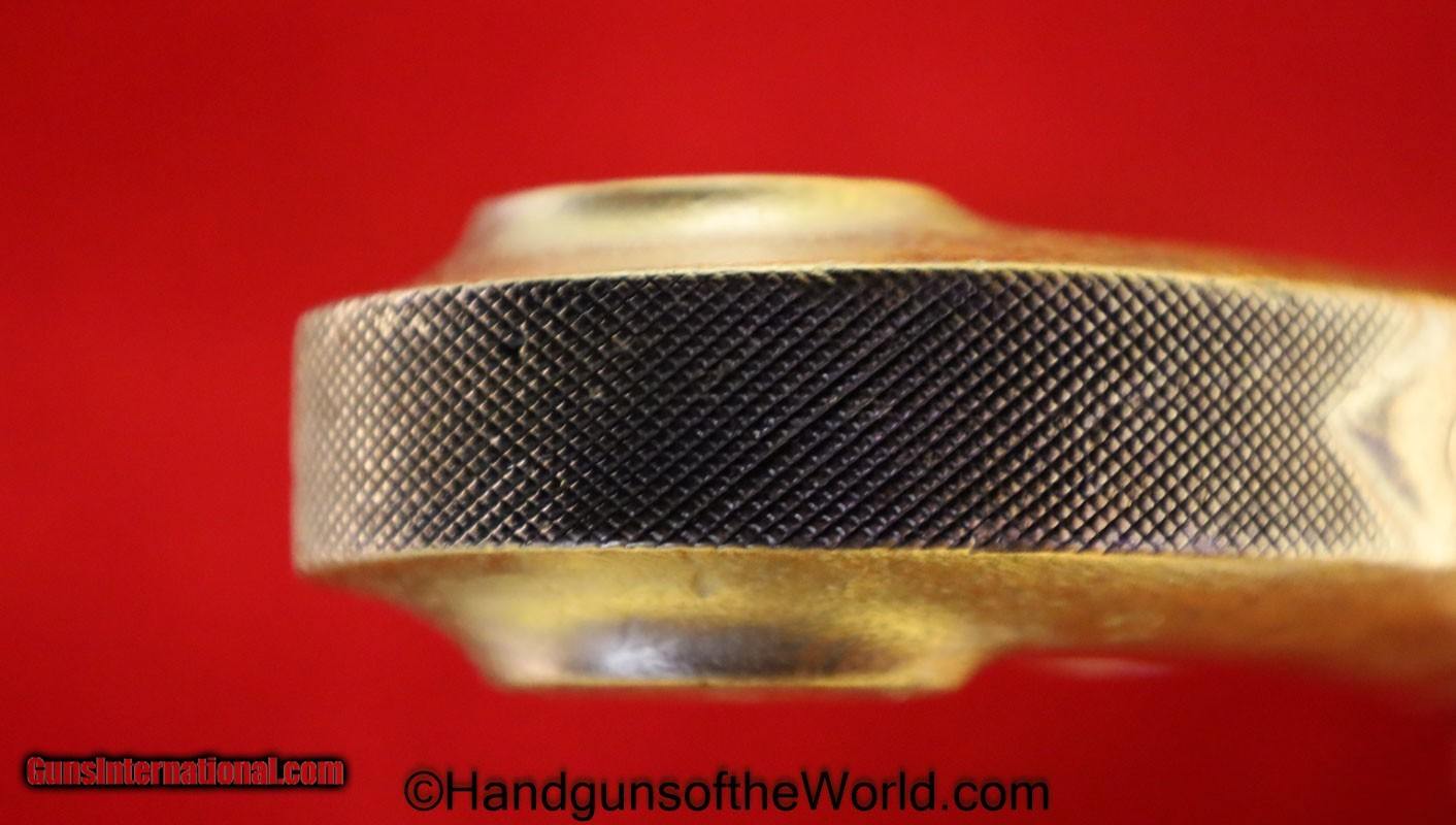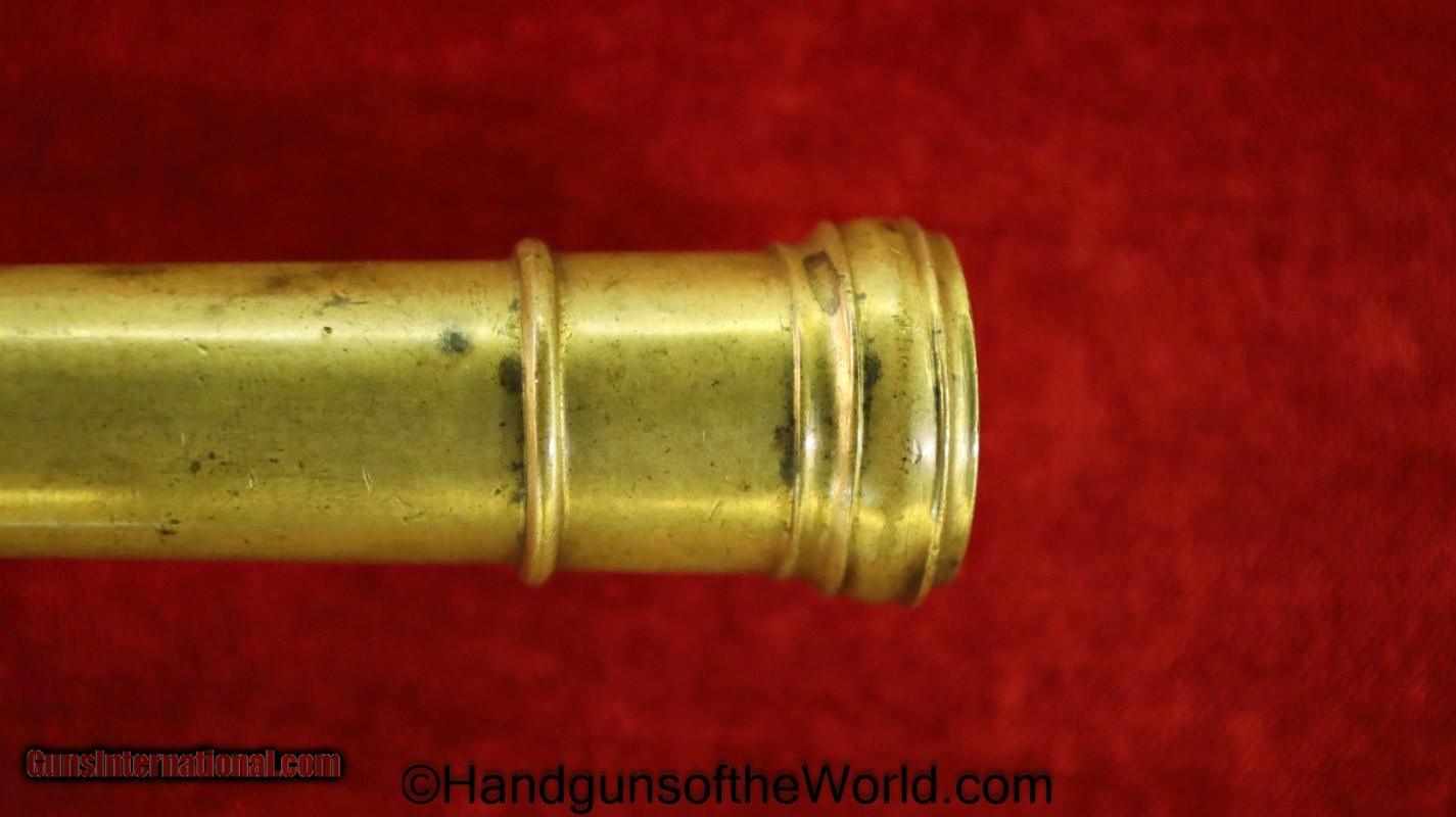 Description: Flintlock Single Shot Belt Pistol. .50 caliber. This is all brass with a cannon barrel. This has a smooth walnut grip with fine checkering on the back, along with many wire inlays. This is about 10 1/2″ overall and has an old replaced ramrod. This well made, likely USA built pistol has the sliding Frizzen lock, and is VG-VG+ overall. This works Fine. Antique. Antique: Yes Handgun Caliber: .50 Manufacturer: Flintlock Model: Single Shot Price: $1,375.00 Shipping: $35.00 Contact Seller |