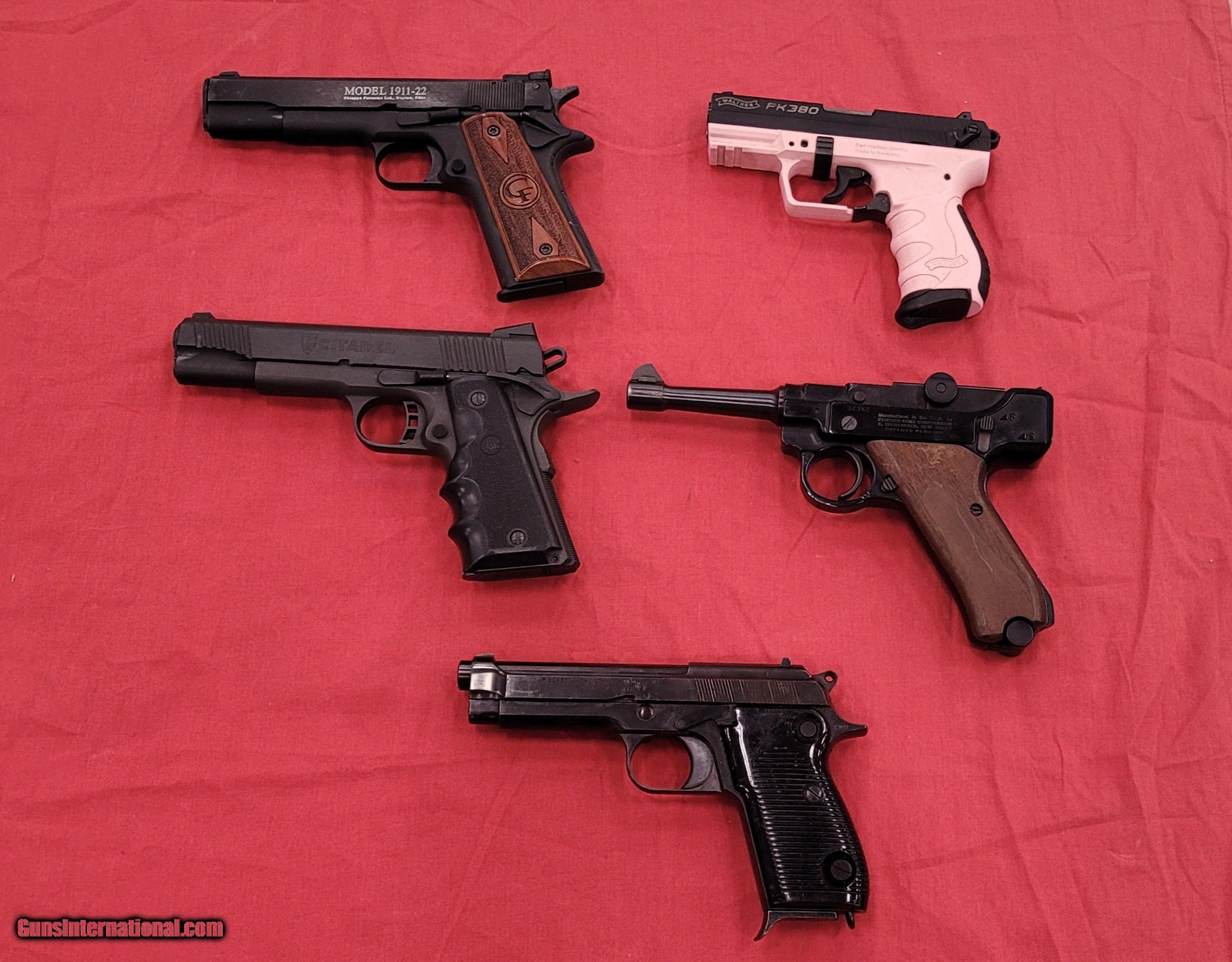 Description: Another great item from Gainesville Pawn! Up for sale is a five gun lot featuring a Walther PK380 chambered in 380, Beretta Model 1951 chambered in 9mm, Chiappa model 1911-22 chambered in .22LR, Citadel Model 1911-A1 FS chambered in 9mm and a Stoger Arms Luger chambered. 22LR. ALL FIVE GUNS FOR ONE PRICE. Each gun comes with one magazine. The overall condition of the guns in this lot is Very good, showing some signs of wear. The bores of these guns are good with strong rifling. Please see photos for more detail. *Please be aware that all items are sold “AS IS”. Ask questions BEFORE buying. Feel free to call us at our store (352) 240-6452 or email us at Gainesvillepawngmail with ANY questions. We do not accept trades or offers through through Guns International We only entertain trades and offers through our store. $35 shipping and handling. Insurance extra. We only accept USPS money orders and major credit cards for payment. 3% convenience fee for credit cards. WE collect Florida state sales tax for in state sales. Please be aware that this item is for sale in our store as well as the occasional gun show so it may be sold there at any time. YOUR DEALER MUST EMAIL US A SIGNED COPY OF THEIR FFL TO gainesvillepawn(at)gmail(dot)com BEFORE WE SHIP ANY FIREARM SOLD Handgun Caliber: .22 Long Rifle, 9x19mm Parabellum (9mm Luger, 9x19mm NATO), .380 ACP (9x17mm Browning Short) Manufacturer: Walther, Chiappa, Citadel, Beretta & Stoeger Arms Model: PK380, 1911-22, 1911-A1 fs, 1951 & Luger Condition: Very good Metal Condition: Very good Wood Condition: Very good Bore Condition: Good |