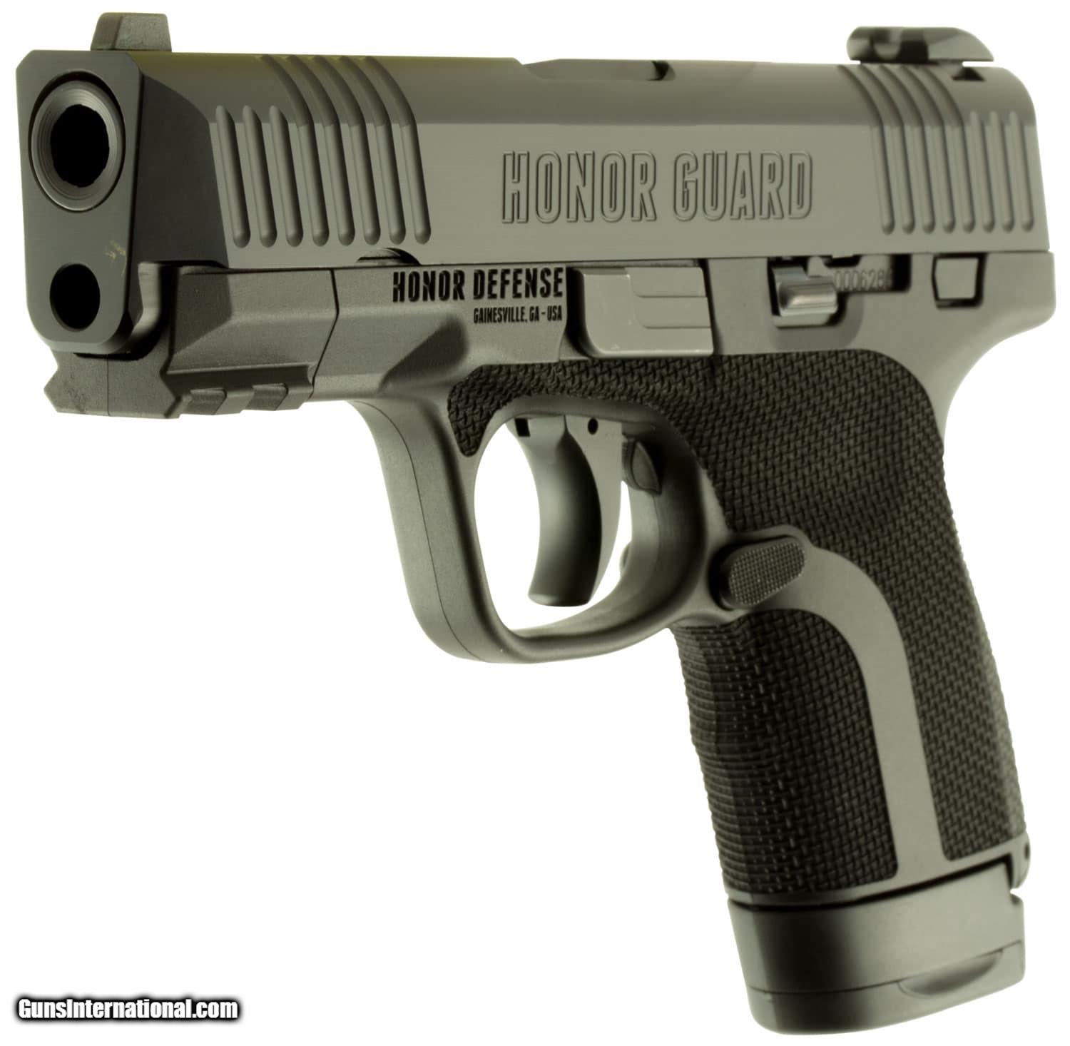 Description: Guns Listing ID: 441452 Honor Defense Honor Guard Sub-Compact pistols are sized to be the perfect carry companion at 4.6\" in height and 9mm +P rated. It features a custom designed grip with an advanced texture for better control, serrations going over the top of the slide for easier racking, snag-free sights that won‚‚t catch on clothes when drawing the pistol, and a short, crisp trigger with a short re-set for more accurate shooting. No trigger pull or tool is needed for disassembly. Honor Guard pistols have an ambidextrous slide catch and ambidextrous magazine release, as well as two (2) backstrap sizes to customize the fit. It has a black polymer frame with stainless steel modular chassis. The stainless steel barrel and slide have a black ferric nitro-carburized finish. It includes two (2) magazines (7-round and 8-round). Honor Defense is 100 percent made in the USA and assembled by veterans. This long slide model features an accessory rail and weighs in at just 25 ounces with a 3.8\" barrel for 6.8\" overall length SOLD Manufacturer: HONOR DEFENSE Model: HG9 SC LS Caliber Info: 9MM LUGER (9X19 PARA) Condition: new Barrels: 3.8 BARREL Finish: BLACK |