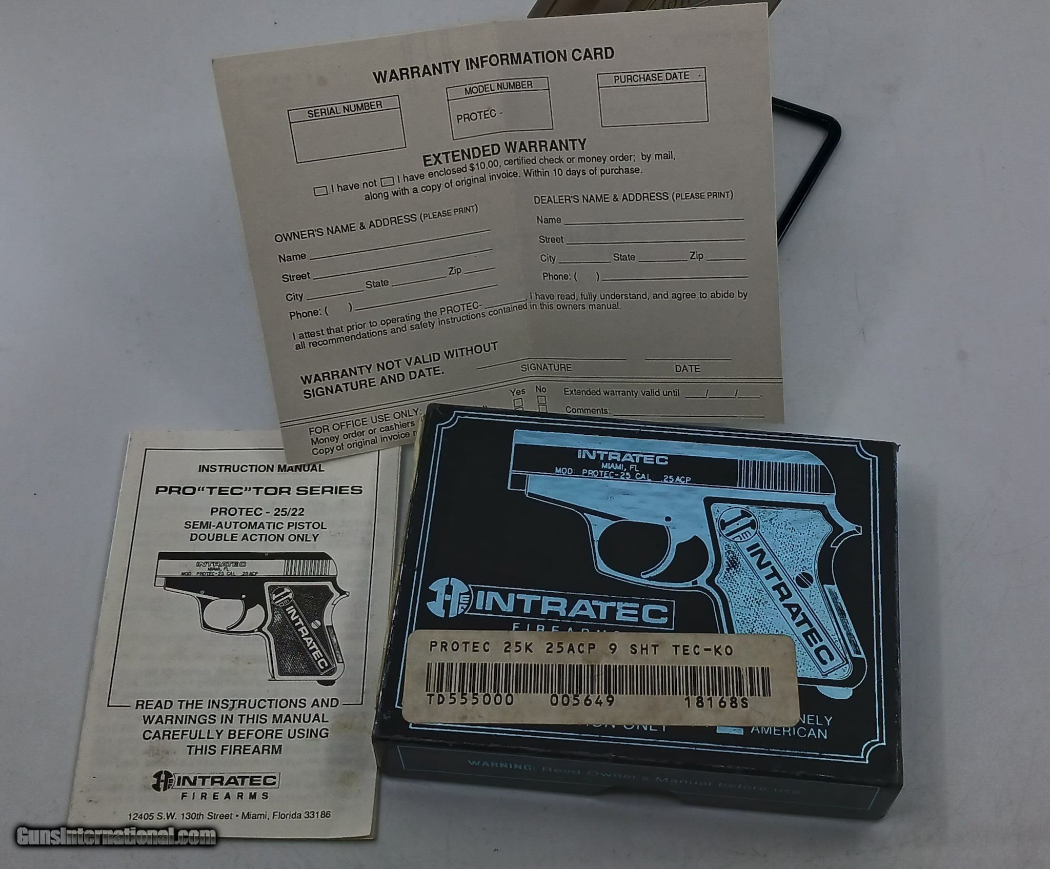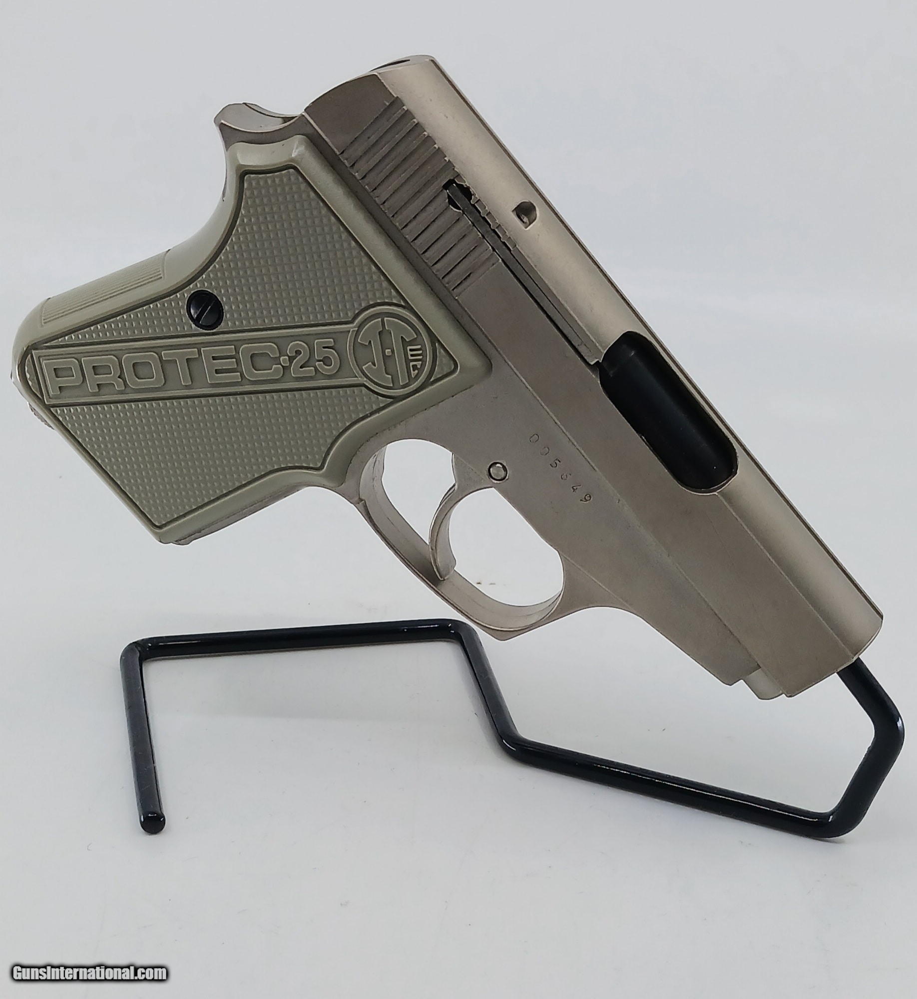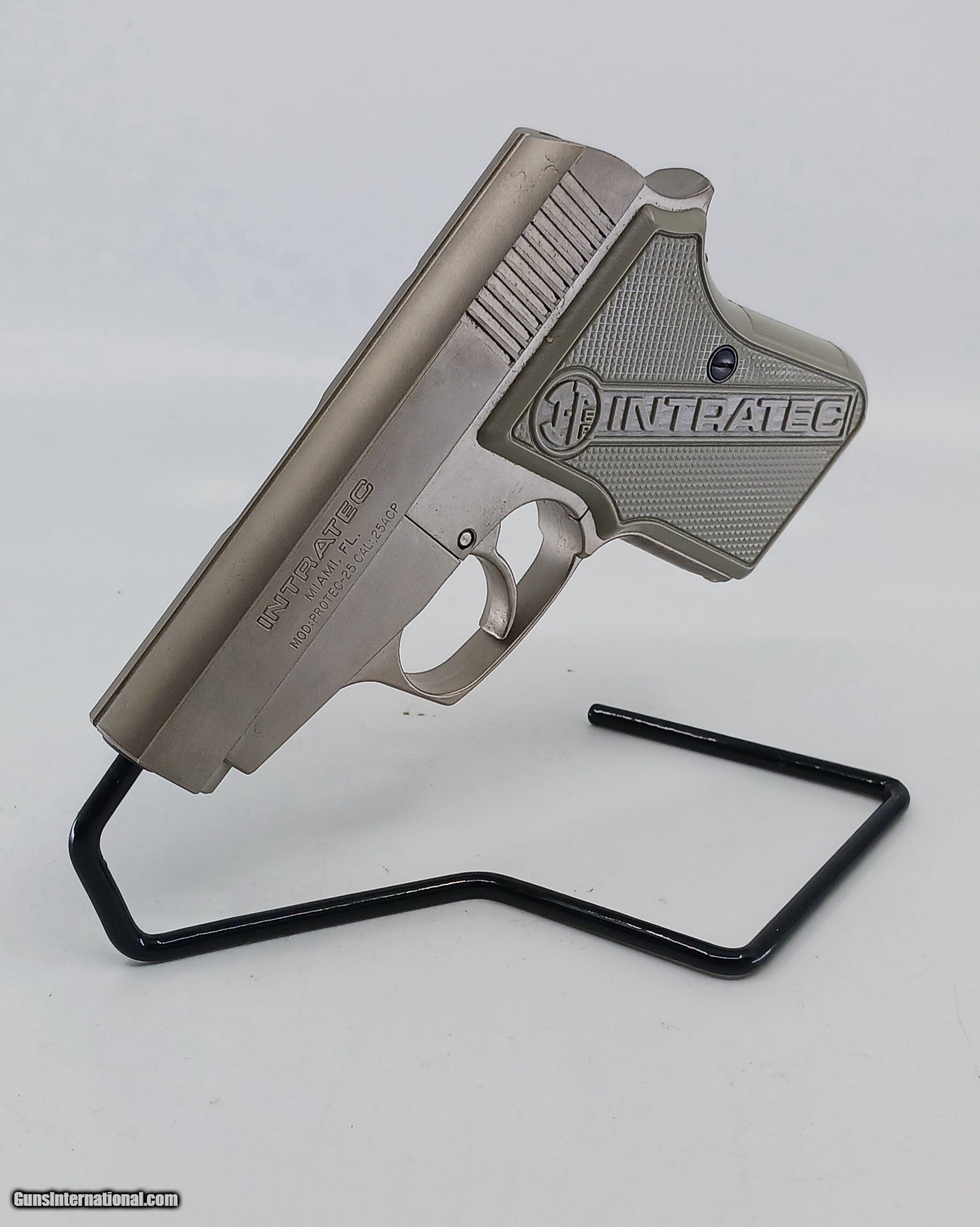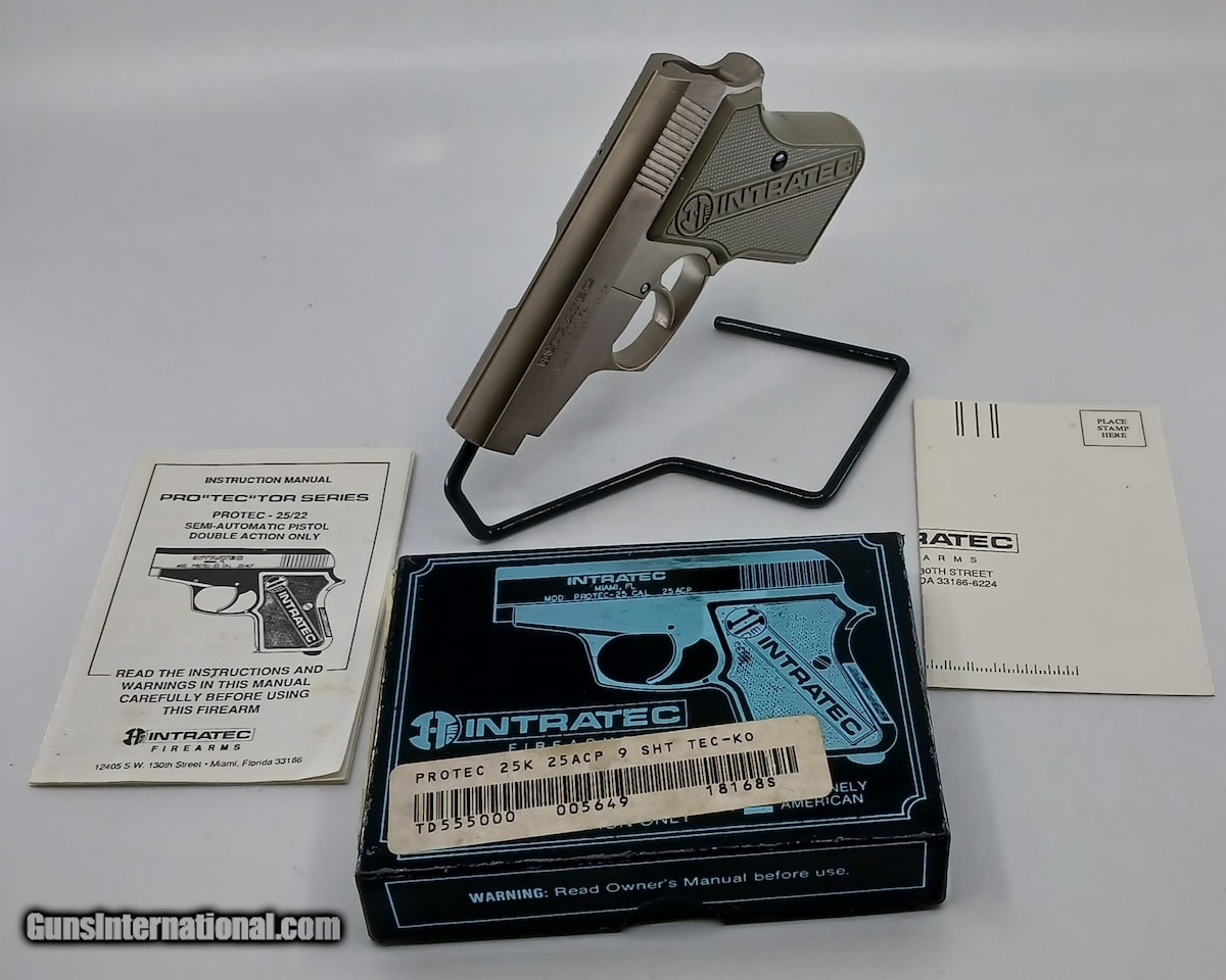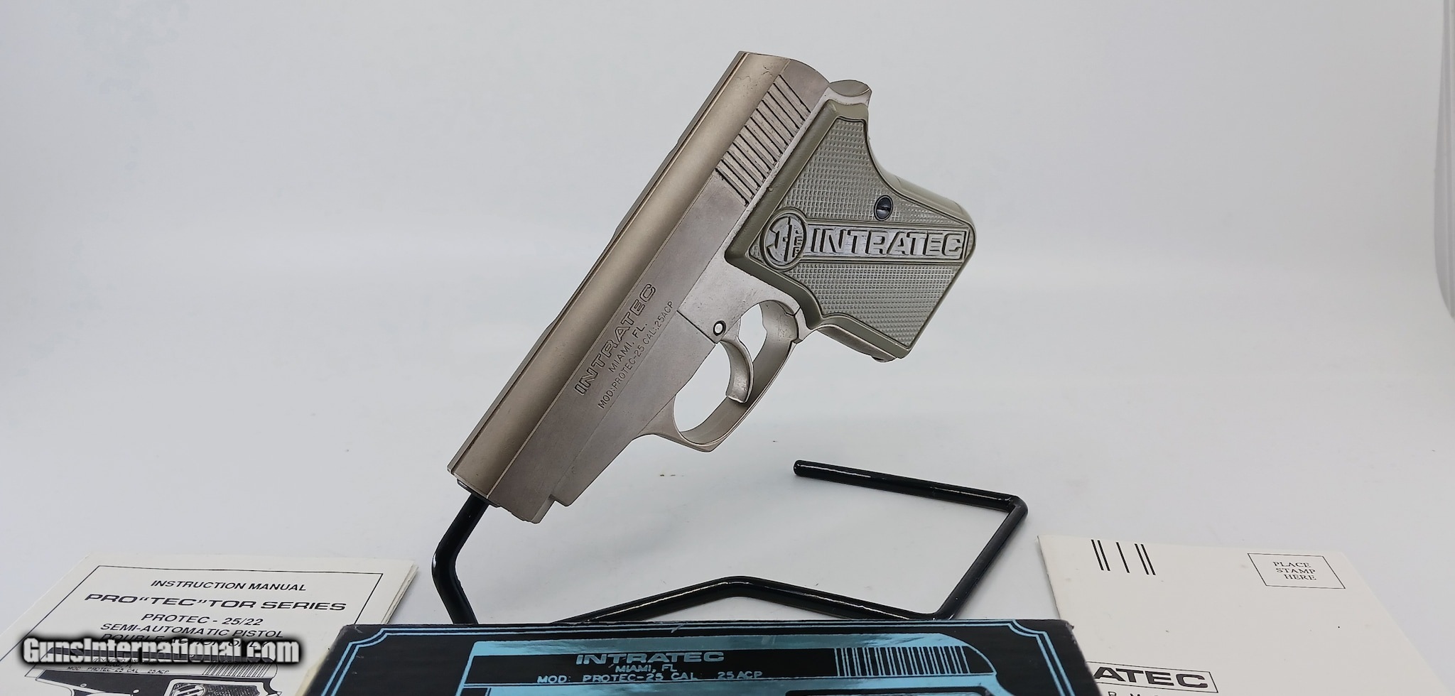 Description: Guns Listing ID: 490154 The .25ACP auto 8 shot Intratec Protec-25B. (Double action only) made in America this is a collector gun and will only go up in value. SOLD Manufacturer: INTRATEC Model: protec-25 Caliber Info: 25 ACP Condition: Used - Non-Certified Barrels: 2.5 BARREL Finish: STAINLESS |