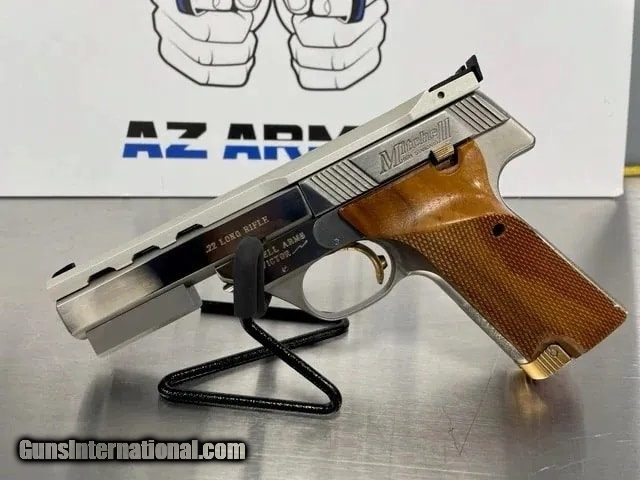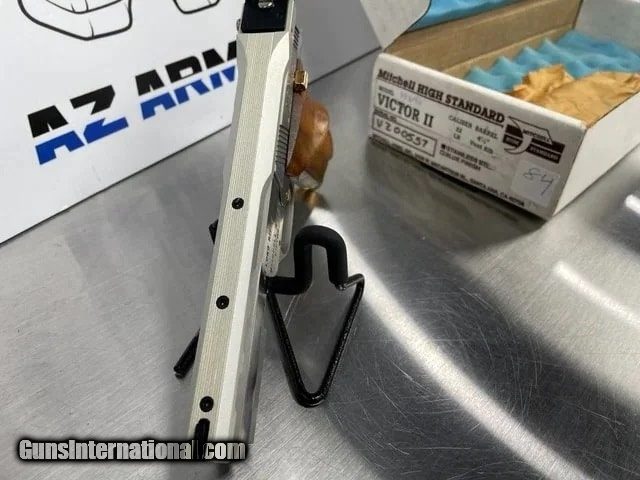 Description: Guns Listing ID: 719489 This is preowned and unfired new. Year of Manufacture: 1994-1996 Caliber: .22 Long Rifle Action Type: Single Action Semi-Automatic with Removable Magazine Markings: The left and right sides of the barrel are marked “.22 LONG RIFLE”. The left and right sides of the slide are marked “Mitchell / HIGH STANDARD”. The left side of the frame is marked “MITCHELL ARMS / VICTOR” and the right side of the frame has a “Pi” logo and “MADE IN U.S.A. / FORT WORTH, TEXAS / Barrel Length: 4 ½” Sights / Optics: The front sight is an undercut Patridge blade mounted on a ventilated rib. The rear sight is matte black finish square notch Target sight that is adjustable for windage and elevation. Type of Finish: Stainless Steel Finish Originality: All Original Bore Condition: The bore is bright and the rifling is sharp. There is no erosion in the bore. Has counter weight on it. SOLD Manufacturer: MITCHELL ARMS Model: VICTOR Caliber Info: .22 LR Condition: Used - Non-Certified Barrels: 4.5 BARREL |