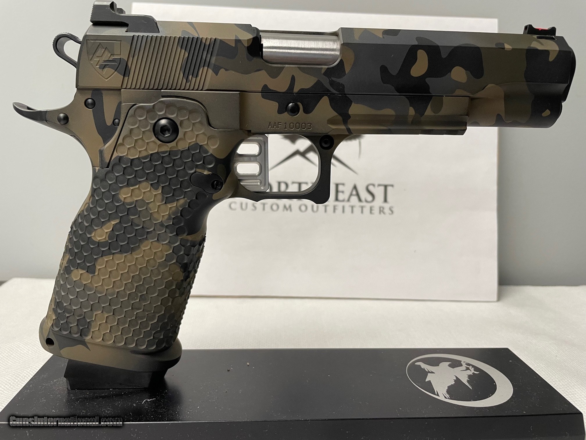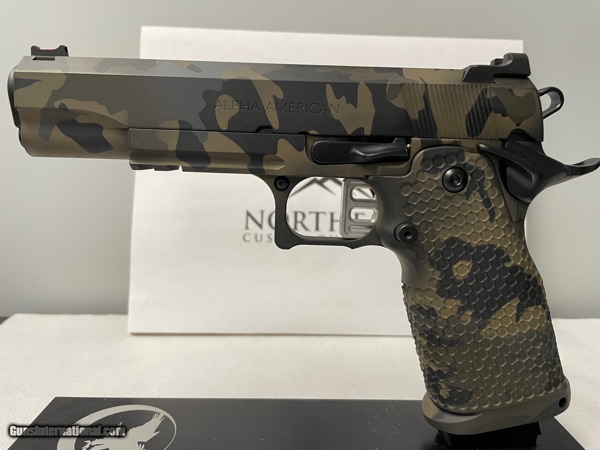 Description: ************* NEW ALPHA AMERICAN FIREARMS 9mm PISTOL***************** Company started by Tim Anderson (Master Gunsmith) who worked at Nighthawk Custom for 13 years. ALPHAAMERICANFIREARMS Serial # AAF10003 (the first production model in this finish) Camo Cerakote finish by Hillbilly 223 5-inch Barrel Tri Cut Slide Recon Rail Red Fiber Optic front sight Heinie Fixed Black rear sight 9mm Double Stack ALL STEEL HI-CAP FRAME (most manufactures have an aluminum alloy frames) Aggressive "Outlaw" textured grip Skeletonized Flat Trigger Comes with 1 17rd Mag Custom soft carry case SOLD |