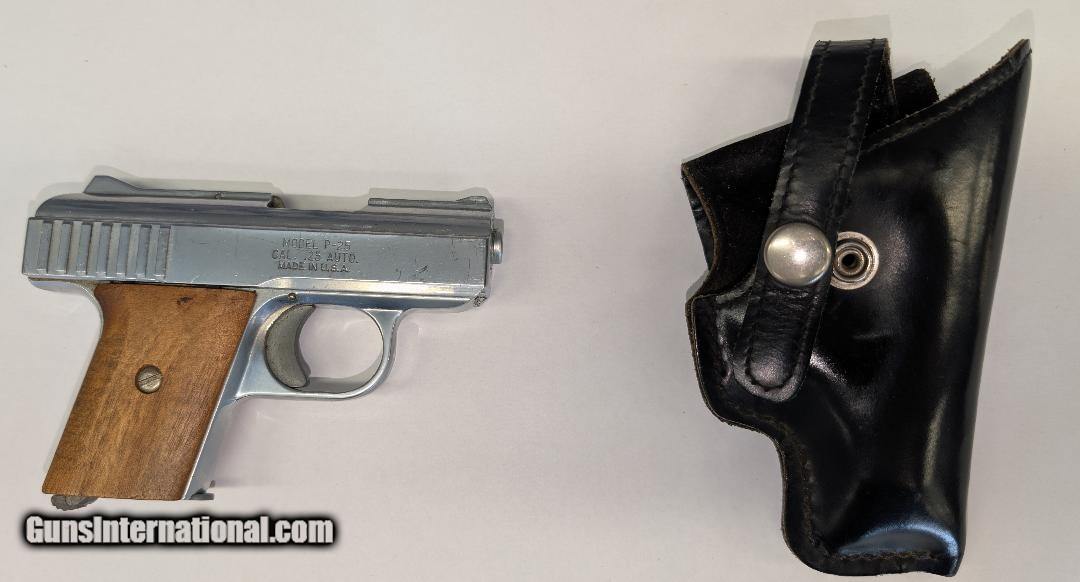 Description: Guns Listing ID: 554070 RAVEN P-25 Gun Specifications Type: Pistol Caliber:.25 Auto Action: blowback operated semi-auto Trigger: single-action (SA) Safety: frame mounted safety Magazine:6-round Frame: alloy frame Grip: walnut Sights: blade front, notch rear Notes: nickel finish, Right Handed OWB Holster SOLD Manufacturer: RAVEN ARMS Model: p-25 Caliber Info: .25 ACP Condition: Used - Non-Certified Barrels: 2 BARREL Action: SEMI AUTOMATIC Finish: nickel |