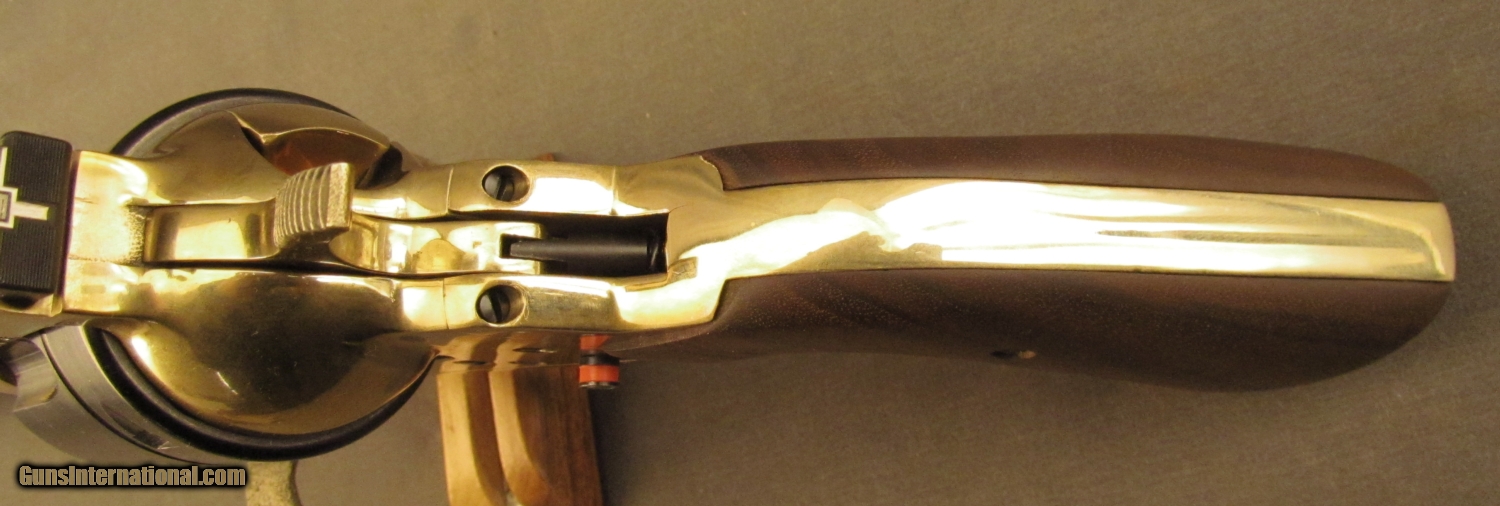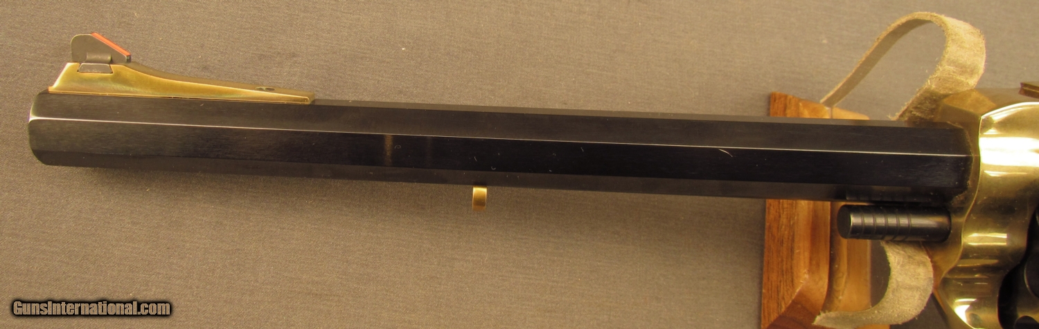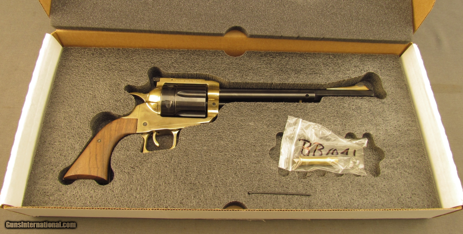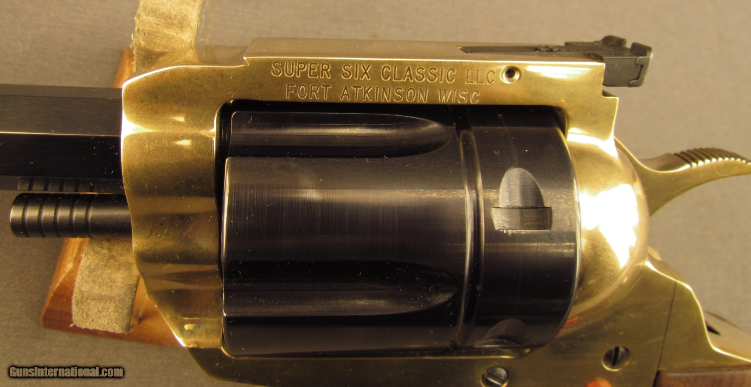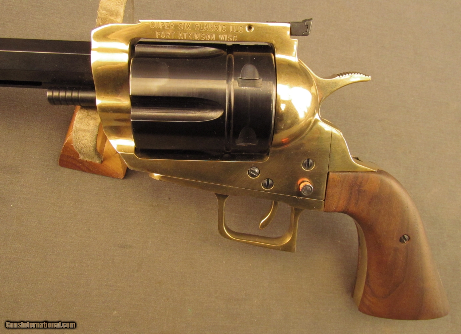 Description: S#BB1041, 45-70, 10 inch barrel, bright excellent bore. This massive, six pound three ounce (empty) revolver remains in excellent condition with 98% blue showing the beginning of a turn line on cylinder. The manganese bronze frame is starting to develop a darker patina. Two tiny hairline cracks show on rear grip strap on either side of hammer slot (see photos). Grips show no blemishes, grip screw has minor slot damage. This comes in the original box with instruction manual, Allen wrench and a fired case. This rather large revolver should get lots of attention at the range. FFL SOLD Manufacturer: Super Six Classic Model: Bison Bull Serial Number: BB1041 Caliber Info: .45-70 Gauge Info: .45-70 |