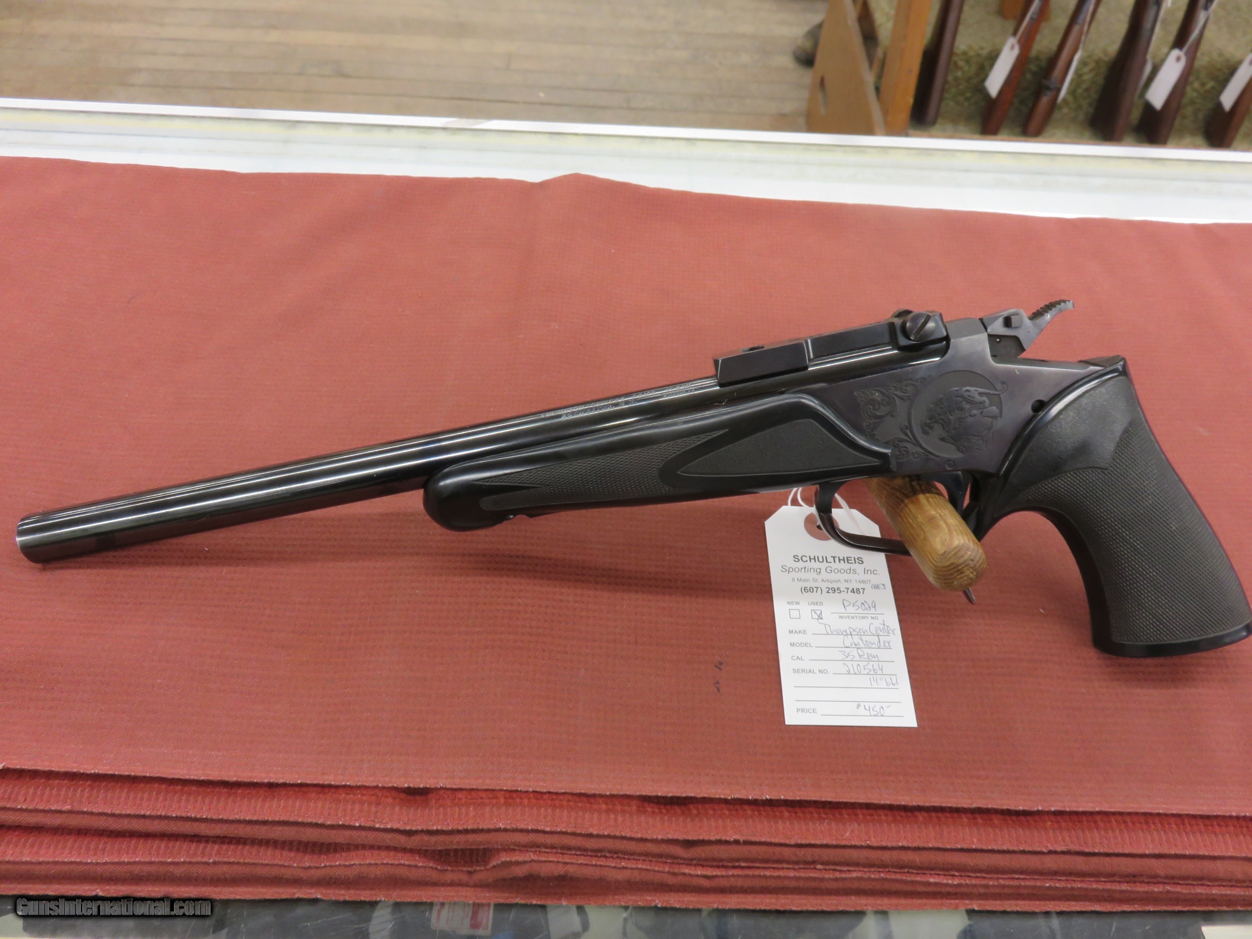 Description: Thompson Center Contender Super 14, 35 rem., #210XXX, Pachmayr grips & forearm, Leupold scope base, 95% blue, slight edge wear, the forearm was made for the 10" barrel and has an extra hole in it. SOLD |