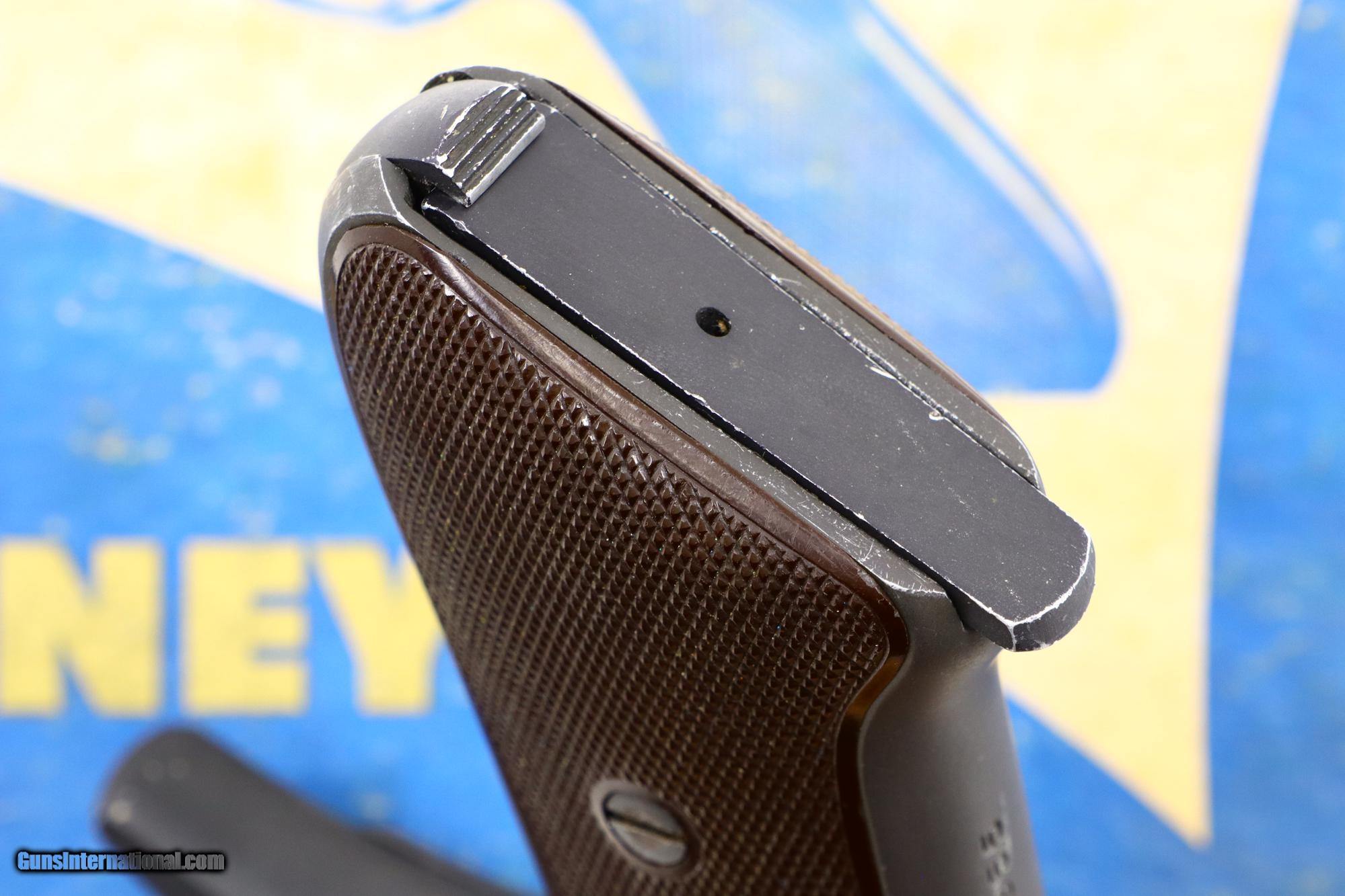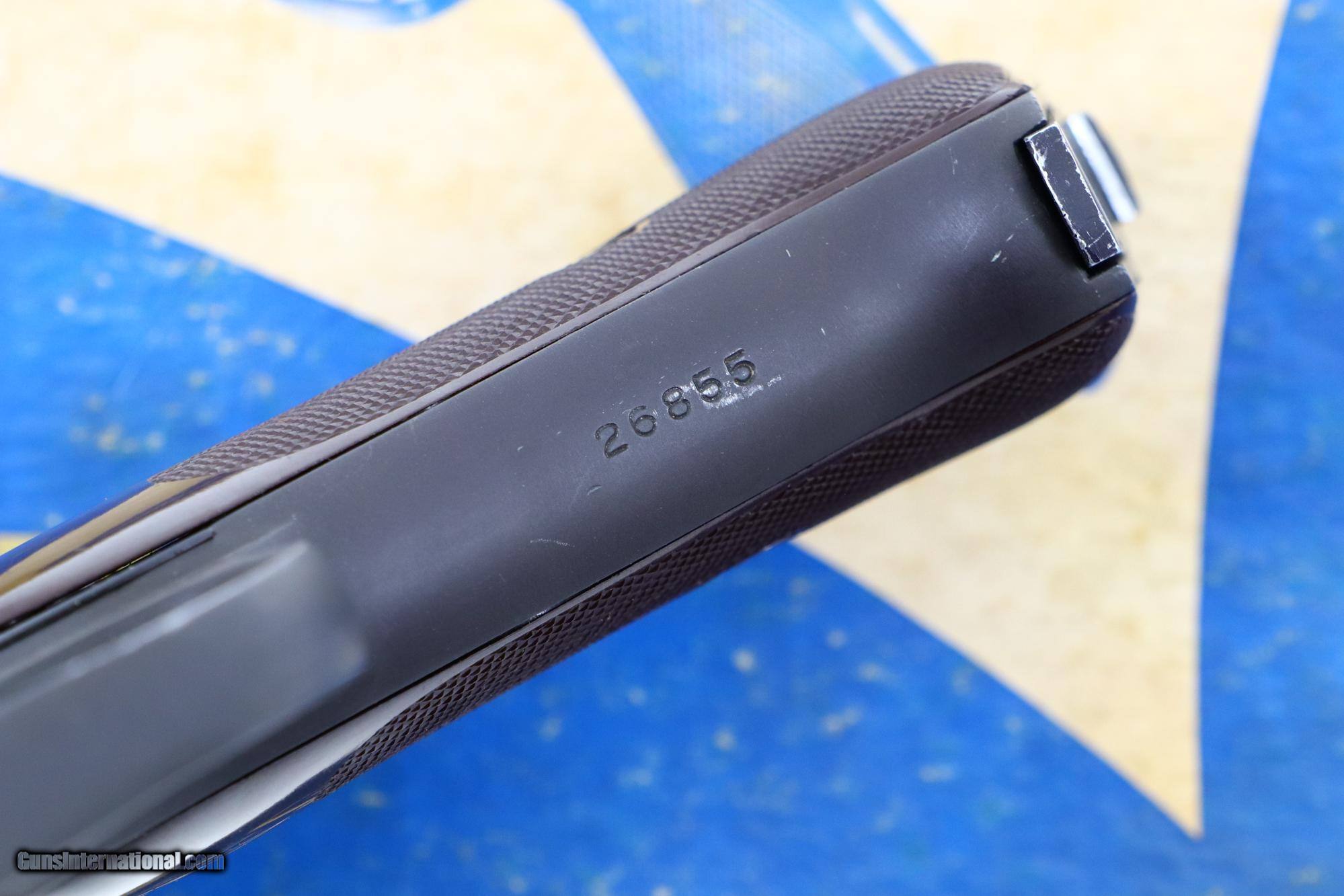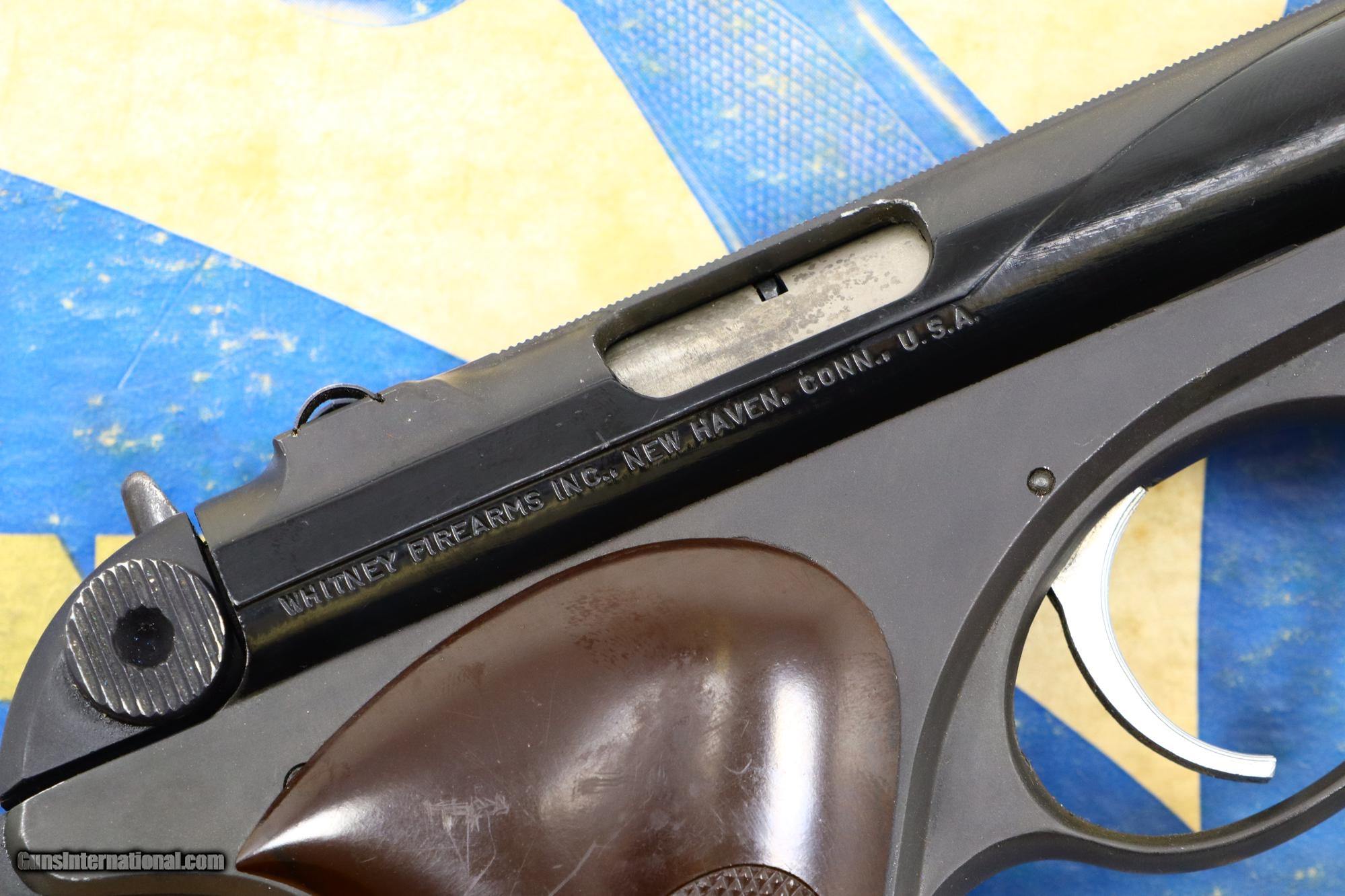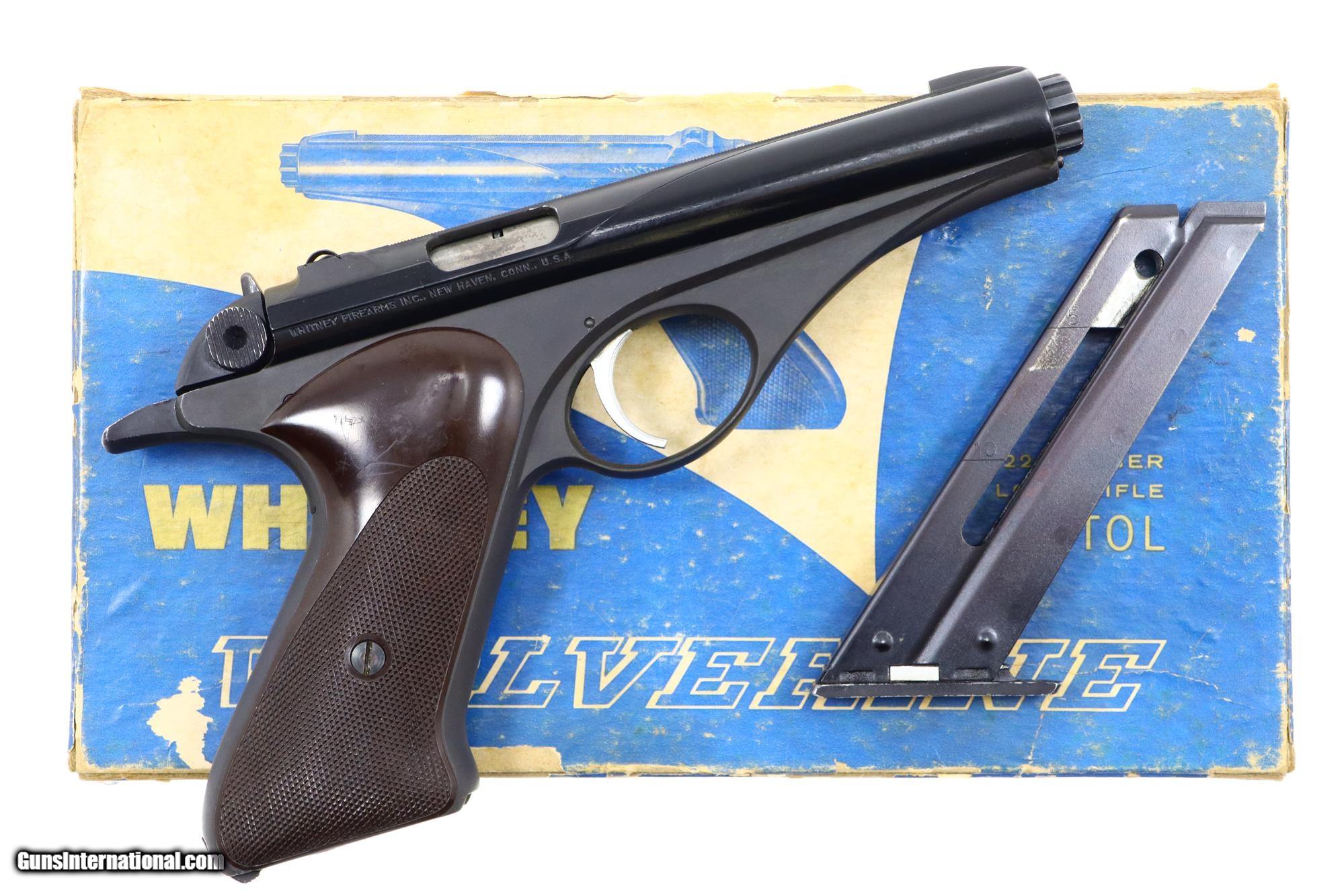 Description: Standard configuration Whitney Wolverine, mid production, with black anodized slide, other components blued except trigger, brown checkered grips, original blued magazine. Complete with original matching shipping box. Synopsis: Beautiful Whitney Wolverine, mid production, matching original box Condition: Excellent+ factory finish on all components as photographed. Excellent grips. Mirror bright bore. Perfect manual mechanics. Matching box is shop worn with tattered edging. A high condition Whitney space age pistol, especially nice in the original and matching shipping box. ~~Insured shipping fee of $65; most packages shipped using FedEx 2nd Day.~~ SOLD Manufacturer: Whitney Serial Number: 26855 Caliber Info: .22 LR |
