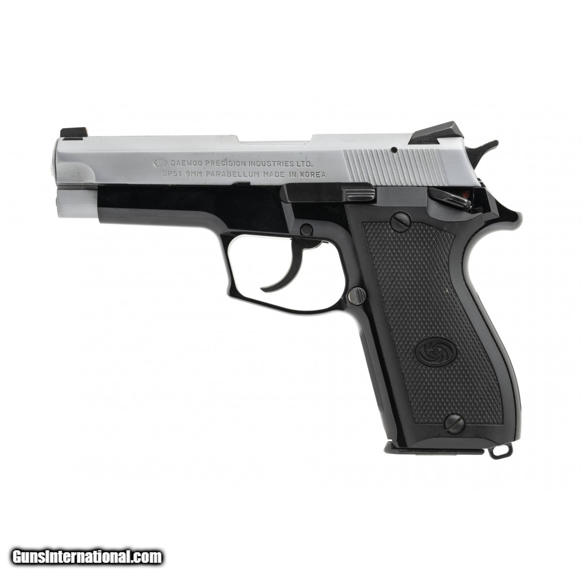 SN: 03193. Made in 1991, 9mm, 4"" barrel. Korean DP51 in excellent condition with a perfect bore. Uses the Fast Action-Triple Action trigger & comes with original Daewoo plastic grips & one thirteen-round magazine.