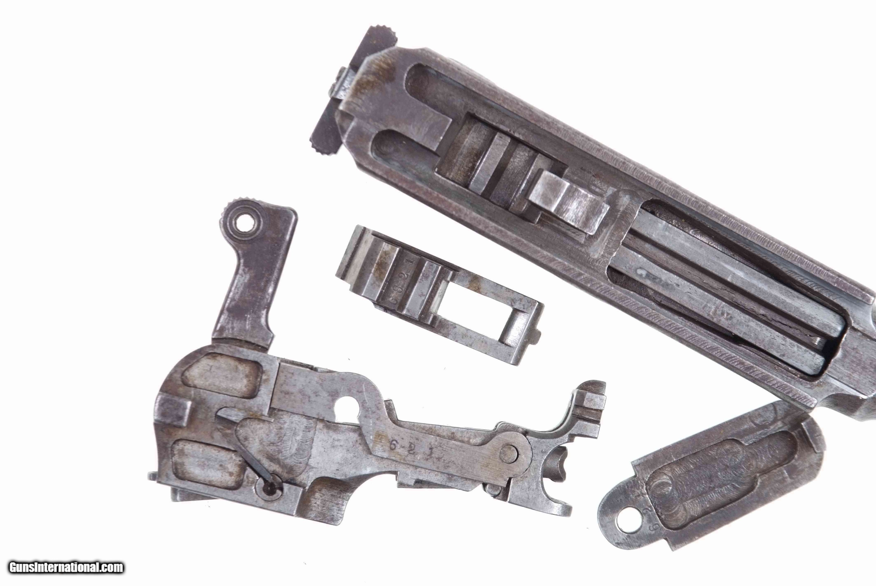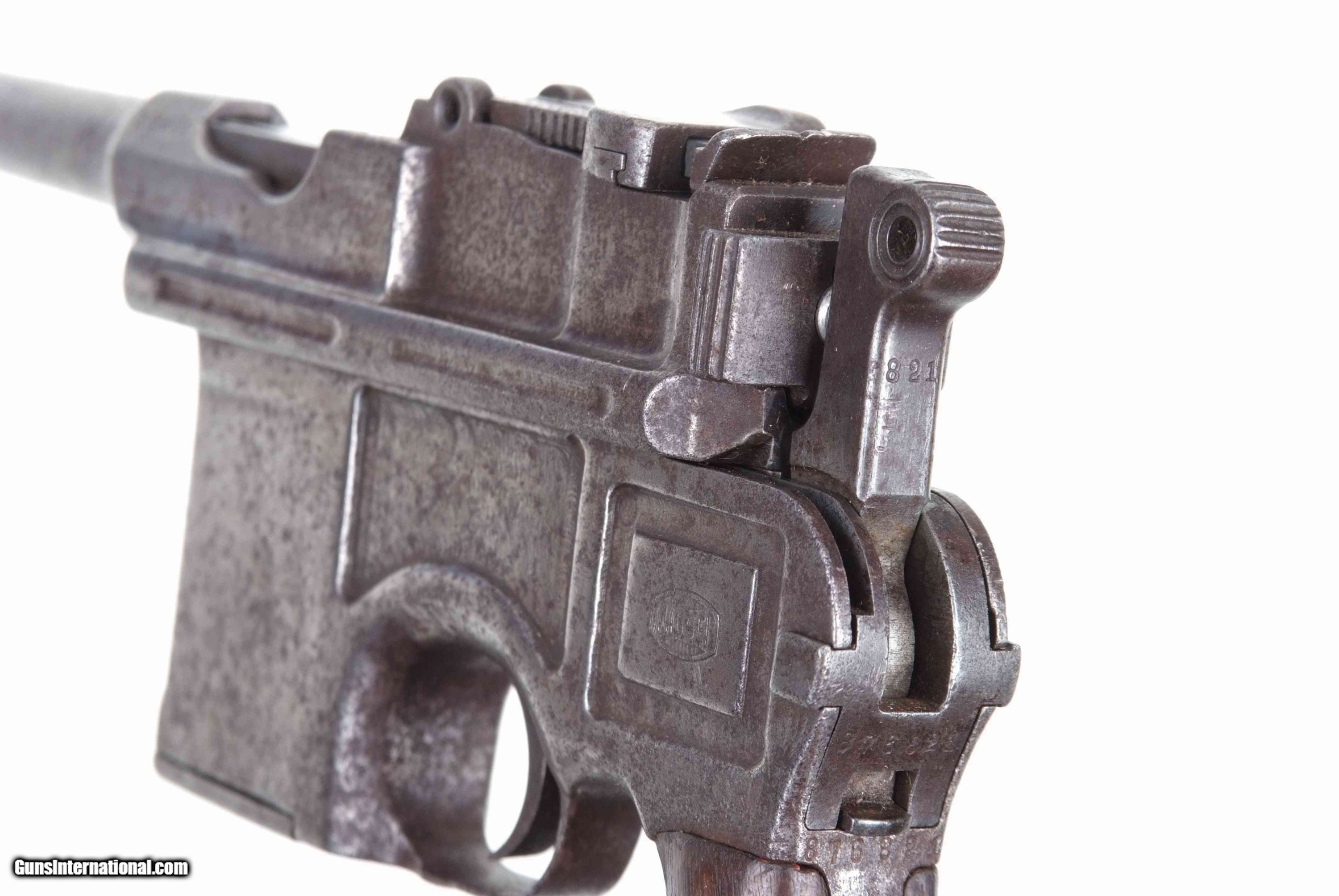 Description: Chinese manufactured copy of a late Mauser Banner Bolo, this one with a 6 digit serial number and a large Mauser banner. The gun is matching including the bolt stop in which the "8" was omitted, though grips were not removed. Safety missing. As per the Mauser, this copy has a 4" barrel, a fixed front sight and a slip-in rear sight graduated from 50-1000. Short extractor and two lug firing pin. Chamber with spurious 3-line pseudo-Mauser address. Full serial number on left chamber flat and C/C/U on left side of barrel extension. Full serial number repeated on subframe and frame. Last few digits on the bolt, bolt stop, hammer, transfer bar, and locking block. Walnut grips. No lanyard ring. Synopsis: Chinese copy of a Mauser Banner Bolo in 7.63mm. Condition: Generously G- with most blue now faded to a uniform gray with extensive patchy discolorations and shallow pitting as imaged. Shrapnel damage to upper portion of magazine well. Trigger return spring is weak and hammer needs some prodding/manipulation to fall. Missing safety. Dull bore with sharp rifling. If you want a nice gun or one to fire on the range, this is not for you. SOLD AS A HISTORIC ARTIFACT. NOT TO BE FIRED! NOT TO BE FIRED! NOT TO BE FIRED! ~~Insured shipping fee of $55; most packages shipped using FedEx 2nd Day.~~ SOLD Manufacturer: Chinese Serial Number: 876821 Caliber Info: 7.63mm |