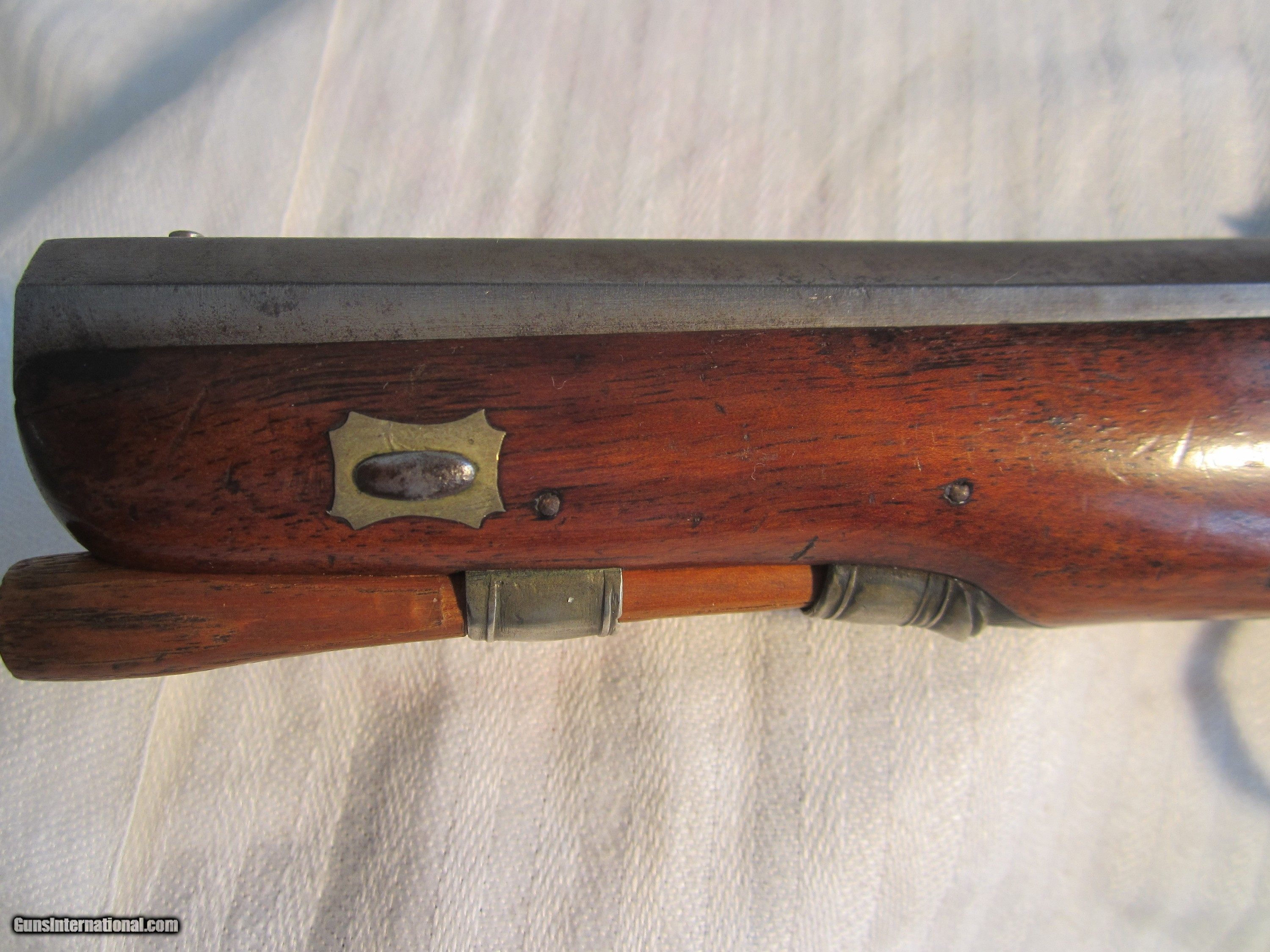 Description: A nice percussion Gentleman's pistol made by YOUNG of London, England, (inscribed on the hammer plate, right side) circa 1840 in EXCELLENT condition. The 6" octogon barrel, 60 caliber, along with the hammer and lock and trigger are blued with 80 to 90% of the finish remaining. The trigger guard and remaining metal parts appear to be finished as bright steel. The trigger guard, lock, hammer and tang are all engraved. There is a blank escutcheon plate set in the wood below the barrel tang. There is a full walnut stock nicely checkered at the grip.. The action is strong and the hammer holds on full and half cock. The top of the barrel is marked: "London _ Fine- Twisted". A very nice pistol still showing its original high quality workmanship. A NO interest payment plan is available There will be a shipping charge. See more antique and modern pistols, swords and over 100 Powder Flasks etc. at "ROMSEY SOLD Antique: Yes Manufacturer: Young of London, England Model: Gentleman's Percussion Pistol Serial Number: none Barrel Length: 6 Caliber Info: .60 Bore: smooth Condition: Excellent Metal Condition: Excellent Wood Condition: Excellent Bore Condition: good/antique Barrels: one Barrel Type: octogon Action: percussion Triggers: one Stock: full/walnut/grip checkered Finish: blued/bright Sights: front & rear Manufacture Date: ca. 1840 Engraving: lots Item Location: San Diego,California- |