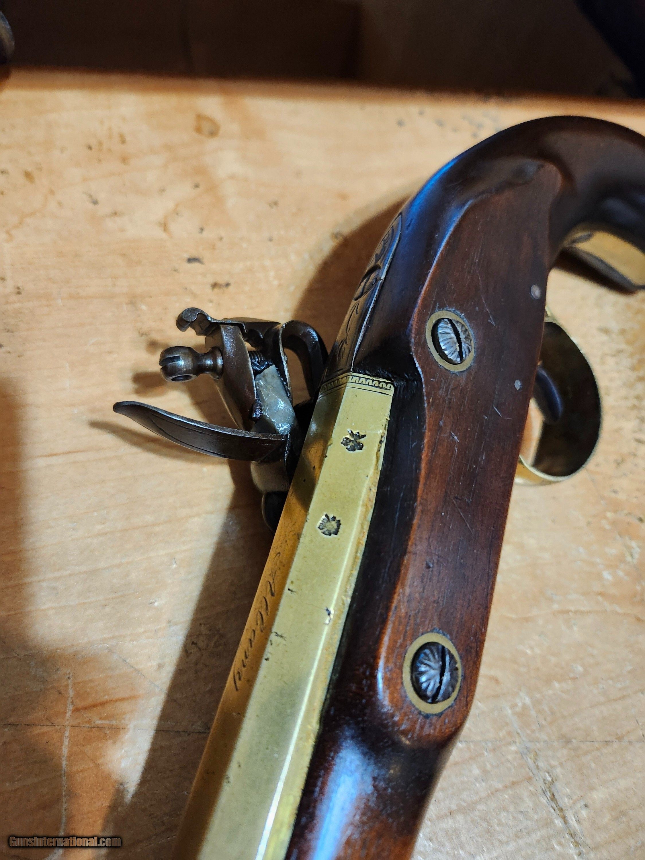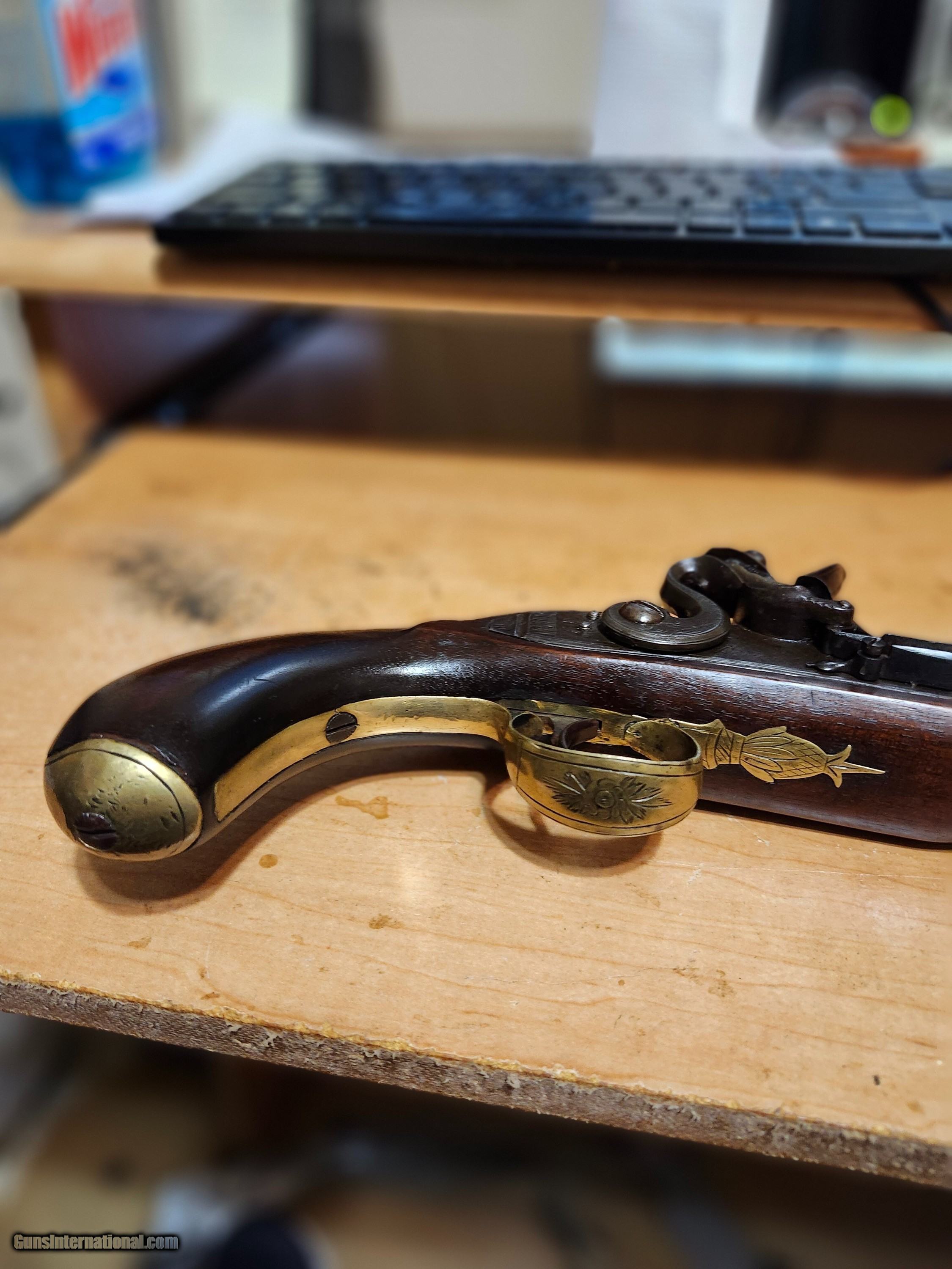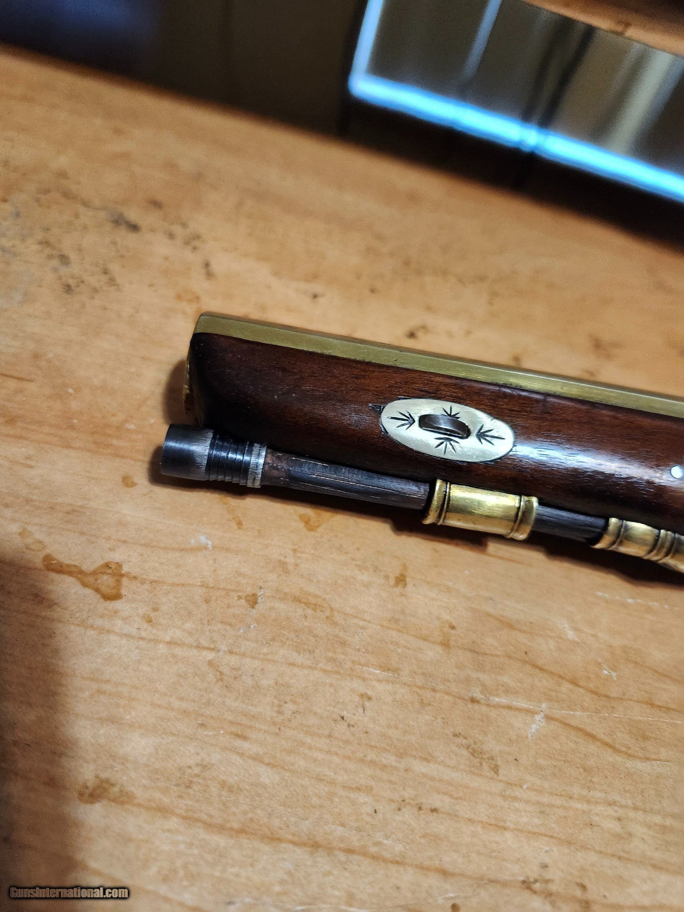 Description: 9 inch octogan barrel vg bore // 14 1/2 inches oa / stock in fine condition//lock marked pond & co// barrel marked albany / lots of brass barreled guns made at sea may be captains gun?? works fine in dry fire / looks like silver around barrel wedge //some engraving on treigger guard and lock / ramrod tip looks replaced//very nice gun that has not been taken apart many times// the stock pins look un removed / the pair to this gun sold on another but i cant find it $50 sh no sales to ny unless you go through an ffl ship $100 to ny Antique: Yes Manufacturer: british Model: naval officers pistol Serial Number: nvs Price: $1,495.00 Contact Seller |