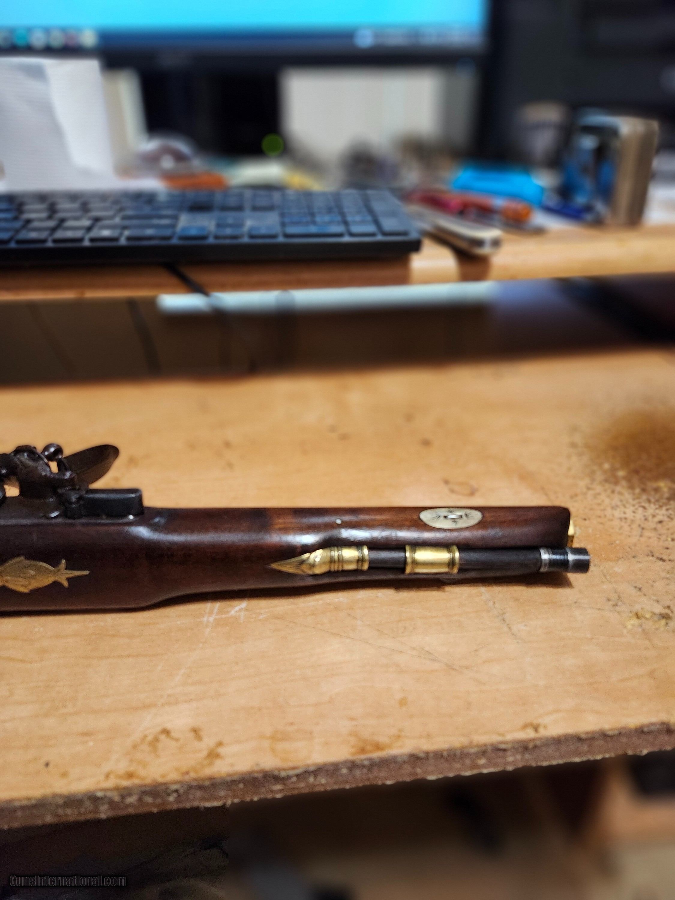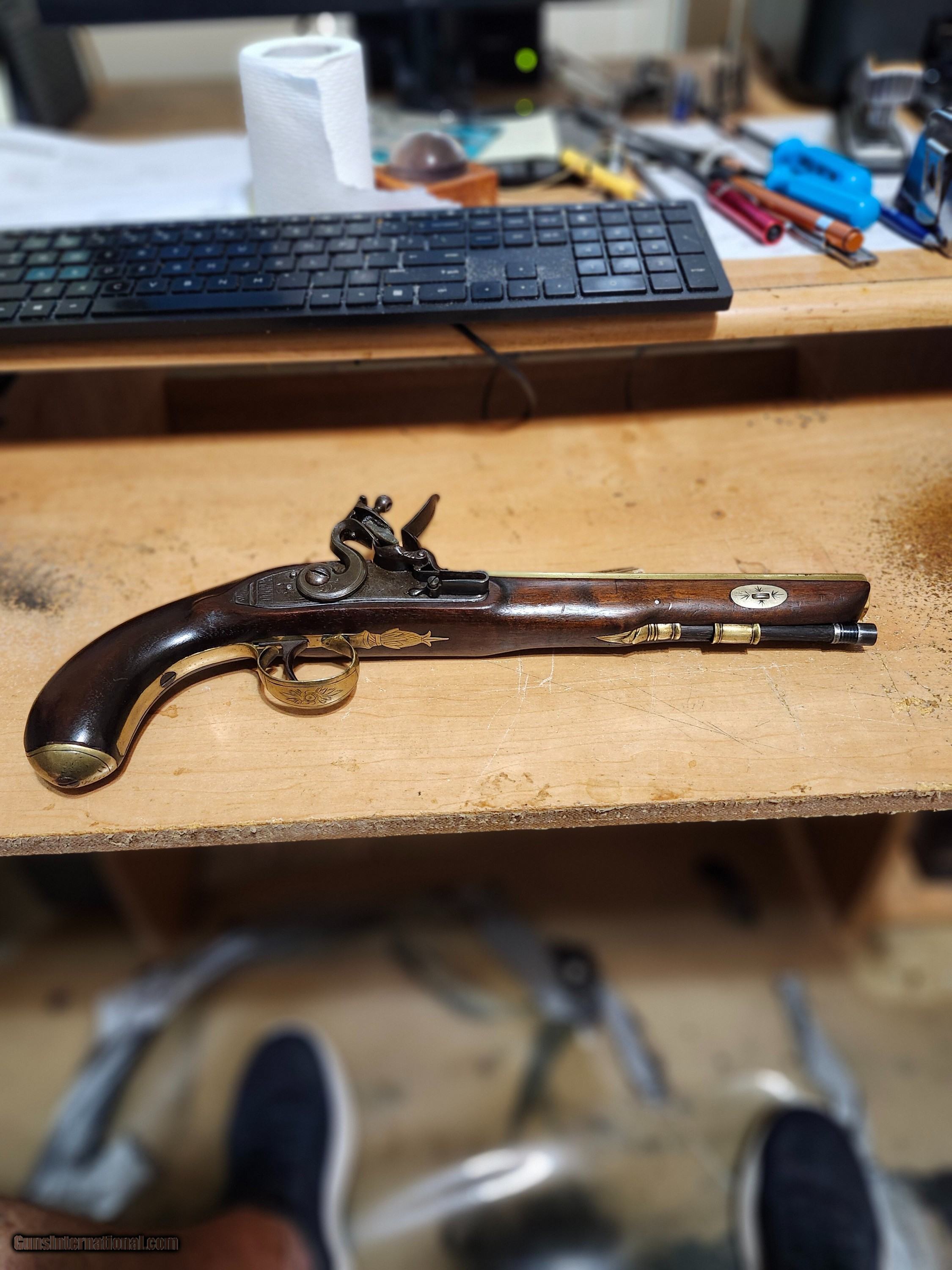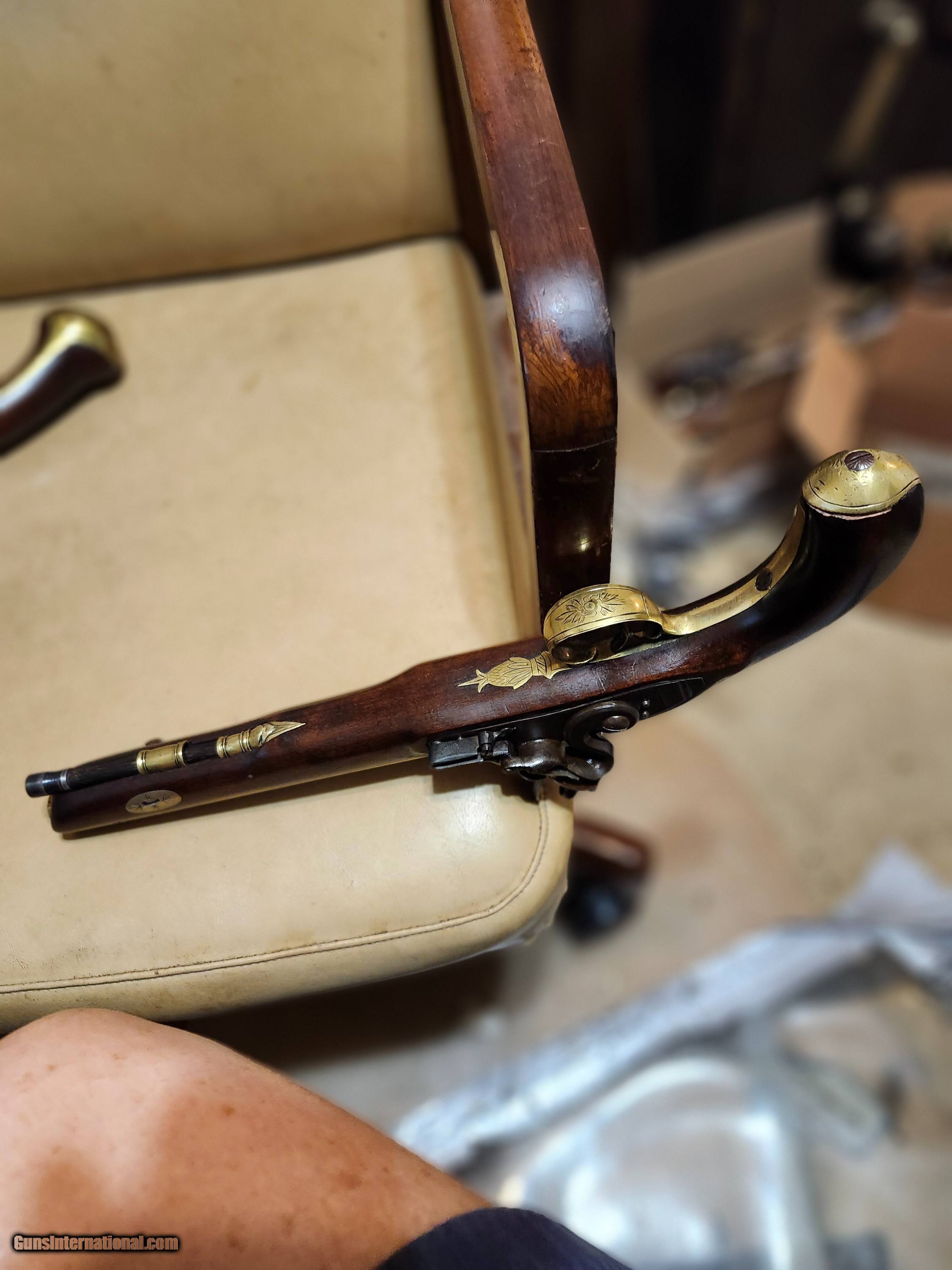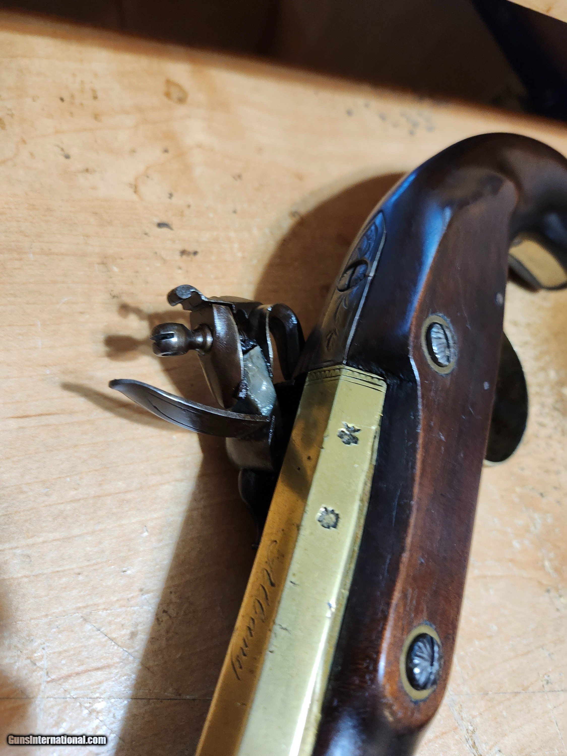 Description: 9 inch octogan barrel vg bore // 14 1/2 inches oa / stock in fine condition//lock marked pond & co// barrel marked albany / lots of brass barreled guns made at sea may be captains gun?? works fine in dry fire / looks like silver around barrel wedge //some engraving on treigger guard and lock / ramrod tip looks replaced//very nice gun that has not been taken apart many times// the stock pins look un removed / the pair to this gun sold on another but i cant find it $50 sh no sales to ny unless you go through an ffl ship $100 to ny Antique: Yes Manufacturer: british Model: naval officers pistol Serial Number: nvs Price: $1,495.00 Contact Seller |