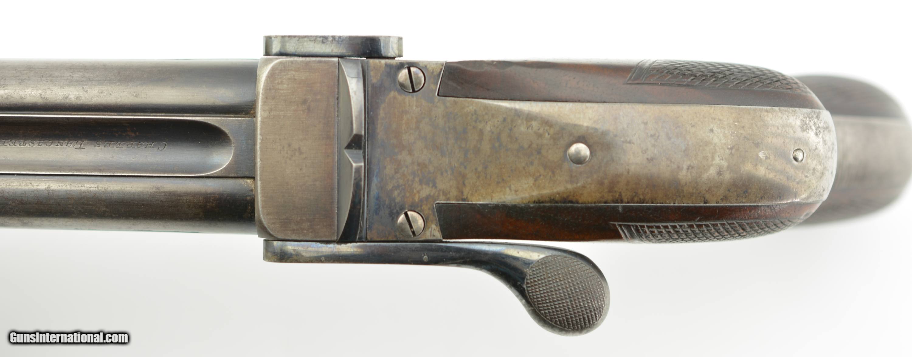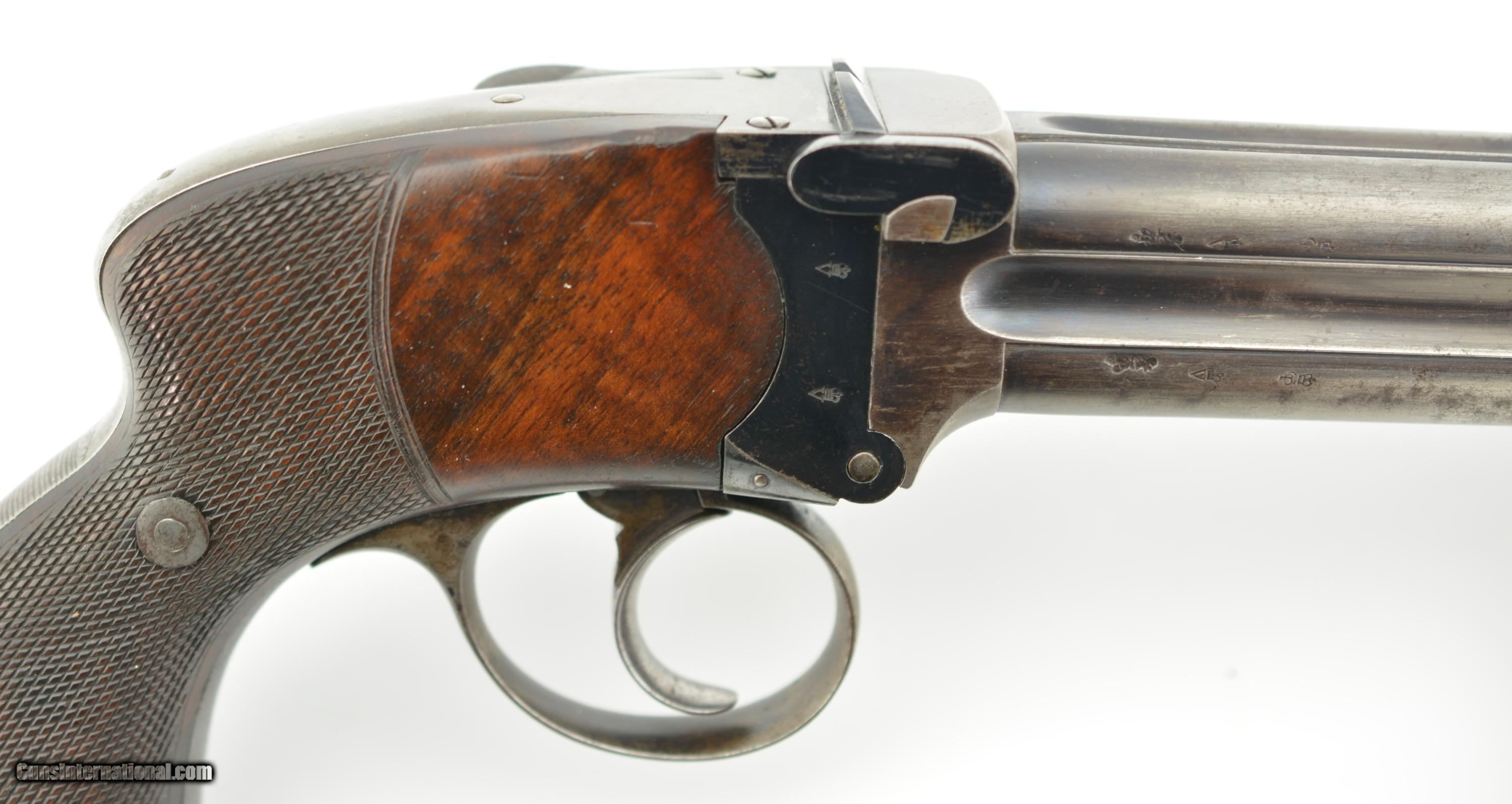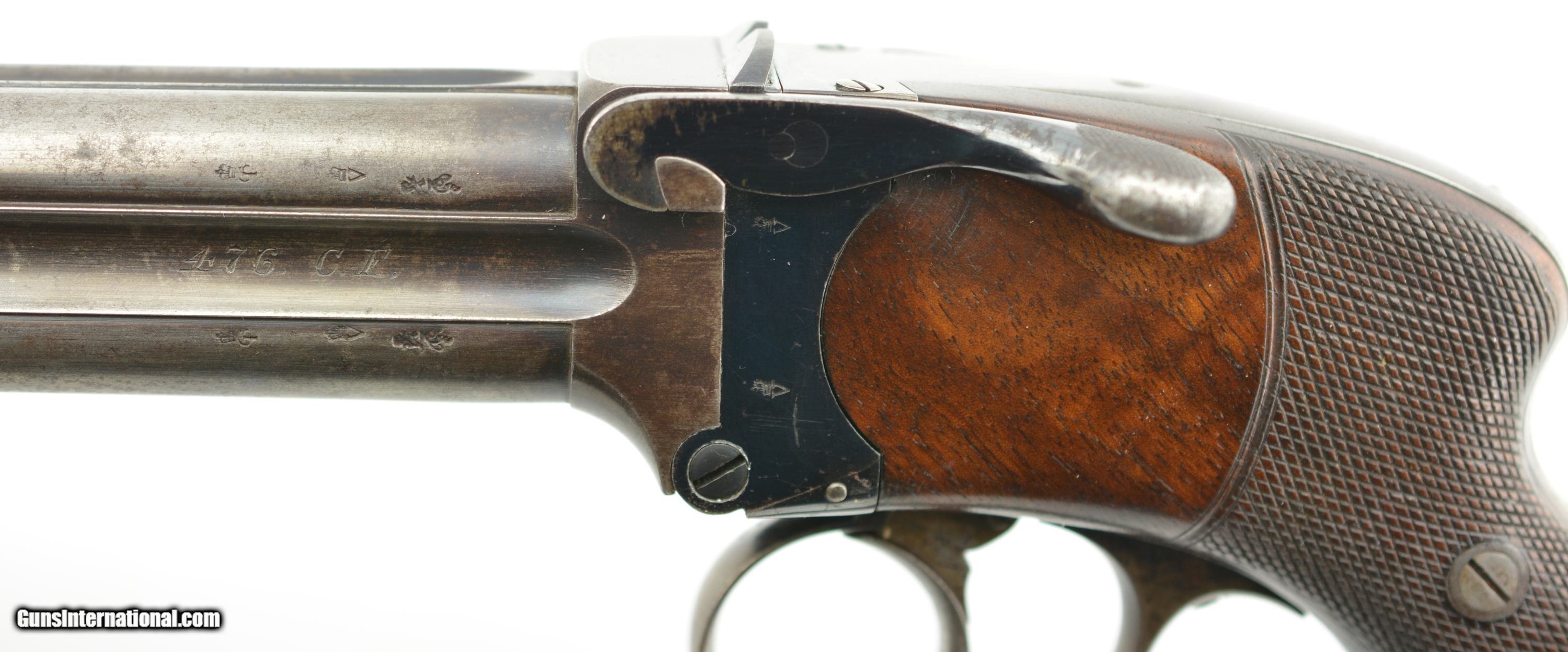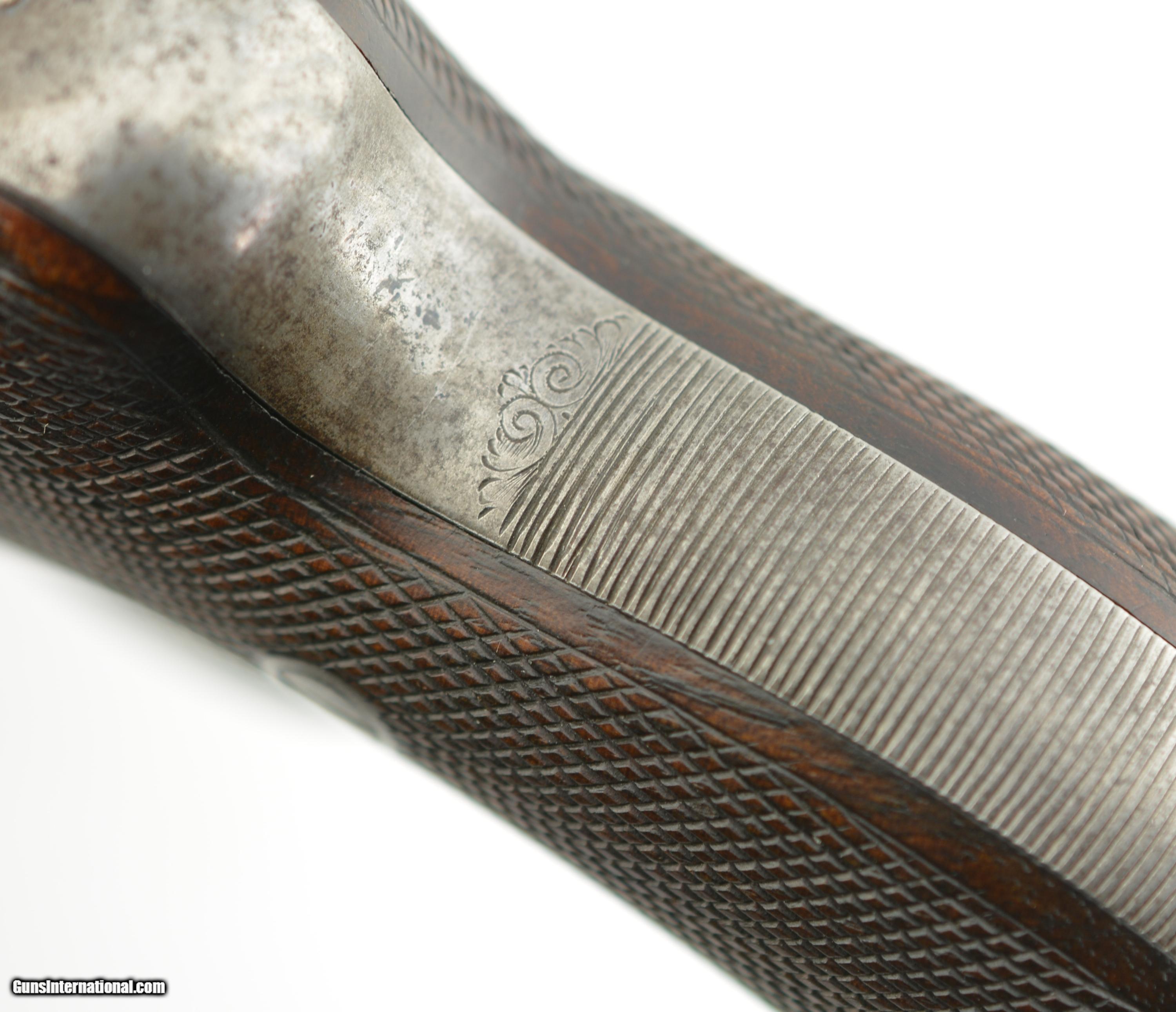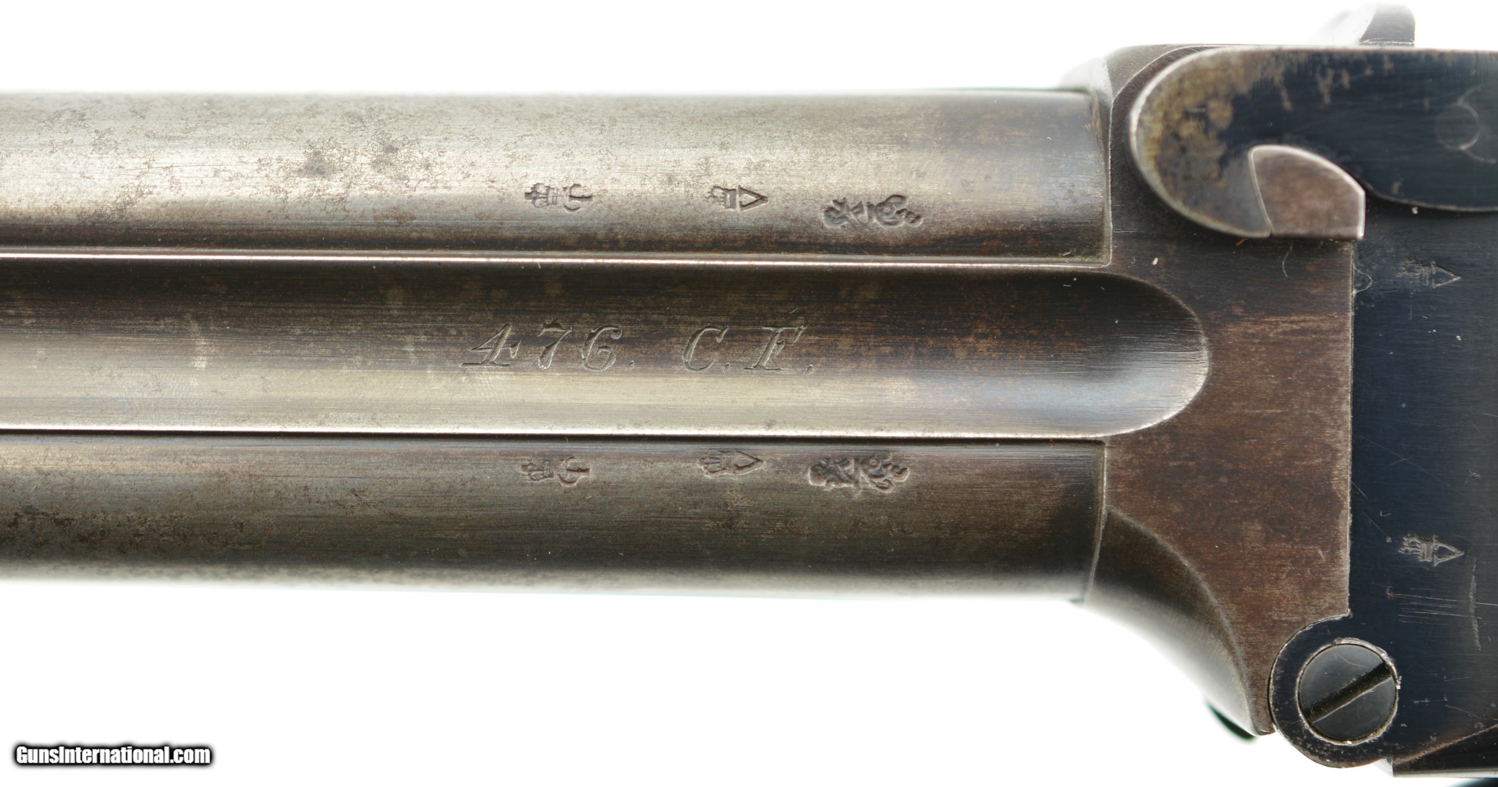 Description: Serial #8122, .476 Enfield, 6 1/4" barrels with excellent, bright bores. This is a strikingly handsome pistol that has retained 40-50% of the original blue on the barrels, with the balance turned to a mixture of smooth pewter gray and plum-brown. The maker's marking on the rib, proofs, and caliber designation are all crisp and clear, while the lustrous original blue still remains on the sides of the frame, and thumb-lever. The checkered walnut bird's head grips are in fine-excellent shape with some small surface blemishes, an area of mild wear under the lever on the left side, as well as some general flattening of the points. Lock-up is accomplished through a thumb-lever actuated stirrup along the top of the frame that engages two lugs on either side of the breech. The lock-up is superb, and the action is fully functional. The pistol is housed in the original five-compartment, green baize-lined, wooden traveling case. The Charles Lancaster label is heavily worn, but still clearly legible on the inside of the lid, and the pistol is further accompanied by an ebony-handled turn-screw, and period glass oil bottle. According to Lancaster records, this gun was sold in September of 1887 to a "T.W. Greenfield". There are three known British soldiers from the period with those initials and last name: Capt. Thomas W. Greenfield, 22nd Battalion, Devonshire Rifle Volunteers; Thomas William Bruce Greenfield, Protectorate Regiment Frontier Force, South Africa; and Thomas Waring Bunce Greenfield, Irish Guards. This is a very rare, cased four-barreled pistol, in fine condition, and represents an exceptional opportunity for the collector to acquire a stunning British handgun. Antique SOLD Antique: Yes Manufacturer: Lancaster Model: Four-Barrel Serial Number: 8122 Caliber Info: .476 Gauge Info: .476 |