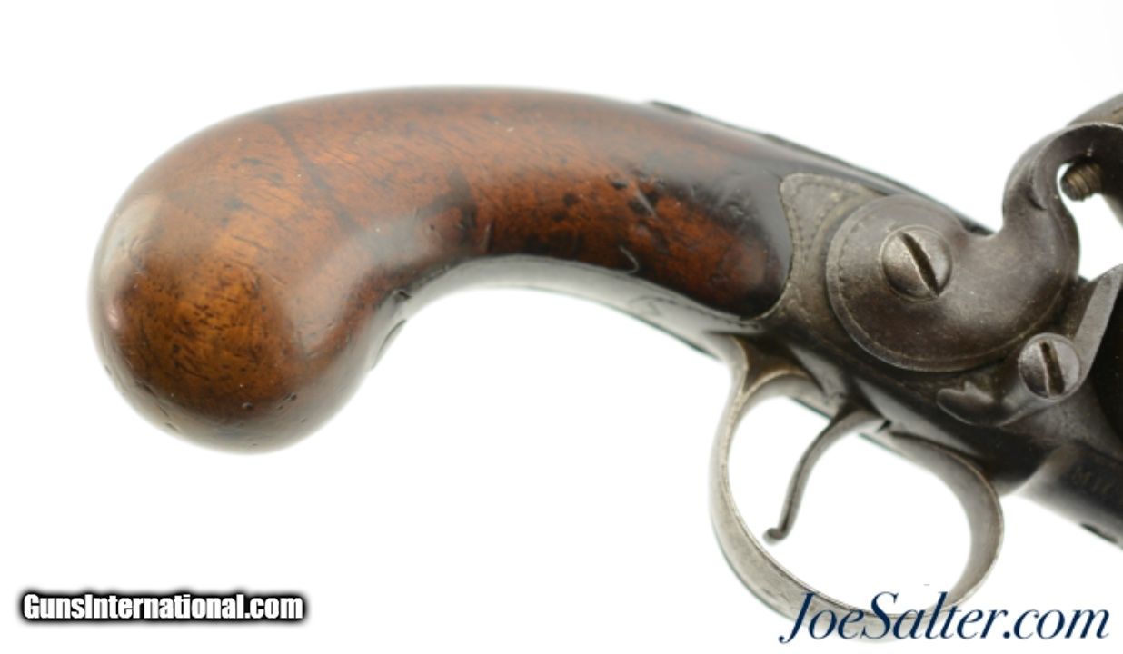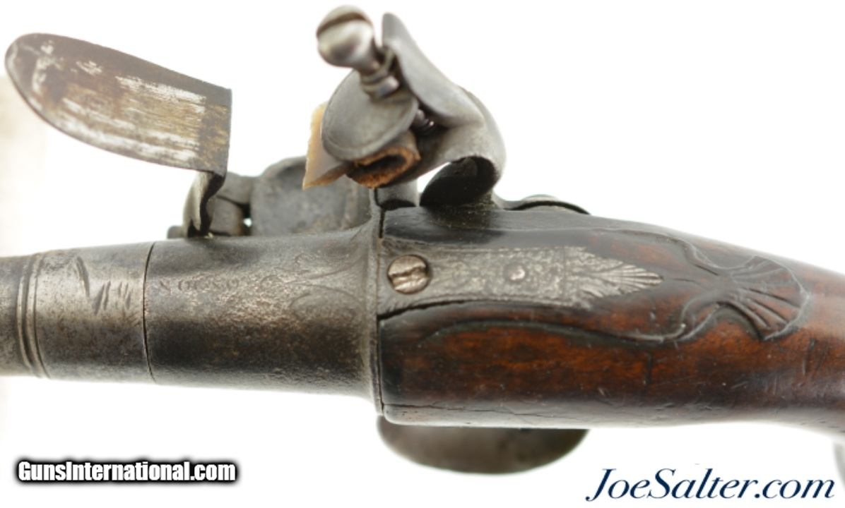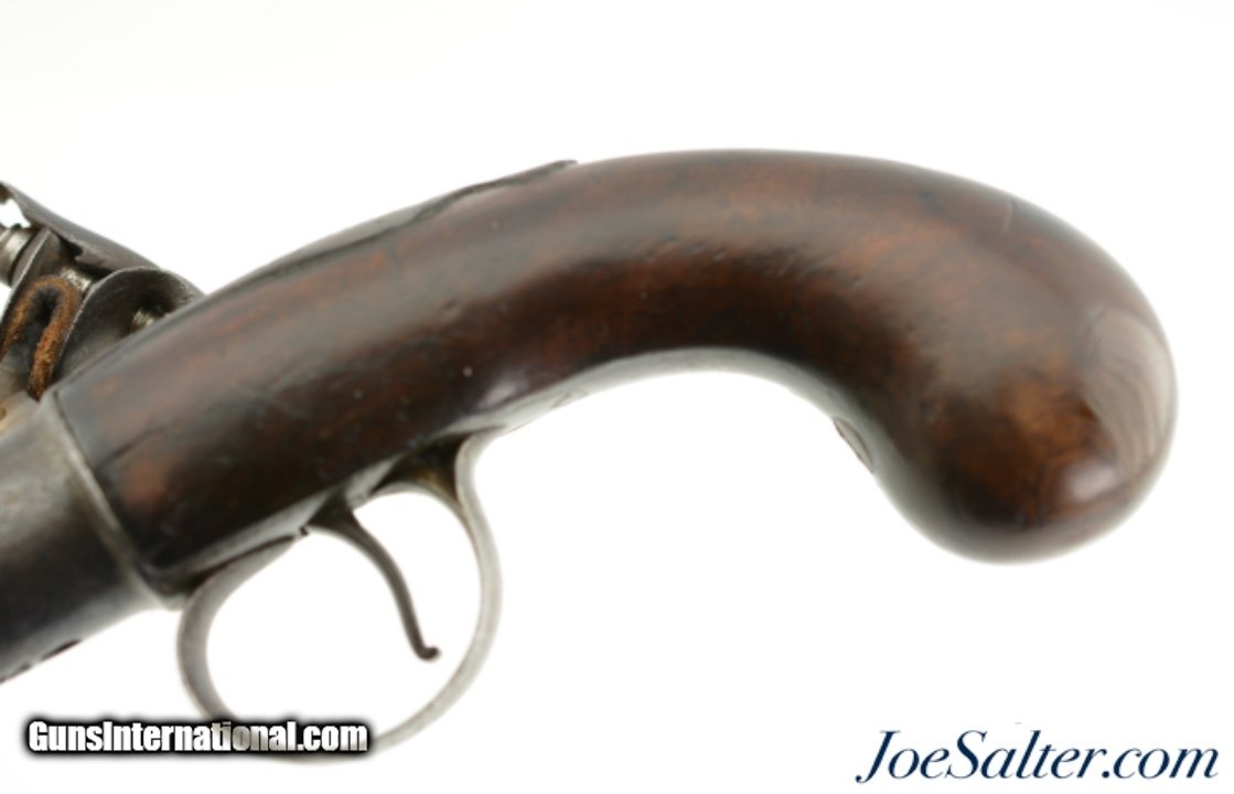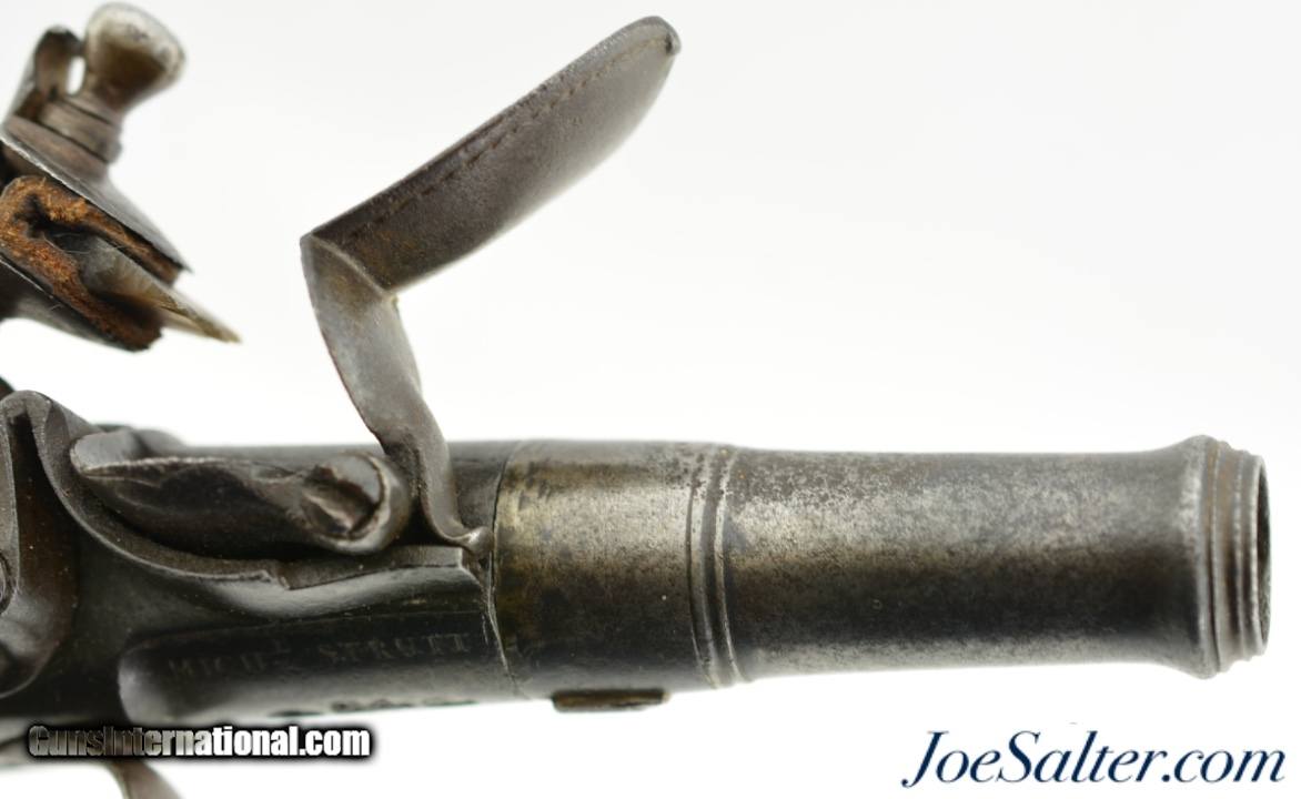 Description: NSN, .50 Caliber. 2 3/16" cannon barrel with a very good, lightly pitted bore. This is a handy little pocket-sized pistol marked "(L)ONDON" on the top of the frame, and "MICHL. STRUTT" on the underside below the pan. The metal has an overall plum-brown patina throughout with thin freckling and some areas of pinprick pitting, heaviest in and around the pan and breech area. The bulbous walnut grip has several large handling marks in the old added oil finish, mostly on the right side near the frame juncture. The spanner is no longer present, but the barrel turns-off easily while still seating firmly. The lock is fully functional, and the pistol rates very good overall. Michael Strutt was a London maker who operated from about 1727 & 1739. This is an unusually small Queen Anne pistol, and would make a wonderful addition to any collection. Antique SOLD Antique: Yes |