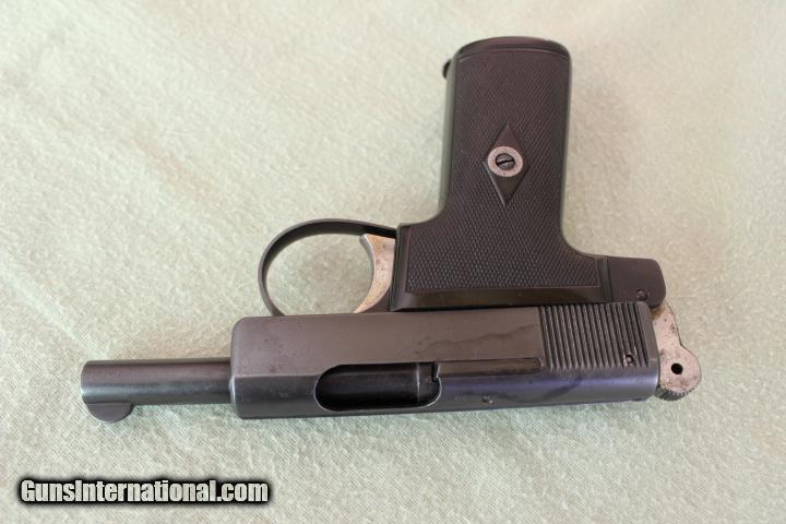 Description: Webley and Scott Model 1908 pistol in 32acp caliber. It retains nearly all of it's period re-arsenaled blue finish with light mottling of the surface overall. Bore is very good and should clean better. Orig Mag and grips are exc. SOLD Curio/Relic: Yes |
