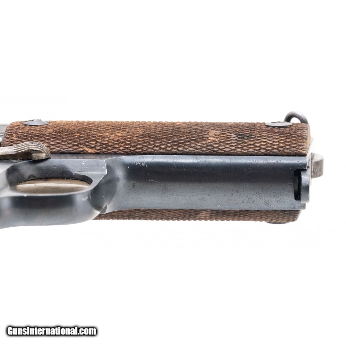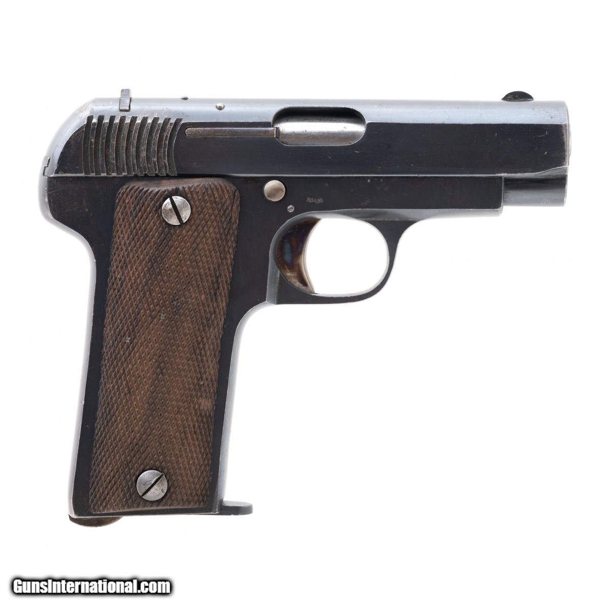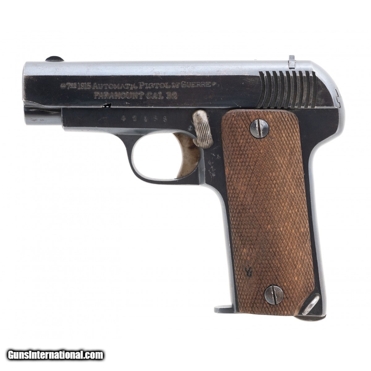 Serial No. 42188, circa 1916-1918, .32ACP, 3.25"" round barrel. 90% original blue remains with minor areas of surface oxidation visible, trigger is case colored. Bore is bright with frosting visible in the grooves. Grips show light handling wear, action functions correctly. Slide is marked ""765-1915-Automatic Pistol De Guerre/Paramount-CAL-32"". It is possible this pistol saw service in WWI.