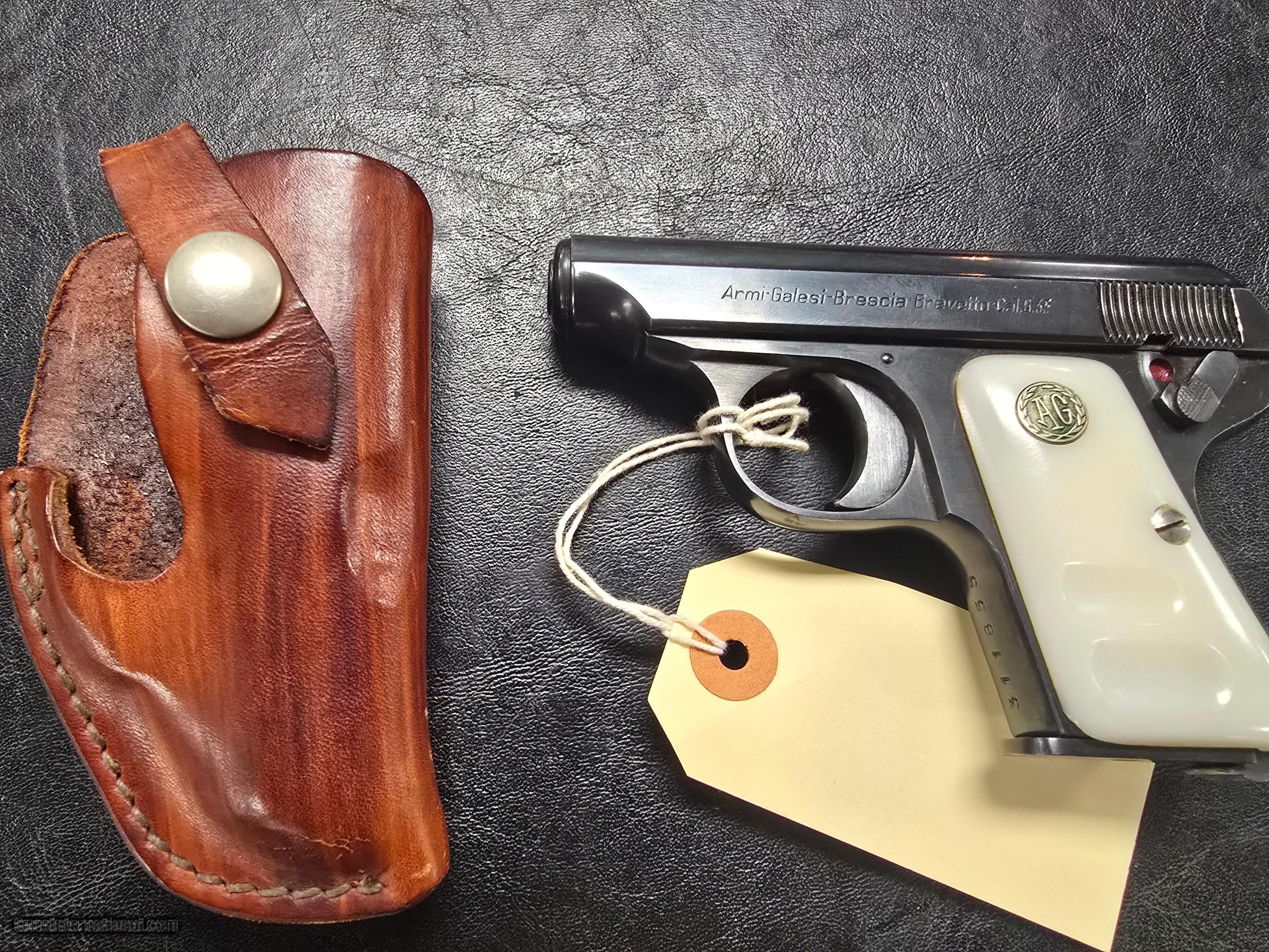 Description: Beautiful armi-galesi 25acp. Gun is in excellent shape with white grips. Bluing is excellent. Gun comes with 1 magazine and nice leather holster. Gun is made in Italy. Shipping is included in price. Cc fee 3% SOLD Handgun Caliber: .25 ACP (6.35mm Browning, 6.35×16mmSR) Manufacturer: Armi-galesi Model: Bravetta |
