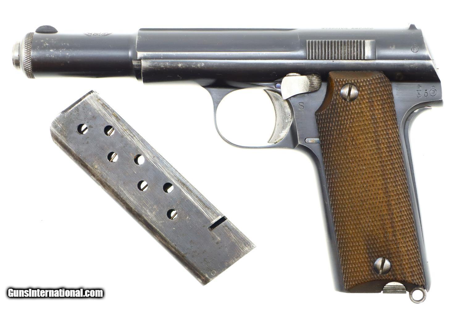 Description: Standard configuration Astra M600 with fixed front and rear sights. Astra U/C logo on forward slide; two line address on rear slide. Eibar proof marks on left tang, including the proof year “0” reflecting production in 1944. Automatic pistol proof repeated on the left side of the slide and on the barrel over exposed chamber that is also marked “PIST.PATR.08”. Full serial number on slide and frame, the last three digits repeated under the barrel. Waffenamt E/WaAD20 acceptance on right tang. Walnut checkered grips. Correct Astra “E/U” magazine. Synopsis: Astra, 600, WWII, German Miltary Pistol, 3562, A-1856 Condition: VG+, original rust blue with sharp edge wear and thinning as one might expect from a holstered pistol. Much of the fire blue over crown of grip screws has toned. Comparable condition grips and magazine. Mirror bright bore. Perfect manual mechanics. One of the more desirable Astra pistols as procured by the Nazi military during WWII. ~~Insured shipping fee of $55; most packages shipped using FedEx 2nd Day.~~ SOLD Manufacturer: Astra Serial Number: 3562 Caliber Info: 9mmP |
