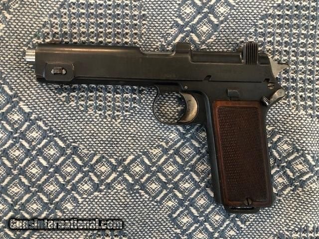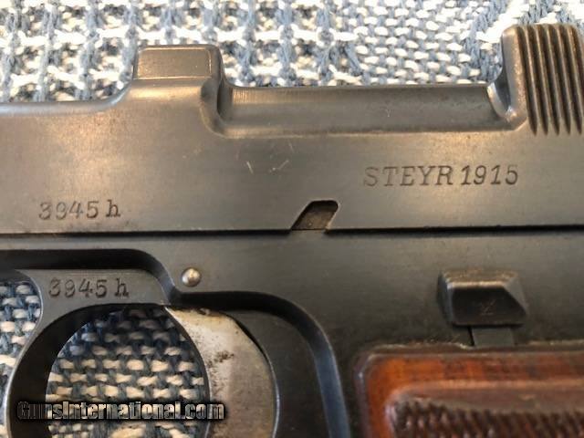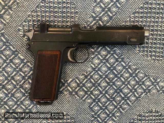 Description: Austrian Steyr 1912 autoloading pistol Dated 1915 in excellent condition retaining 95% of the original blue finish. Wood grips are sharp and crisp with very good checkering. Totally matching serial numbers. The bore is bright and shinny. This firearm has never had any basement gunsmithing performed on it. Great 100 year old WW I collector piece that shoots great! Shooting the Austrian 9 x 23 mm cartridge this gun utilizes a rotary locking system. I have shot this gun with surplus 9 mm Largo ammo. Even have a few stripper clips that are included. Can even supply a couple boxes of original ammo. This Stery has been in my automatic pistol collection for 40 years; you will not be dissapointed! SALE PENDING SOLD Curio/Relic: Yes |