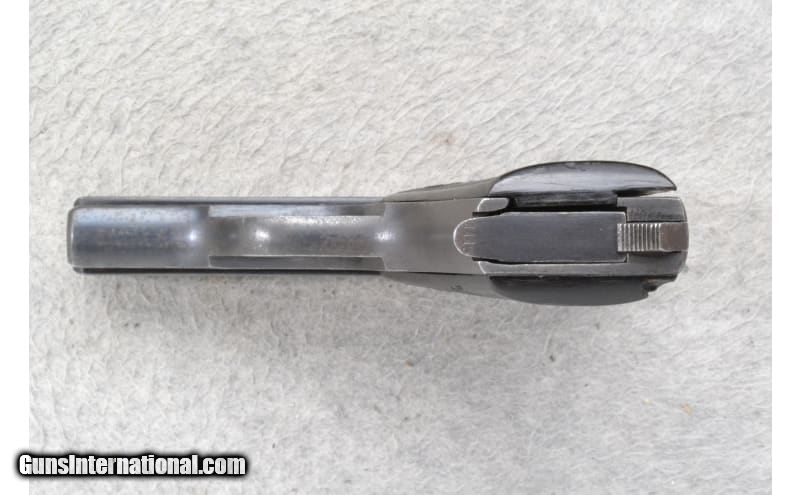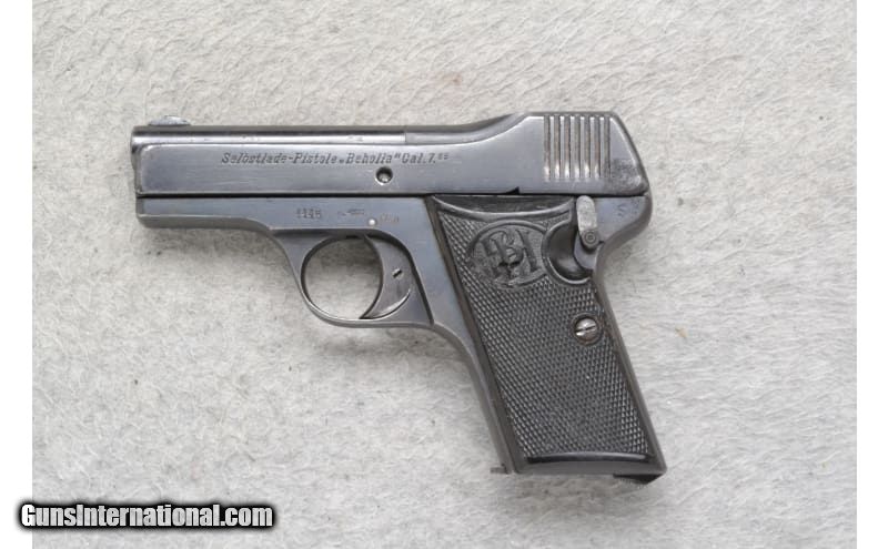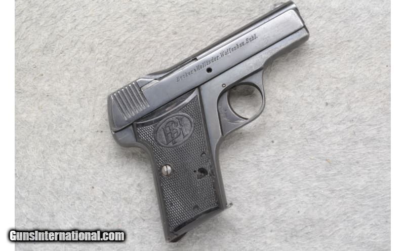 Description: This Becker & Hollander Model Beholla is a right hand semi-auto pistol in 7.65 Cal. It has a 3 inch barrel with a rear serrated slide, front blade sight and notch rear sight. The grip is brown checkered polymer with B&H logo and shows some damage. Has loaded chamber indicator. Serial number: 1115 with matching magazine 7.65MM (.32 ACP) SOLD Metal Condition: "Good with freckling, some pitting near serrations on the left side of the slide. Bore Condition: Good Barrels: 3 inches with rear serrated slide Weight: 24 ounces Sights: Fixed blade front sight and notch rear sight Item Location: Richfield, WI |