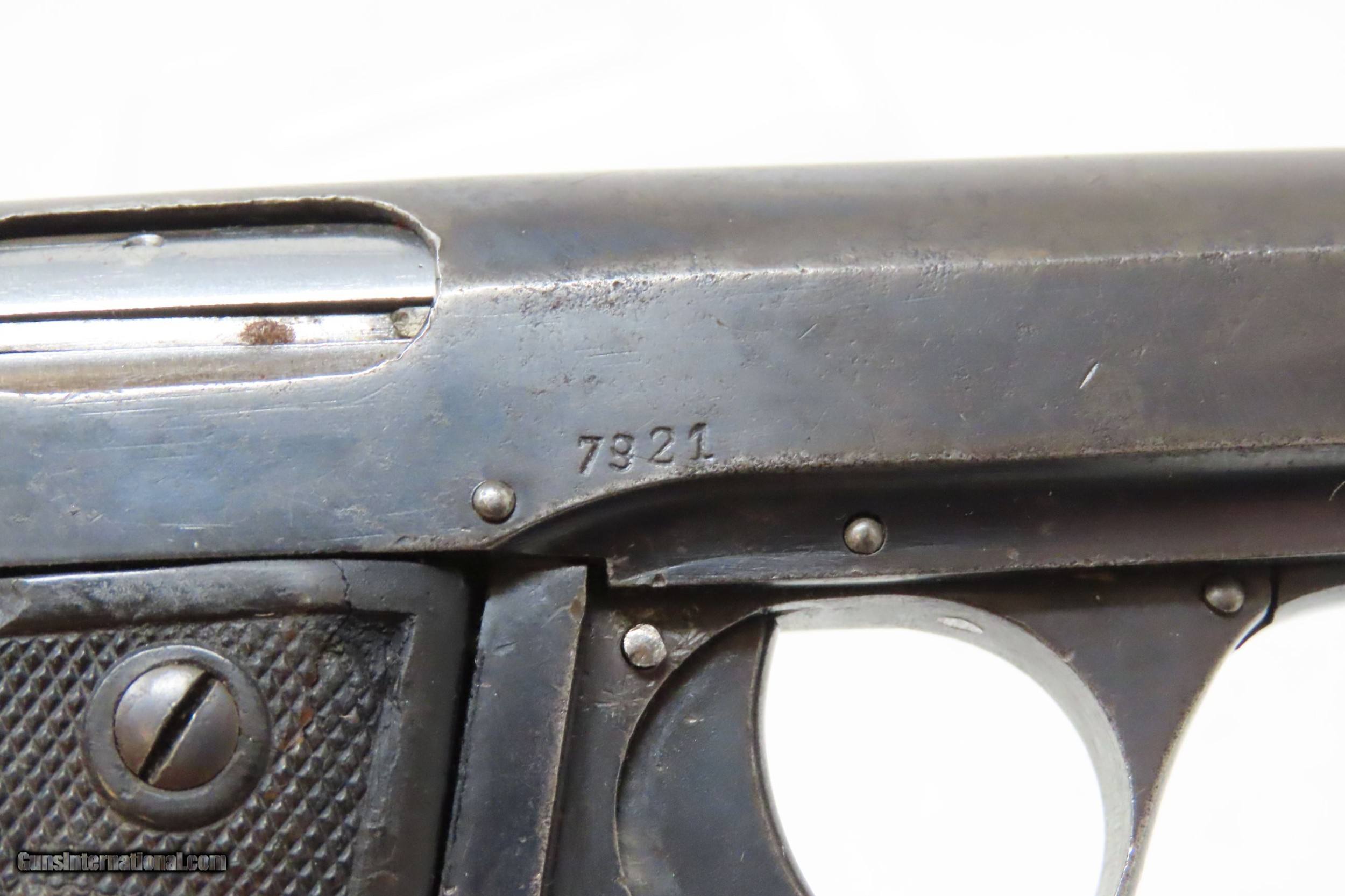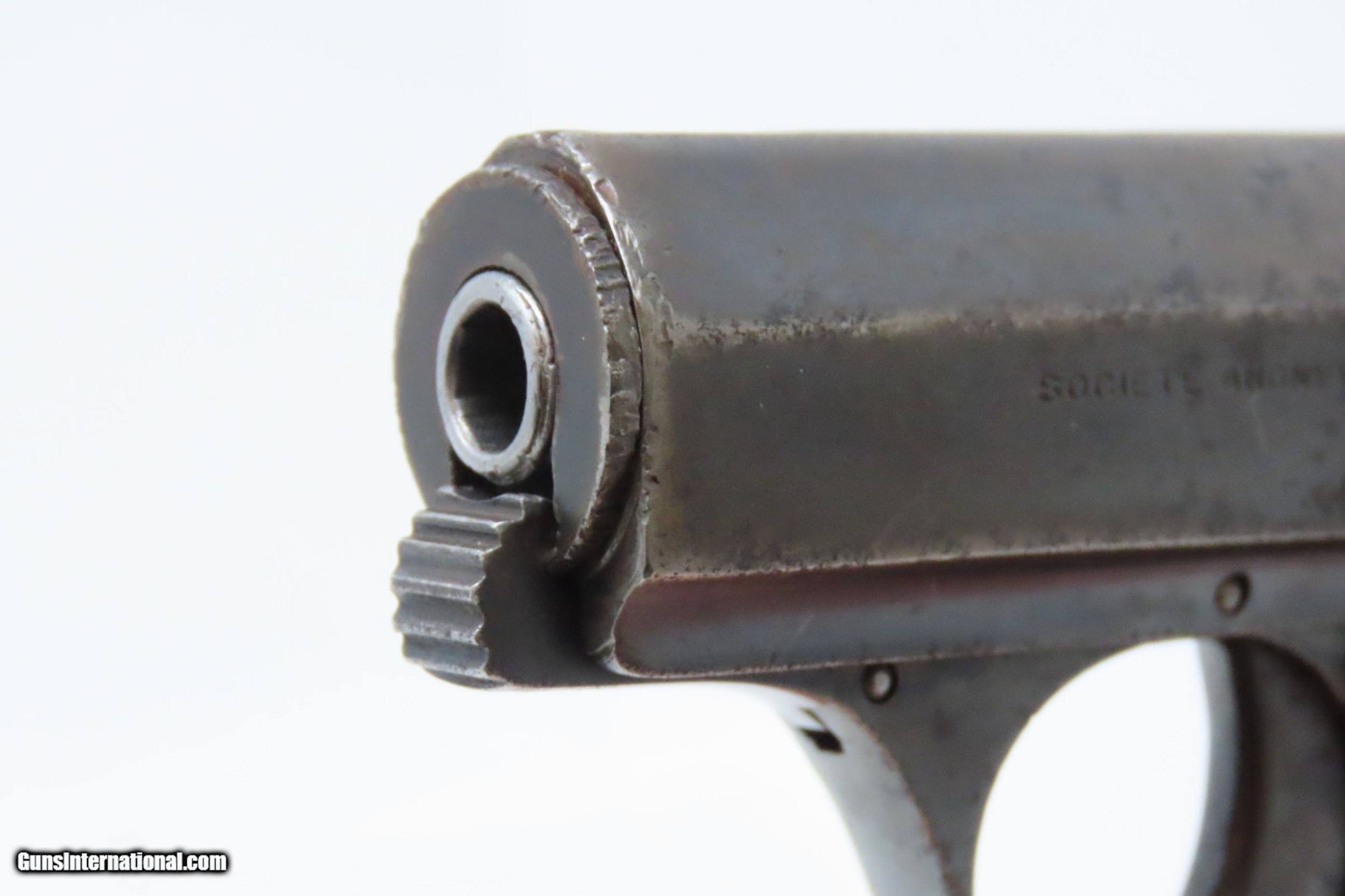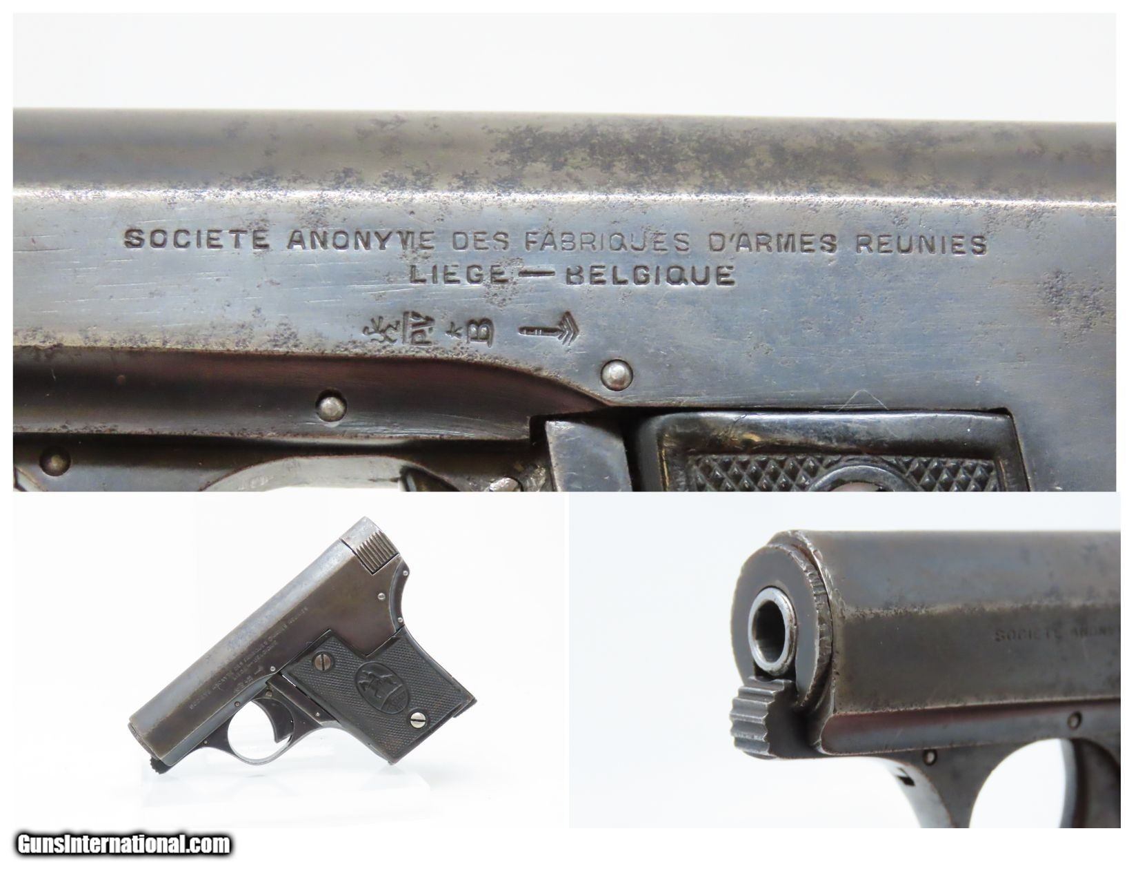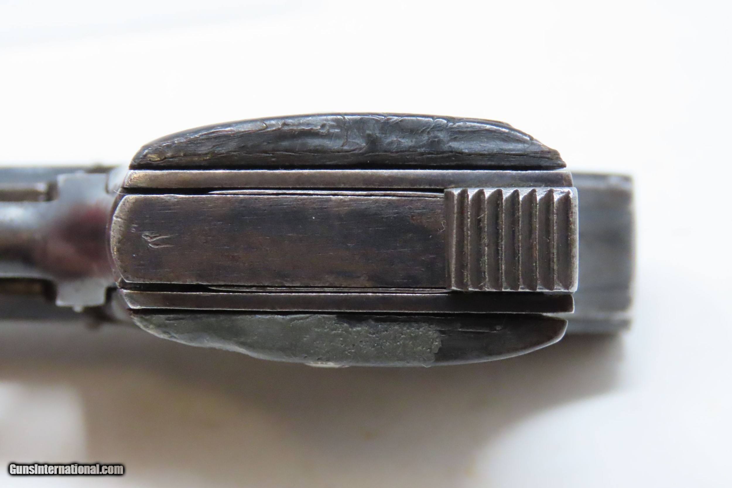 Description: Belgian REUNIES DICTATOR .25 ACP Semi-Auto Self-Defense POCKET Pistol C&R Manufactured in the 1910s for “CONCEAL and CARRY” Here we present a C&R Belgian Dictator Semi-Automatic Pocket Pistol, also marketed under the name Centaure, made circa the 1910s in Liege, Belgium by Societe Anonyme des Fabriques d’Armes Reunies with a production run from 1910 through 1918 with very few produced. The Dictator was patented in 1909 by this company which was established solely to exercise this patent. The original designer of this little pistol is unknown. Production began in 1910, but despite being a unique design, it sold poorly in an already overcrowded pocket pistol market and production was discontinued in 1918. Surviving examples, like this one, are extremely rare making them very hard to come by. This semi-auto pistol was the first pistol to utilize a tubular receiver which contained a “wrap around” style telescoping bolt rather than a conventional hammer and slide. It was the first pistol to use this type of bolt. Though this design was unique, it offered no clear advantage over the existing designs of the era. This would have been a neat little pocket pistol that would have been very easy to “conceal and carry” during the tumultuous times of the Roaring Twenties and beyond! The overall condition is good. Strong action. Semi-bright bore, slight pitting. Original finish. Clear and legible markings. Both grips are in good shape and contain average handling wear. This firearm is classified as a Curio & Relic. Barrel is 2-3/8 inches. Caliber: .25 ACP Overall condition as seen in photos. Very Fast. Very Safe. FREE SHIPPING. Will need to be sent to your local FFL or C&R licensee. This firearm is classified as a Curio & Relic. Guaranteed AUTHENTIC & Includes CERTIFICATE OF AUTHENTICITY. ancestryguns $1200 #217881 SOLD Curio/Relic: Yes |