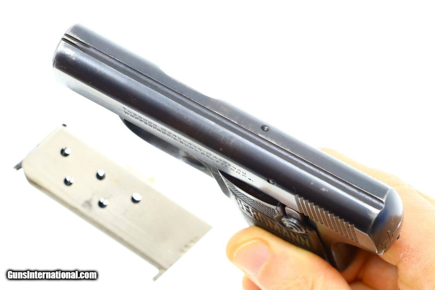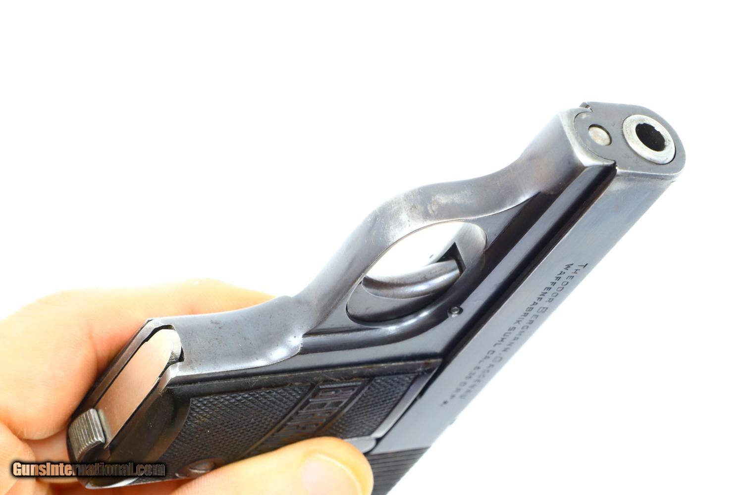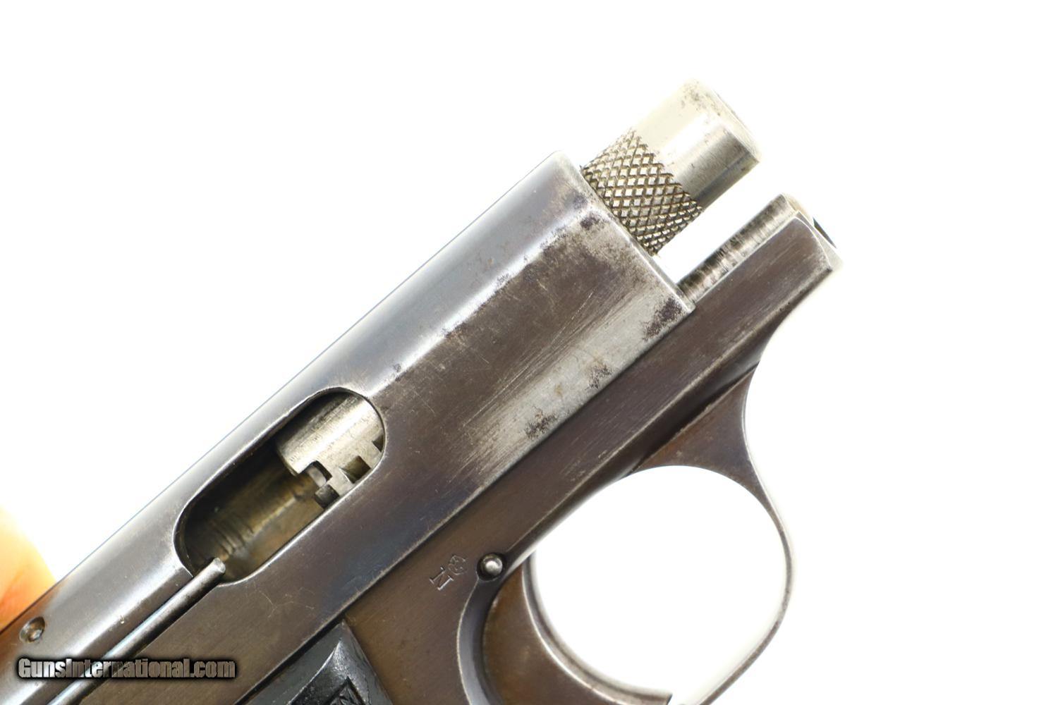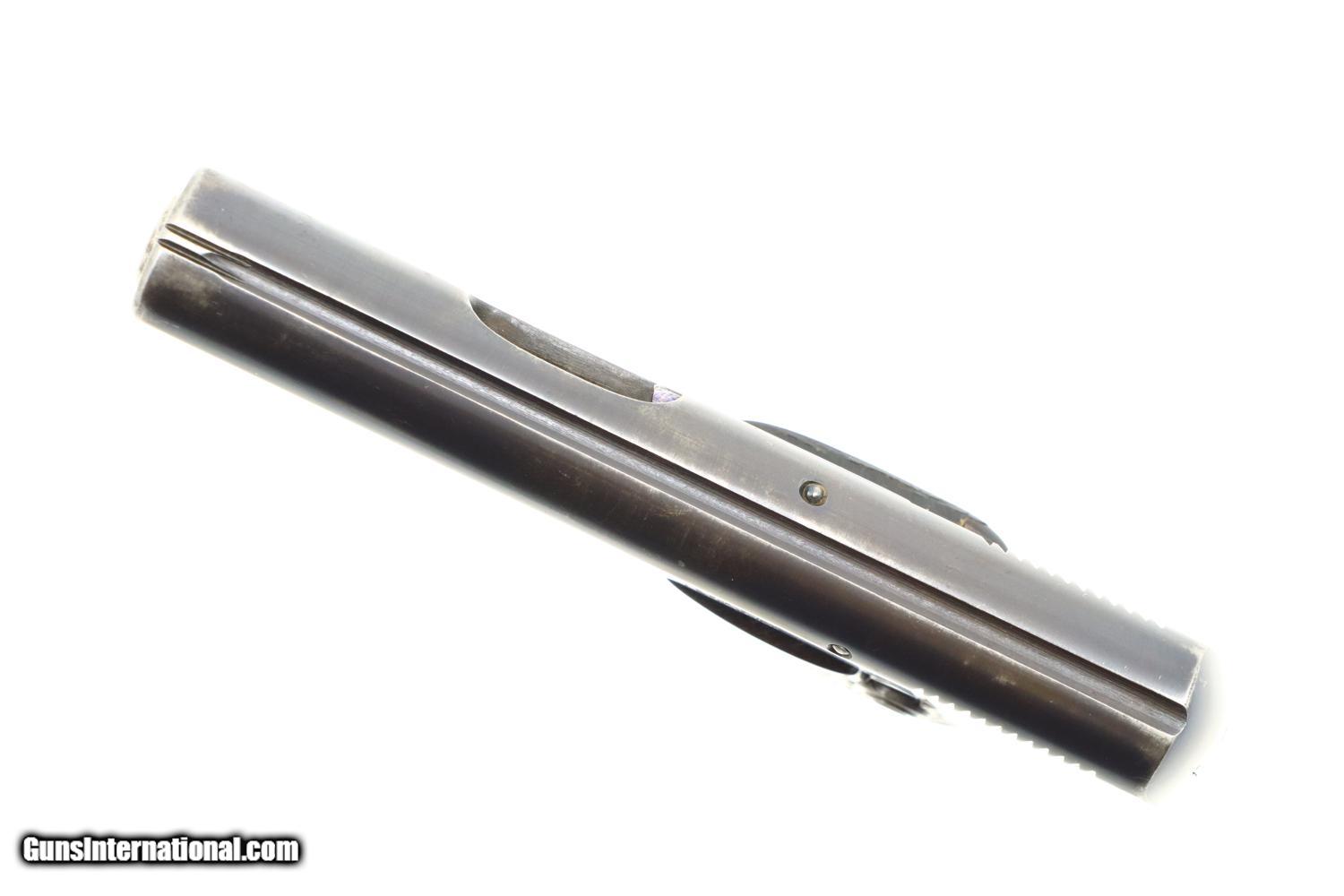 Description: Conventional single action blowback pistol made by Theodor Bergmann, cal 6.35mm, designed similarly to most of the Spanish Eibar pistols, this example with a left tang mounted safety and bottom magazine release. Left side of slide marked with two line address. Crown/N proofing on barrel, slide, and frame. Most major components blued, barrel in the white, magazine is nickle plated. Matching barrel, frame and magazine. Synopsis: Bergmann, Vest Pocket, 6.35mm, 1547, PCA-173 Condition: VG+ with wear in usual use locations, mainly around the muzzle with a few oxidative patches as carefully pictured. Comparable condition grips and magazine. Bright bore with sharp rifling. Perfect manual mechanics. A nice all matching example of a difficult to find Bergmann Vest pocket pistol. ~~Insured shipping fee of $45; most packages shipped using FedEx 2nd Day.~~ SOLD Manufacturer: Bergmann Serial Number: 1547 Caliber Info: 6.35mm |