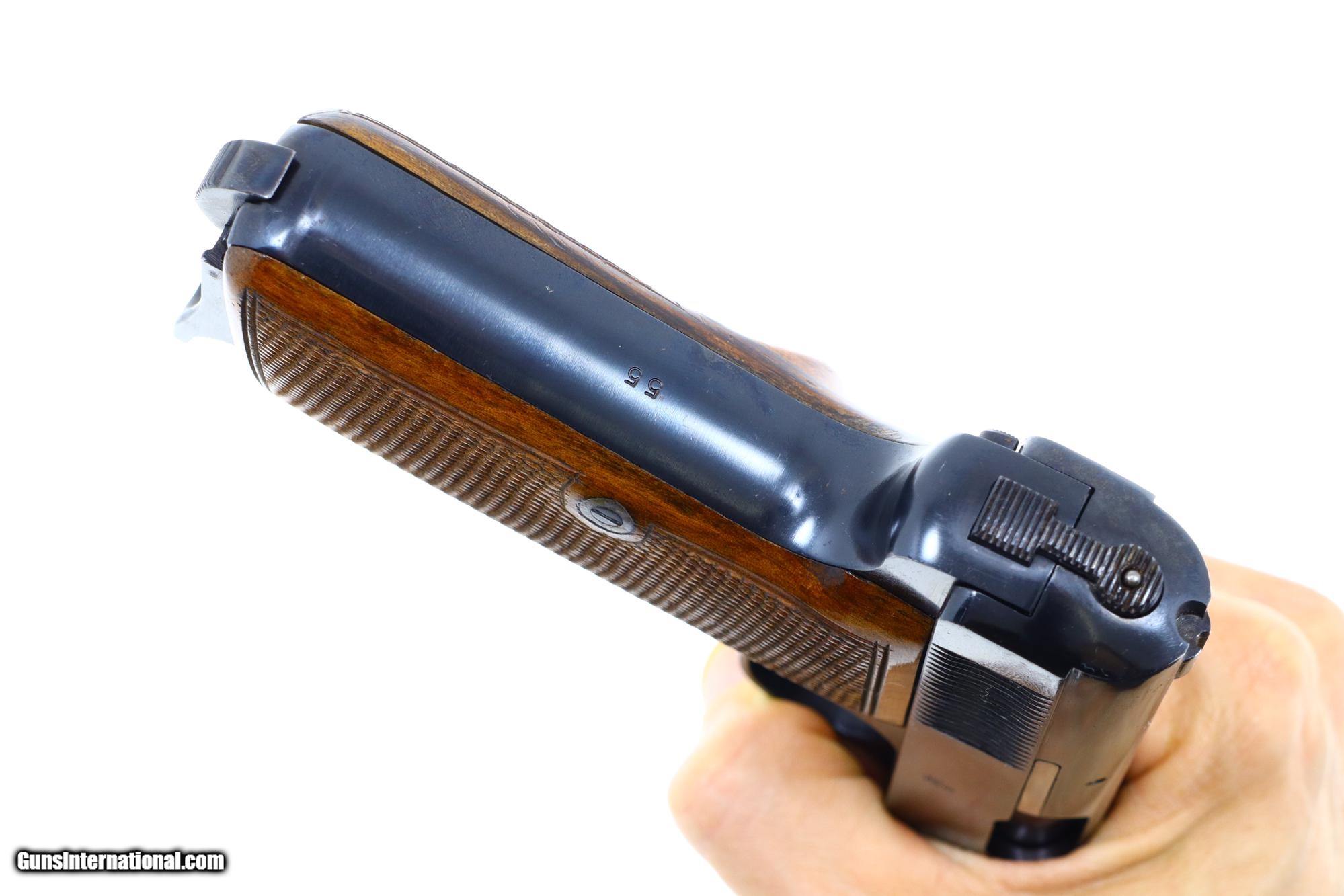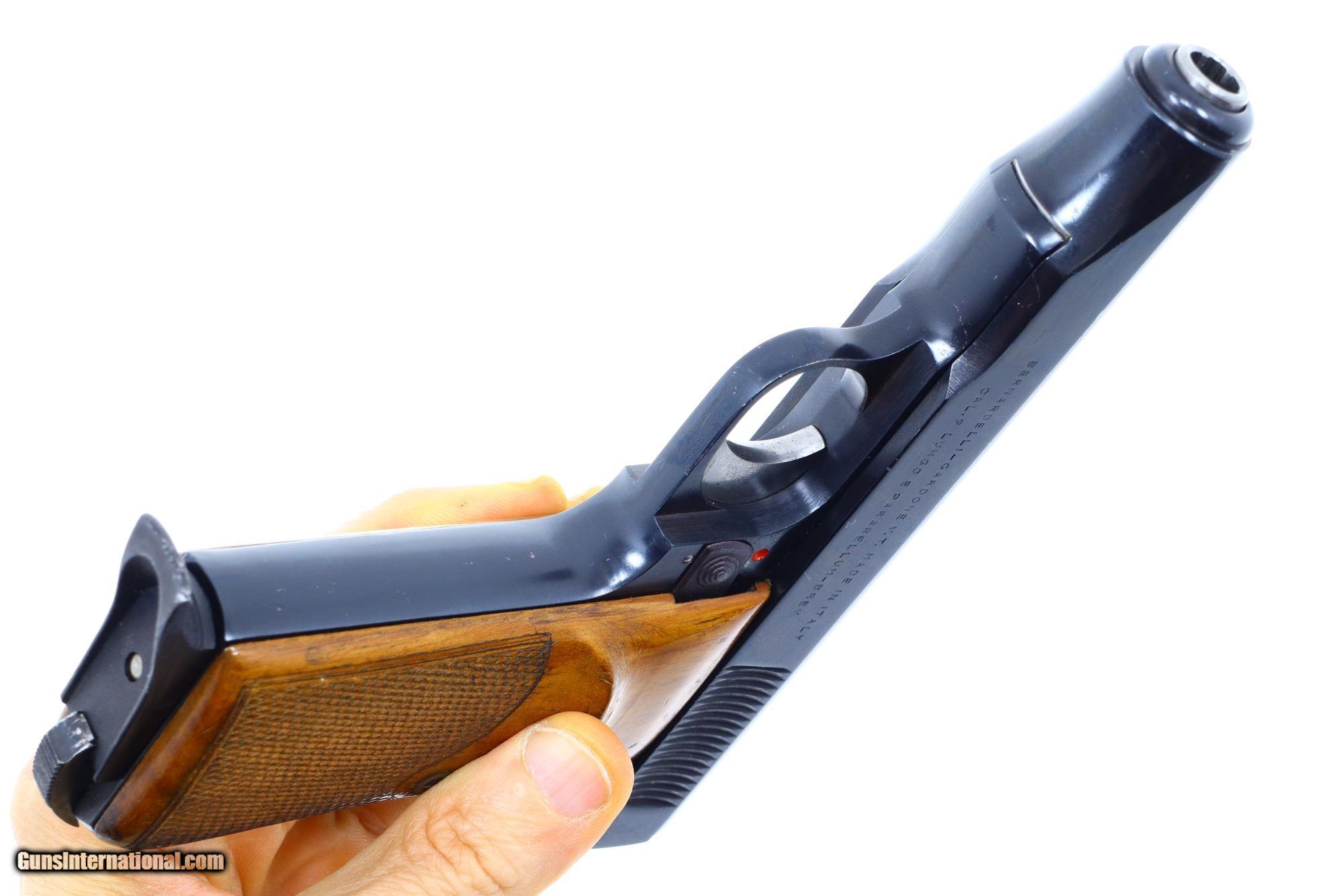 Stunning 99+% bright original salt blue finish. Comparable condition grips and magazine. Mirror bright bore. Perfect manual mechanics. A great, no-excuse, modern era experimental pistol, expressly designed to shoot submachine gun ammunition.