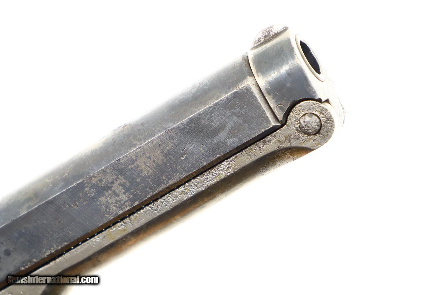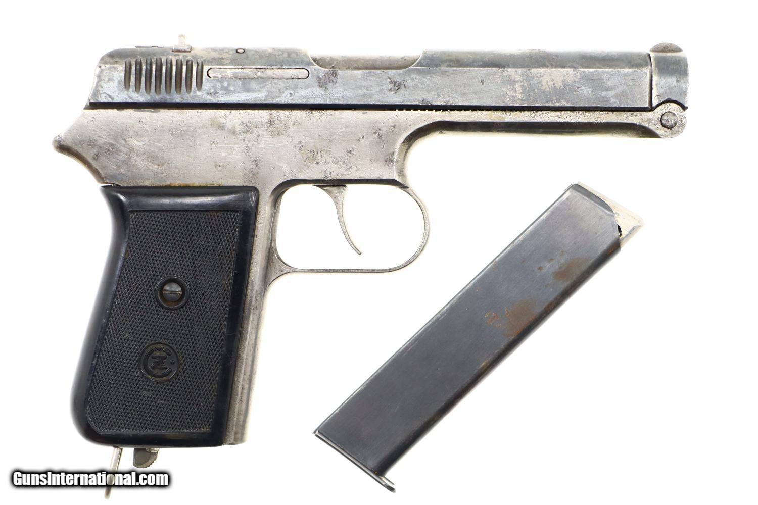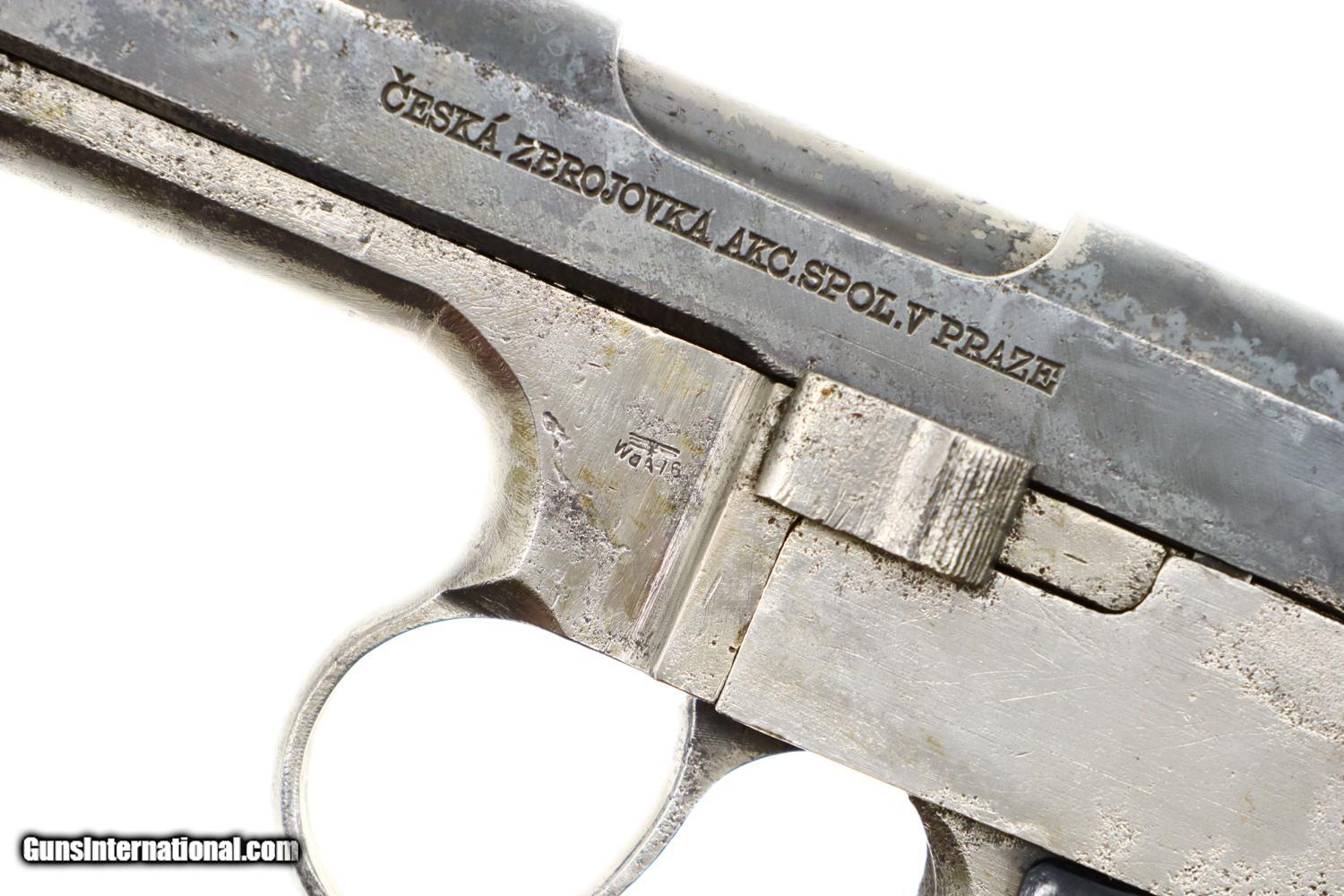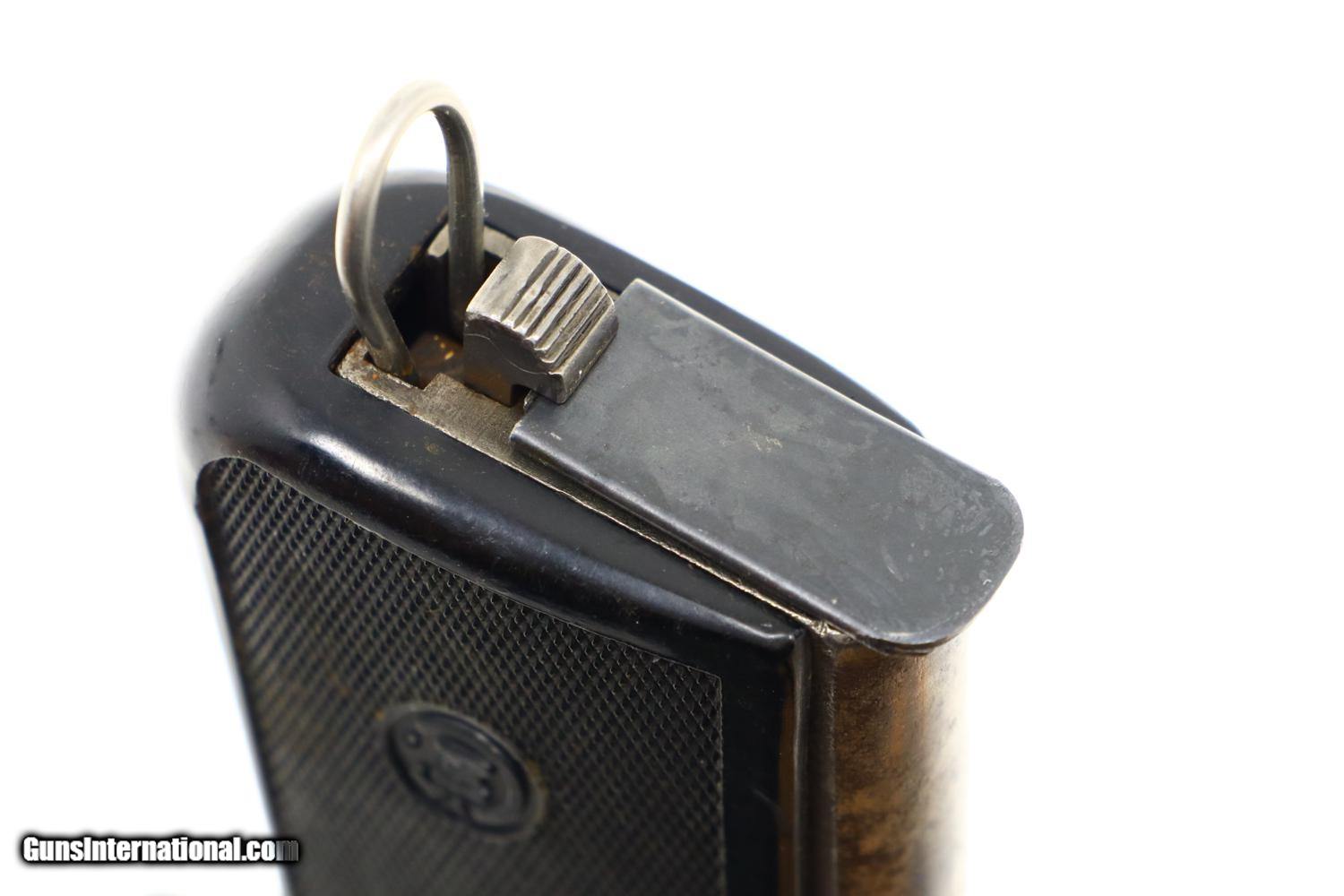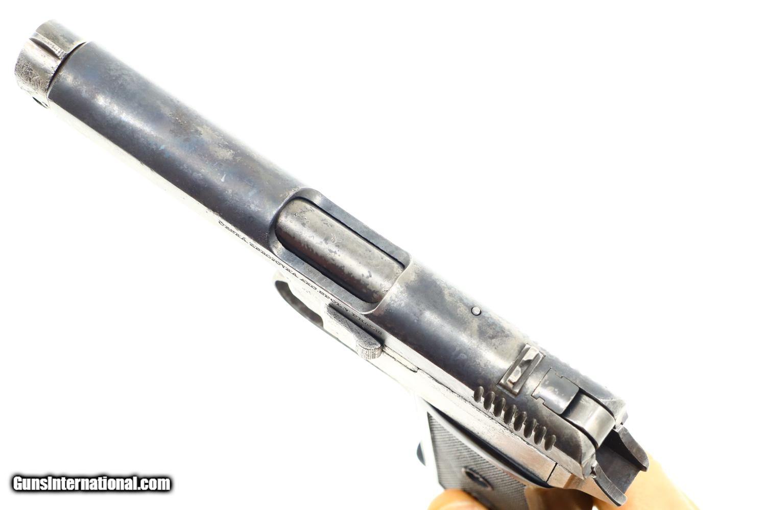Description: Desirable, rarely encountered CZ 38 , made late in WWII, with waffenamt markings, unserialed frame, and black grips. This example DA only. Production estimated at 1000 pistols. Added lanyard ring, right grip screw replacement and reproduction magazine. This late war variation well detailed in the reference Axis Pistols by Jan Still on pages 63-66. Synopsis: CZ38, Late WWII, German Military Pistol, NSN, A-1854 Condition: Fair with slide having mottled blue with patchy pitting. Slide cap and frame with minimal blue in protected areas, elsewhere cleaned with scattered pitting as photographed. VG+ grip. Surprisingly bright bore with sharp rifling. DA-only manual mechanics. ~~Insured shipping fee of $65; most packages shipped using FedEx 2nd Day.~~ SOLD Curio/Relic: Yes Manufacturer: CZ Serial Number: NSN Caliber Info: 9mmK (.380 ACP) |