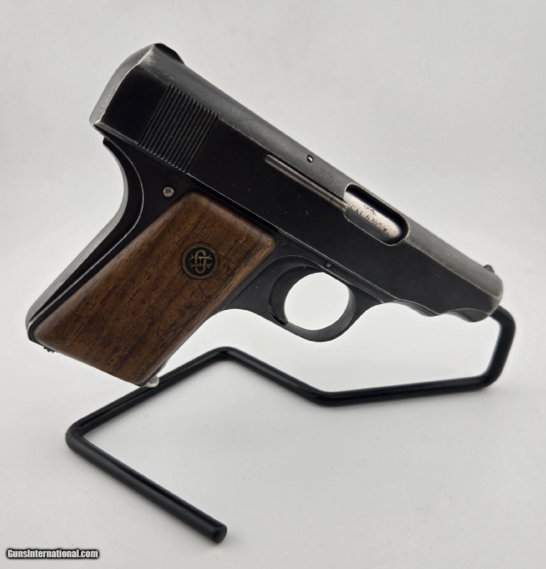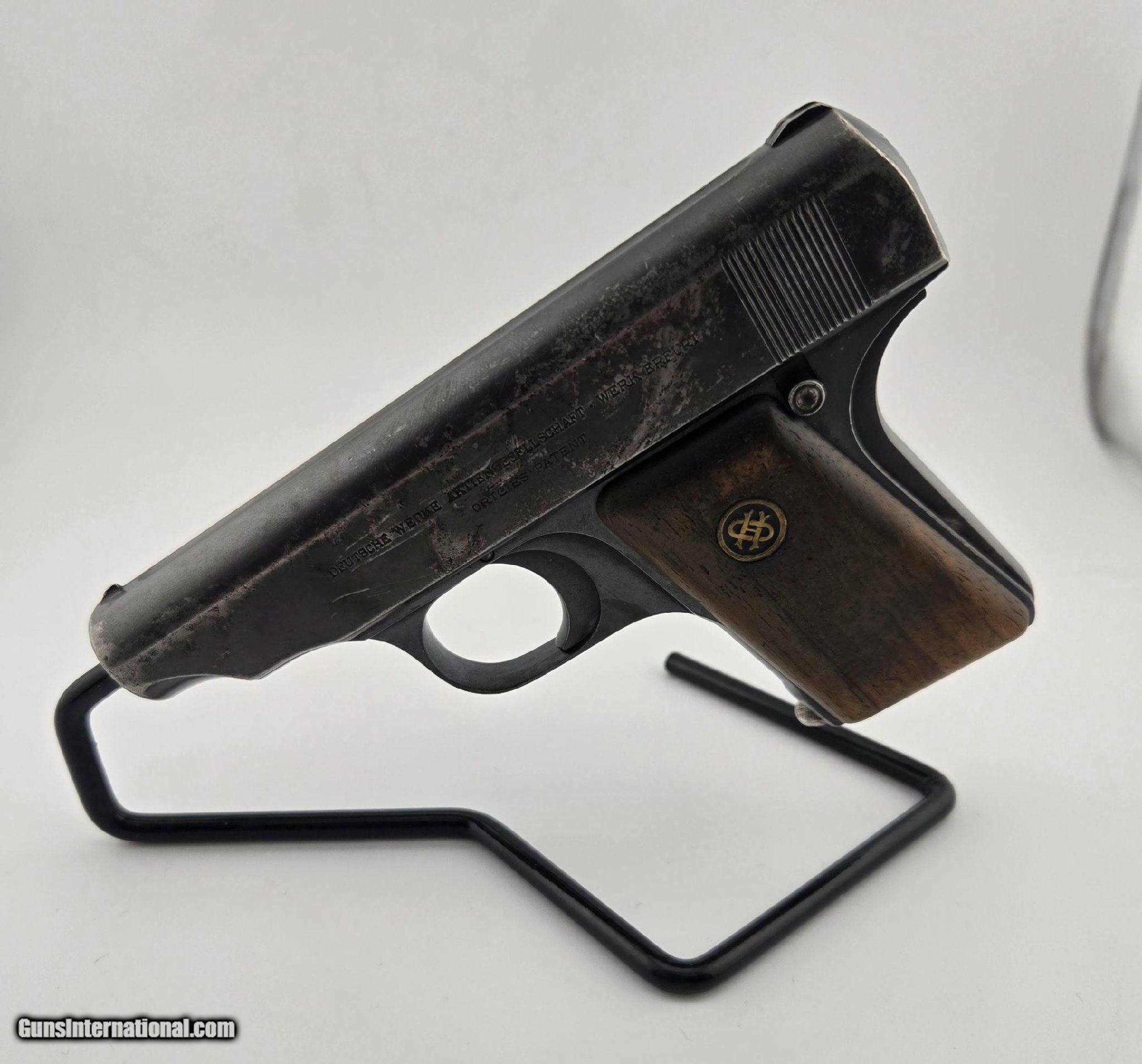 Description: Guns Listing ID: 504056 Deutsche Werke‚‚s roots were in constructing ships for the German military. Ortgies & Co. already had a manufacturing facility in Erfurt, Germany. After buying out Ortgies & Co., Deutsche Werke continued to produce the Ortgies pistol at the same facility instead of tooling another location for firearms production. Deutsche Werke ceased production of the Ortgies pistol in 1923. The Treaty of Versailles impacted all firearms production in Germany, closing many independent firearms manufacturers across the country. The Deutsche Werke Ortgies pistol is a notable example of the quality and craftsmanship behind pre-World War I German firearms. No box one magazin SOLD Manufacturer: DEUTSCHE WERKE Model: 6.35 Caliber Info: 6.35MM/.25 ACP Condition: Used - Non-Certified Barrels: 2.75 Action: SEMI AUTOMATIC Finish: blued |