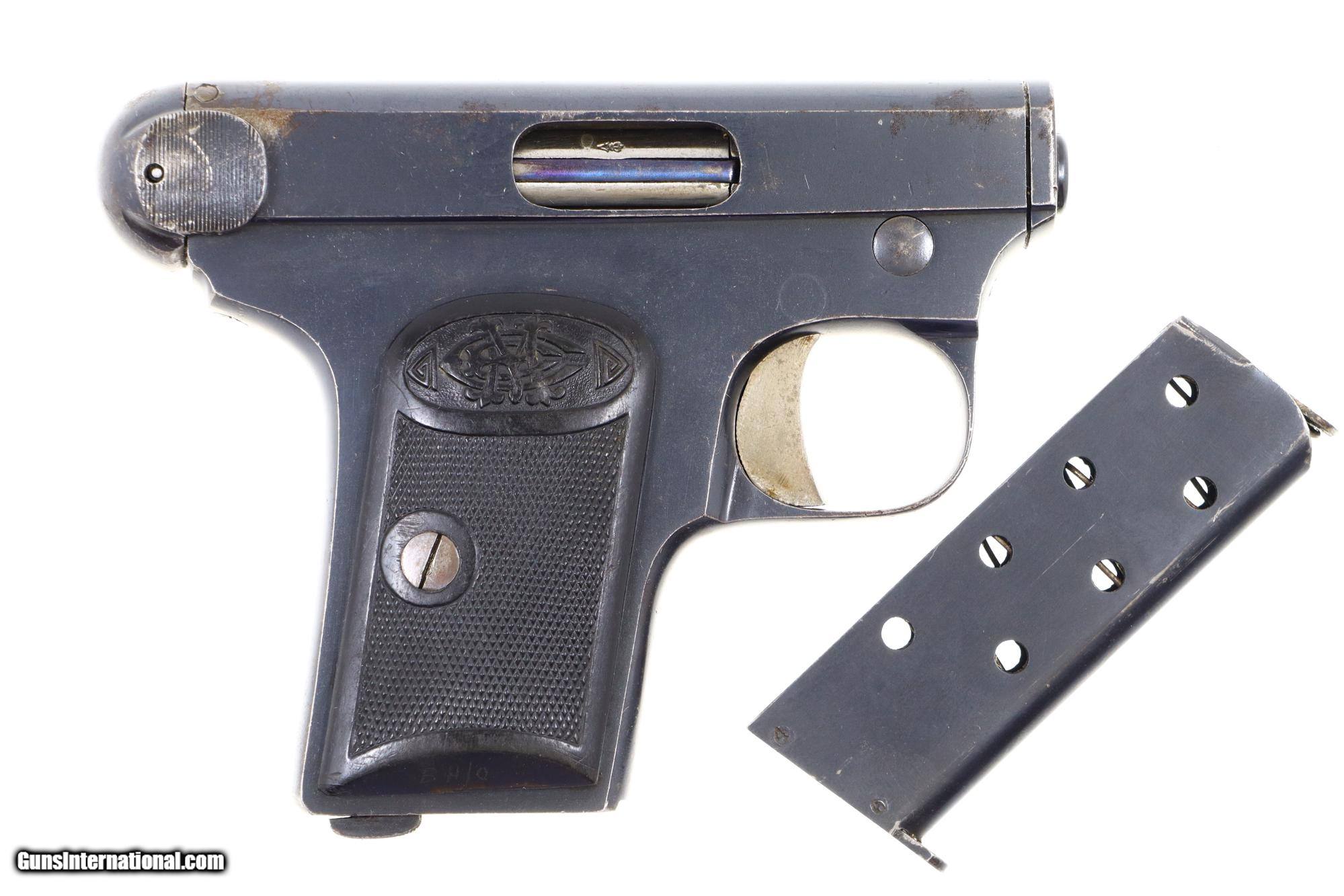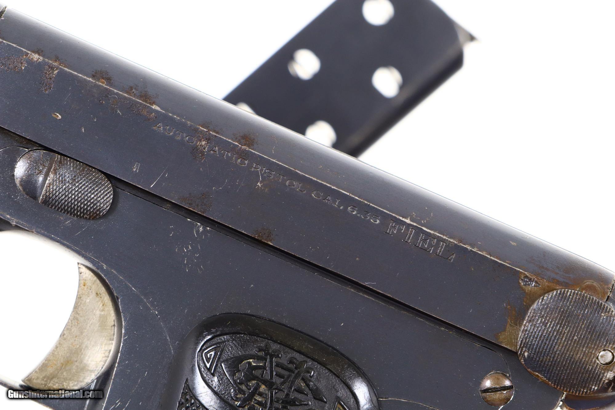 Description: Super rare .25ACP vest pocket pistol, single action blowback, made by Erquiaga, Murguruza y Cia. of Eibar, Spain, with quick release 1.5" barrel, slide marked on the left side "AUTOMATIC PISTOL CAL 6.35 FIEL". This pistol was later proofed in England as reflected by the Crown/V markings on the left side of the slide, rear of cocking knob, bolt, and front of barrel. Hard rubber logoed grips. Each panel secured with a single screw. Bottom magazine release. Unmarked magazine with seven indicator holes and a pinned, enclosed base. Note that the pistol has no safety. Line drawing of this pistol in "Illustrated Encyclopedia of Handguns", English version, by Zhuk, pg 246, 247. Synopsis: Extraordinarily rare Spanish pocket pistol, Fiel, quick barrel release, logoed grips. Condition: VG+ original blue with slide having a hairline crack in the sighting channel at rear as pictured. Filed smoothing at rear of frame, immediately below cocking knob. Left grip chipped at bottom rear. Bright bore with sharp rifling. Perfect manual mechanics. An extremely rare 6.35/.25ACP that does not even appear on a Google search! ~~Insured shipping fee of $65; most packages shipped using FedEx 2nd Day.~~ SOLD Manufacturer: Fiel Serial Number: 46 Caliber Info: 6.35mm |