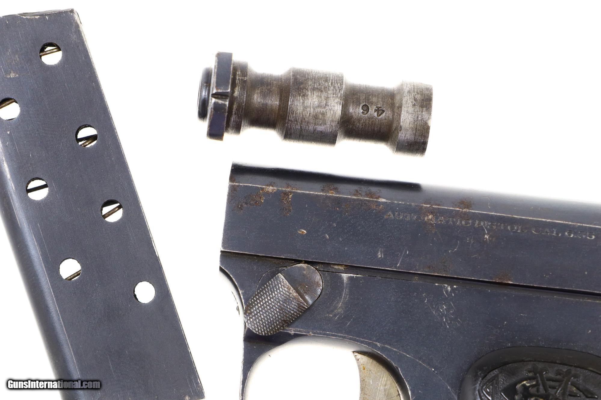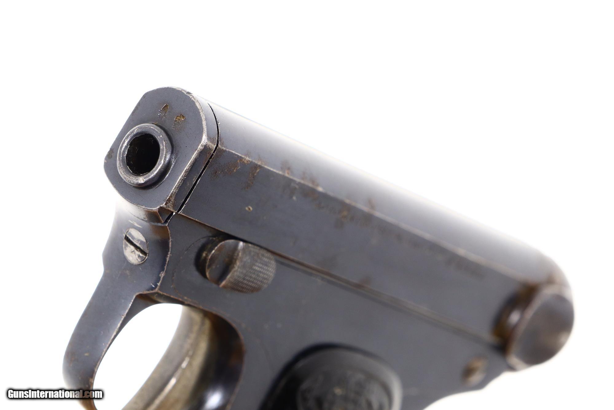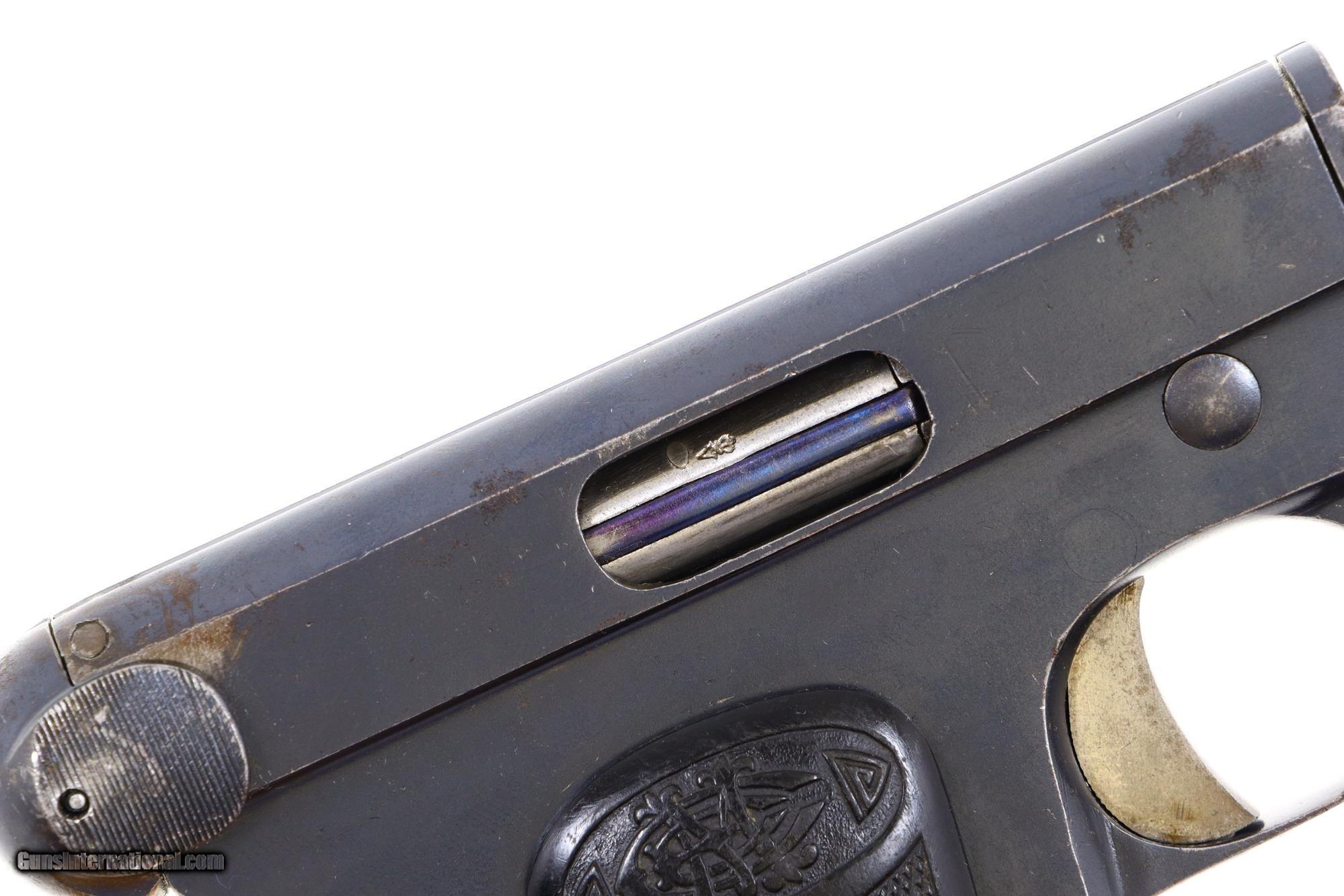 Description: Description: Super rare .25ACP vest pocket pistol, single action blowback, made by Erquiaga, Murguruza y Cia. of Eibar, Spain, with quick release 1.5" barrel, slide marked on the left side "AUTOMATIC PISTOL CAL 6.35 FIEL". This pistol was later proofed in England as reflected by the Crown/V markings on the left side of the slide, rear of cocking knob, bolt, and front of barrel. Hard rubber logoed grips. Each panel secured with a single screw. Bottom magazine release. Unmarked magazine with seven indicator holes and a pinned, enclosed base. Note that the pistol has no safety. Line drawing of this pistol in "Illustrated Encyclopedia of Handguns", English version, by Zhuk, pg 246, 247. Synopsis: Extraordinarily rare Spanish pocket pistol, Fiel, quick barrel release, logoed grips. Condition: VG+ original blue with slide having a hairline crack in the sighting channel at rear as pictured. Filed smoothing at rear of frame, immediately below cocking knob. Left grip chipped at bottom rear. Bright bore with sharp rifling. Perfect manual mechanics. An extremely rare 6.35/.25ACP that does not even appear on a Google search! SOLD Manufacturer: Fiel Serial Number: 46 Caliber Info: 6.35mm |