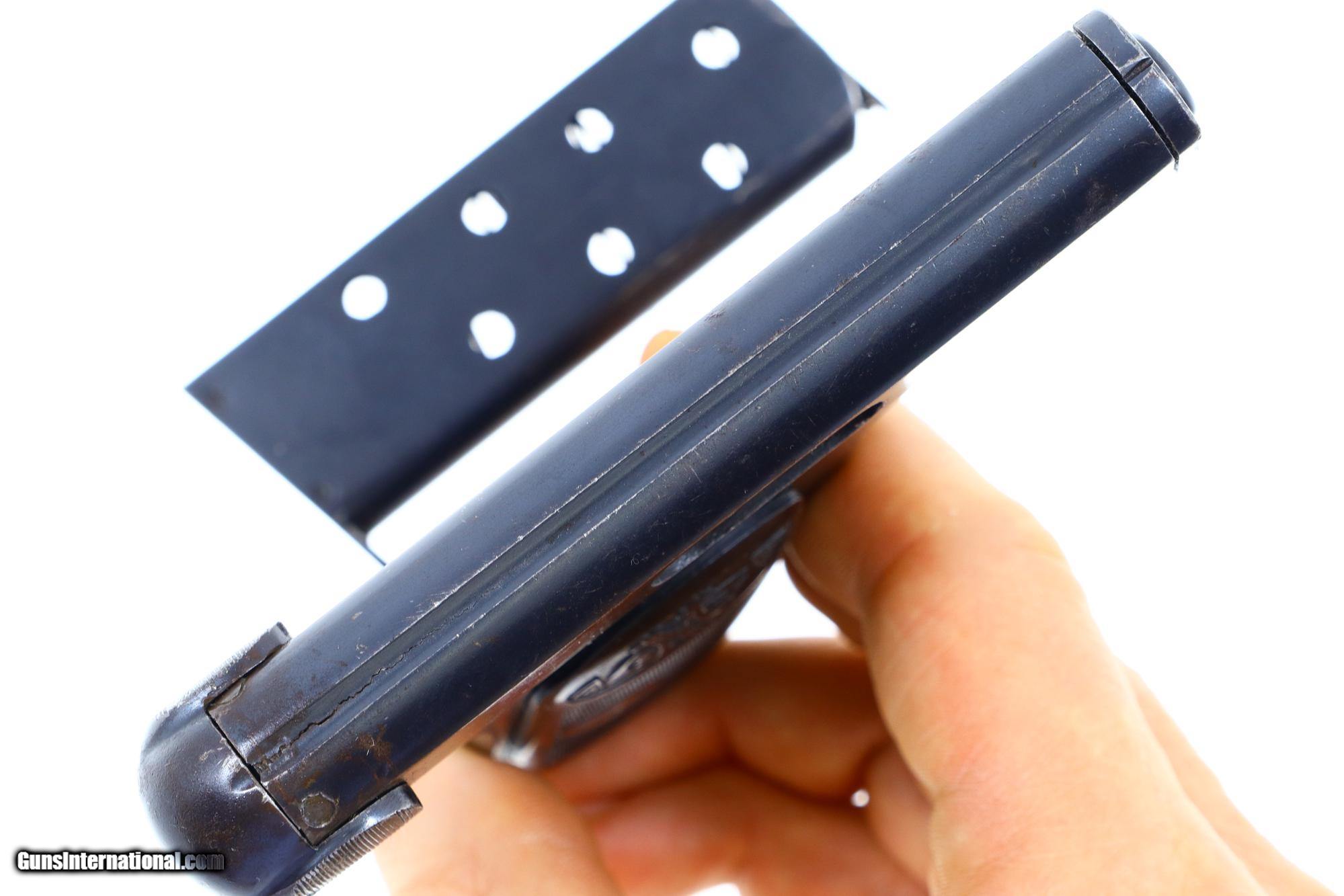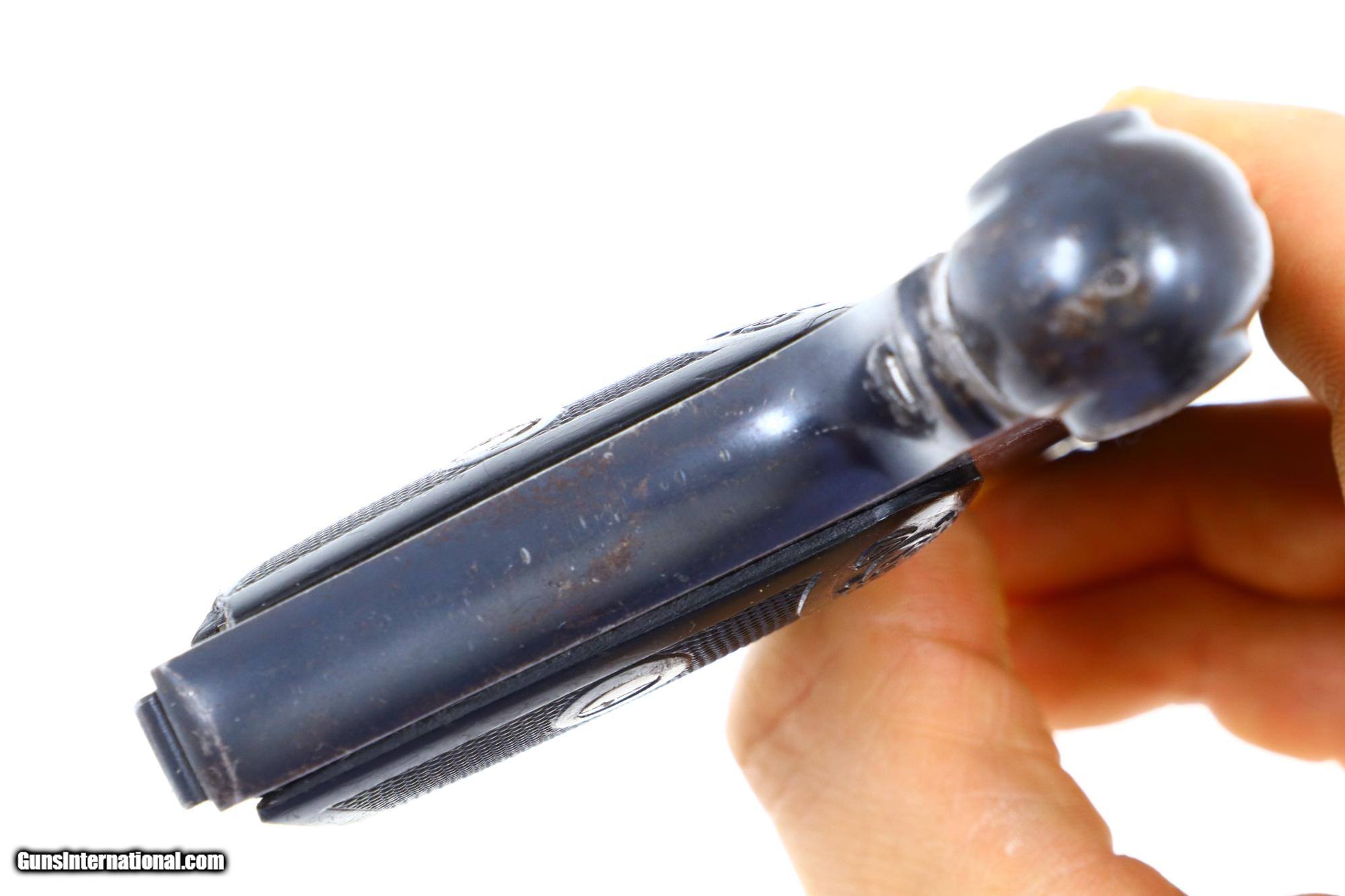 VG+ original blue with slide having a hairline crack in the sighting channel at rear as pictured. Filed smoothing at rear of frame, immediately below cocking knob. Left grip chipped at bottom rear. Bright bore with sharp rifling. Perfect manual mechanics. An extremely rare 6.35/.25ACP that does not even appear on a Google search!