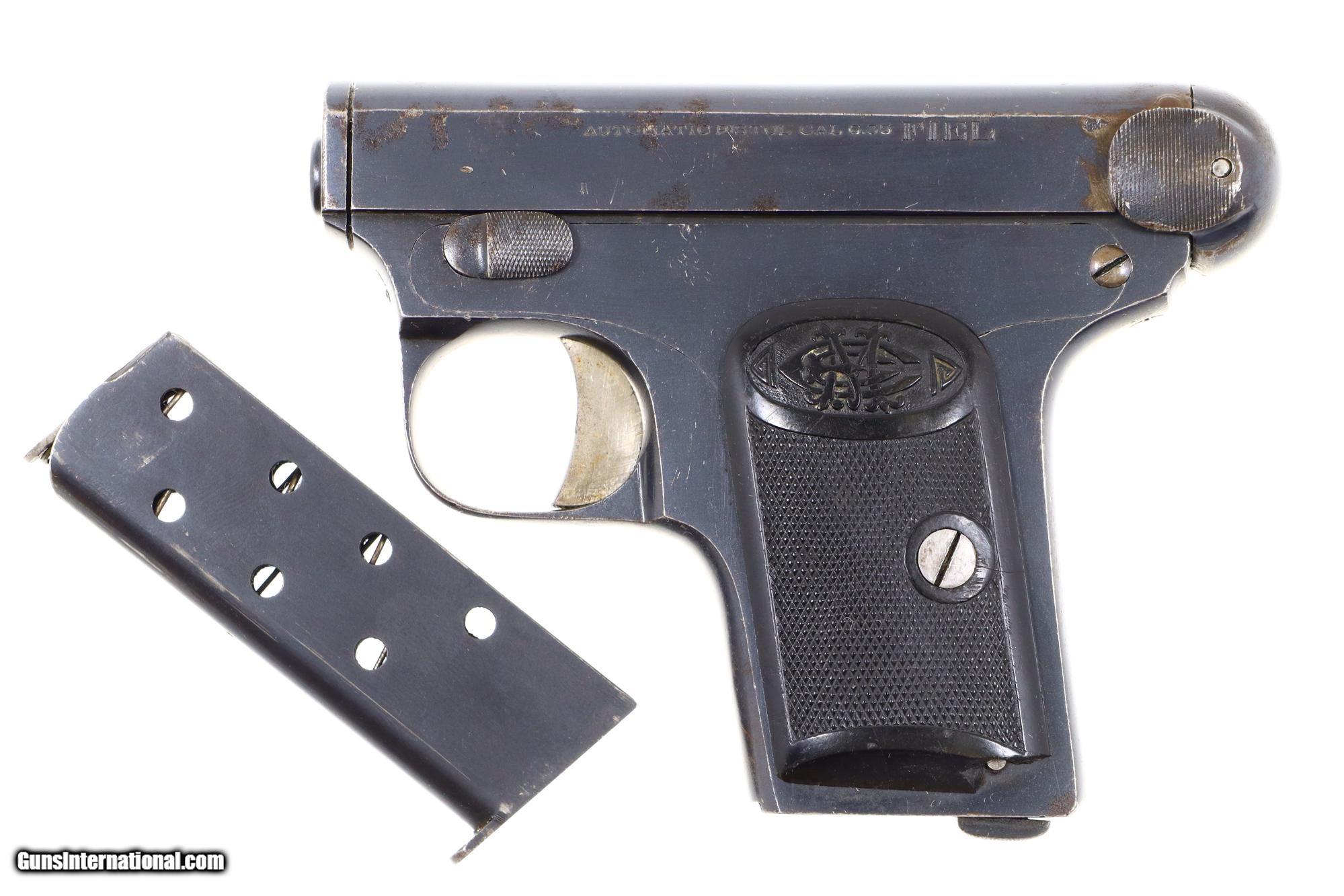 Super rare .25ACP vest pocket pistol, single action blowback, made by Erquiaga, Murguruza y Cia. of Eibar, Spain, with quick release 1.5" barrel, slide marked on the left side "AUTOMATIC PISTOL CAL 6.35 FIEL". This pistol was later proofed in England as reflected by the Crown/V markings on the left side of the slide, rear of cocking knob, bolt, and front of barrel. Hard rubber logoed grips. Each panel secured with a single screw. Bottom magazine release. Unmarked magazine with seven indicator holes and a pinned, enclosed base. Note that the pistol has no safety. Line drawing of this pistol in "Illustrated Encyclopedia of Handguns", English version, by Zhuk, pg 246, 247.