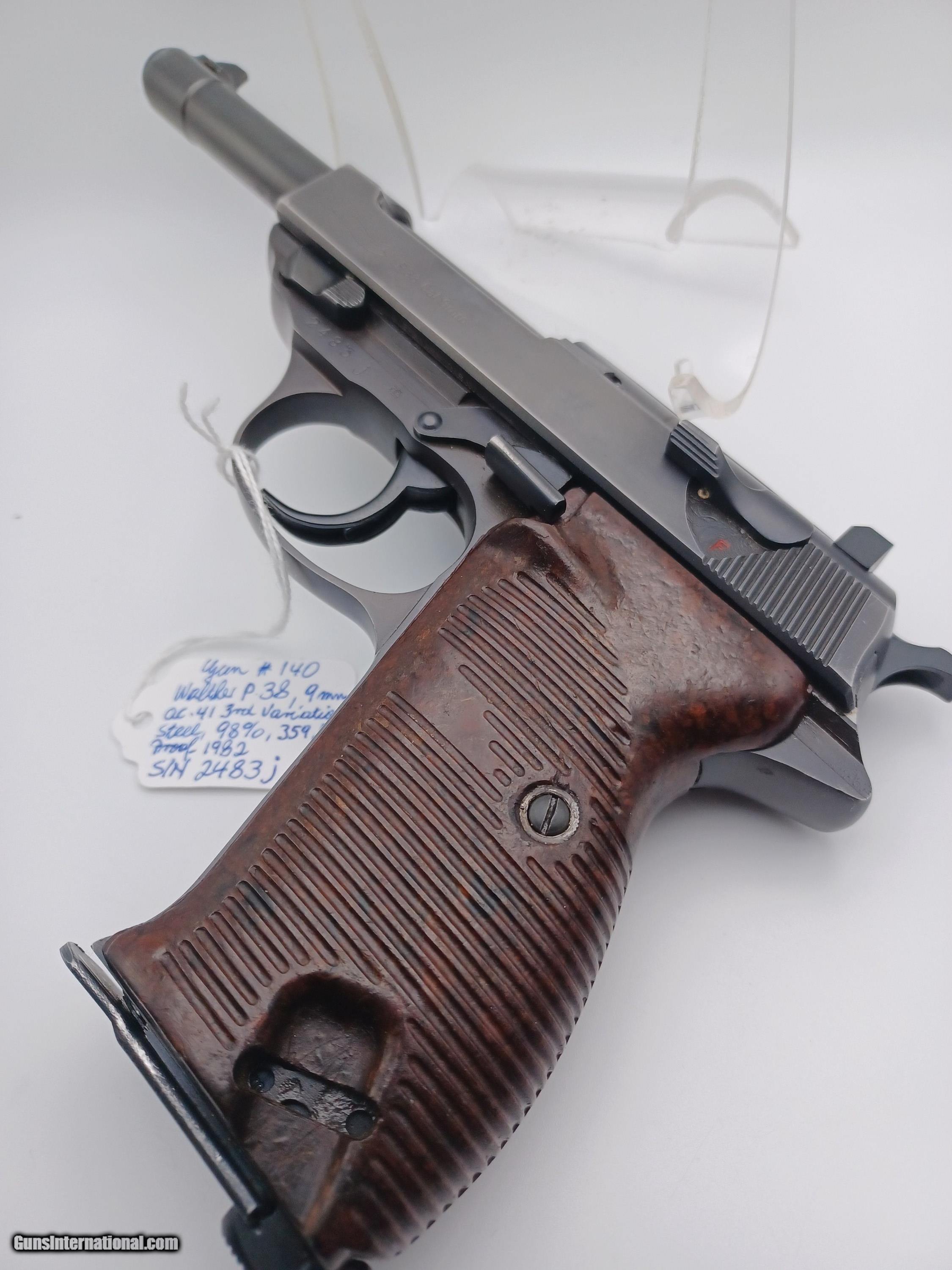 Description: Lister Inventory # 140 Make: Walther Model: P.38 Model Variation: ac-41 – 3d generation Serial Number: 2483j Caliber: 9mm Para Magazine: 8 shot original WALTHER (none-matching) Action Type: Single or Double Action Semi-Automatic Pistol with Decocker Markings: The left side of the slide is marked with “WALTHER P.38 9mm". Marking on the left side of the frame is “2483 j” followed by "Eagle over 359" Waffenamt acceptance stamp. The right side of the slide has the "Eagle over N”" firing proof and “2483” nu7mber next to it. The right side of the frame has the “Eagle over N” and “ID with antler” mark indicating that the pistol was newly proofed in 1983 by the Ulm proof house.he front of the slide is marked “9PARA”.. Barrel Length: 4.9 inches Sights / Optics: Fixed front blade and fixed notched rear sight. Stock Configuration & Conditthion: The grips are the original dark-brown Bakelite grips. The grips are free of major damages, rating in Fine overall condition. Bore Condition: The bore is mirror bright and the rifling is good. Overall Condition: This World War II WALTHER P.38 - ac41- 3rd variation pistol is in very good condition considering that it was used for years at the Russian and Western fronts.. Mechanics: The action functions correctly. We did not fire this handgun. Box, Paperwork & Accessories: None Note: The Walther P38 broke new ground in the design of semi-automatic handguns. It was the first pistol to combine a locked breech with a Double Action/Single Action trigger. The weapon’s hammer could be carried safely with a round in the chamber, and the first shot could be fired in double-action mode, with subsequent shots fired in single-action. Today, this feature has become widely accepted by military and police organizations worldwide. Price: $ 1,490.00 plus $ 50.00 Shipping SOLD Handgun Caliber: 9x19mm Parabellum (9mm Luger, 9x19mm NATO) Manufacturer: WALTHER Model: P38 ac-41 3d Variation Serial Number: 2483j Condition: Very Good Metal Condition: Very Good Bore Condition: Very Good Item Location: Las Vegas NV |