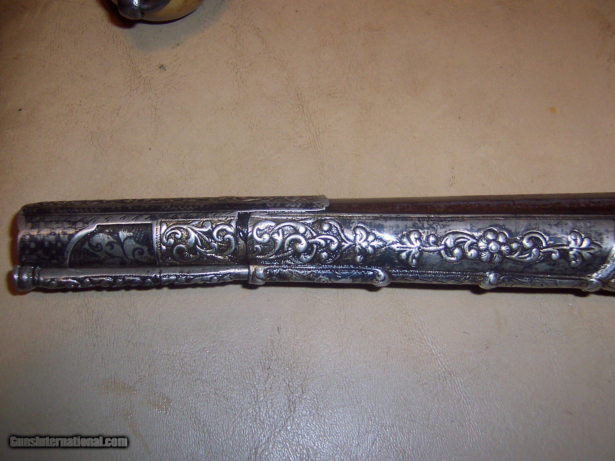 Description: silver repousse stock, all internal parts of lock present , but missing trigger guard and trigger, you restore selling at about half what others want for complete guns , left hand miquelett lock,, may be souliote area, ram rod removelable and looks to be solid silver , gun is 15 inches oa ,55 caliber smoth bore, see other guns on another site SOLD Antique: Yes |