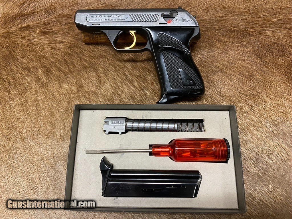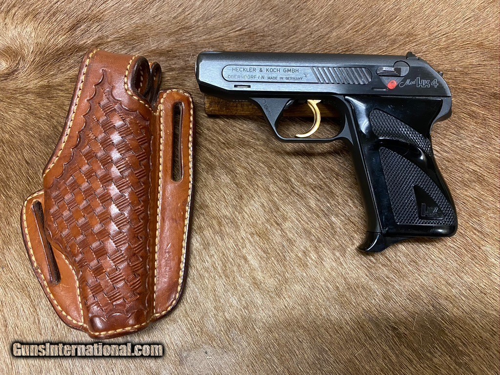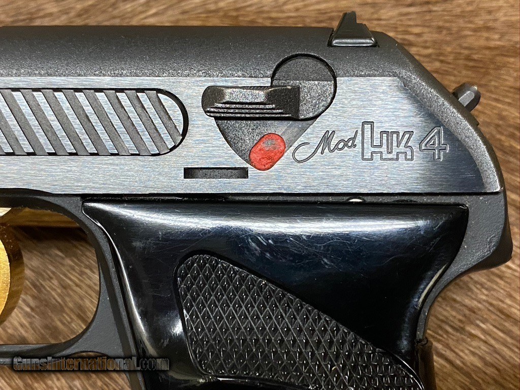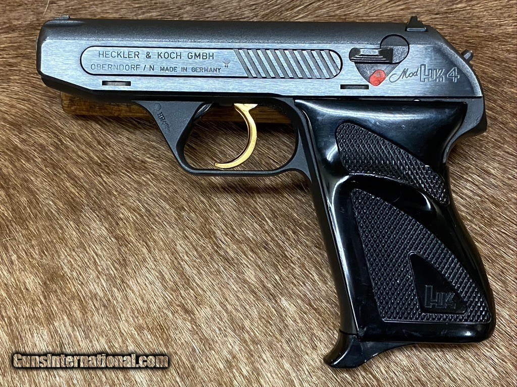 Description: HECKLER & KOCH HK4 9K (380 ACP) W/ GOLD TRIGGER AND 22LR CONVERSION KIT The HK4 is a semi-automatic pistol developed by Heckler & Koch, notable for its modular design that allows it to chamber four different calibers. It was the first pistol produced by Heckler & Koch and is known for its versatility, being able to switch between .22 Long Rifle, 6.35mm (.25 ACP), 7.65mm (.32 ACP), and 9mm Kurz (.380 ACP). The HK4's key feature is its ability to be converted to different calibers by swapping the barrel and magazine. FEATURES OF THIS GREAT SEMI-AUTO GERMAN PISTOL INCLUDE: