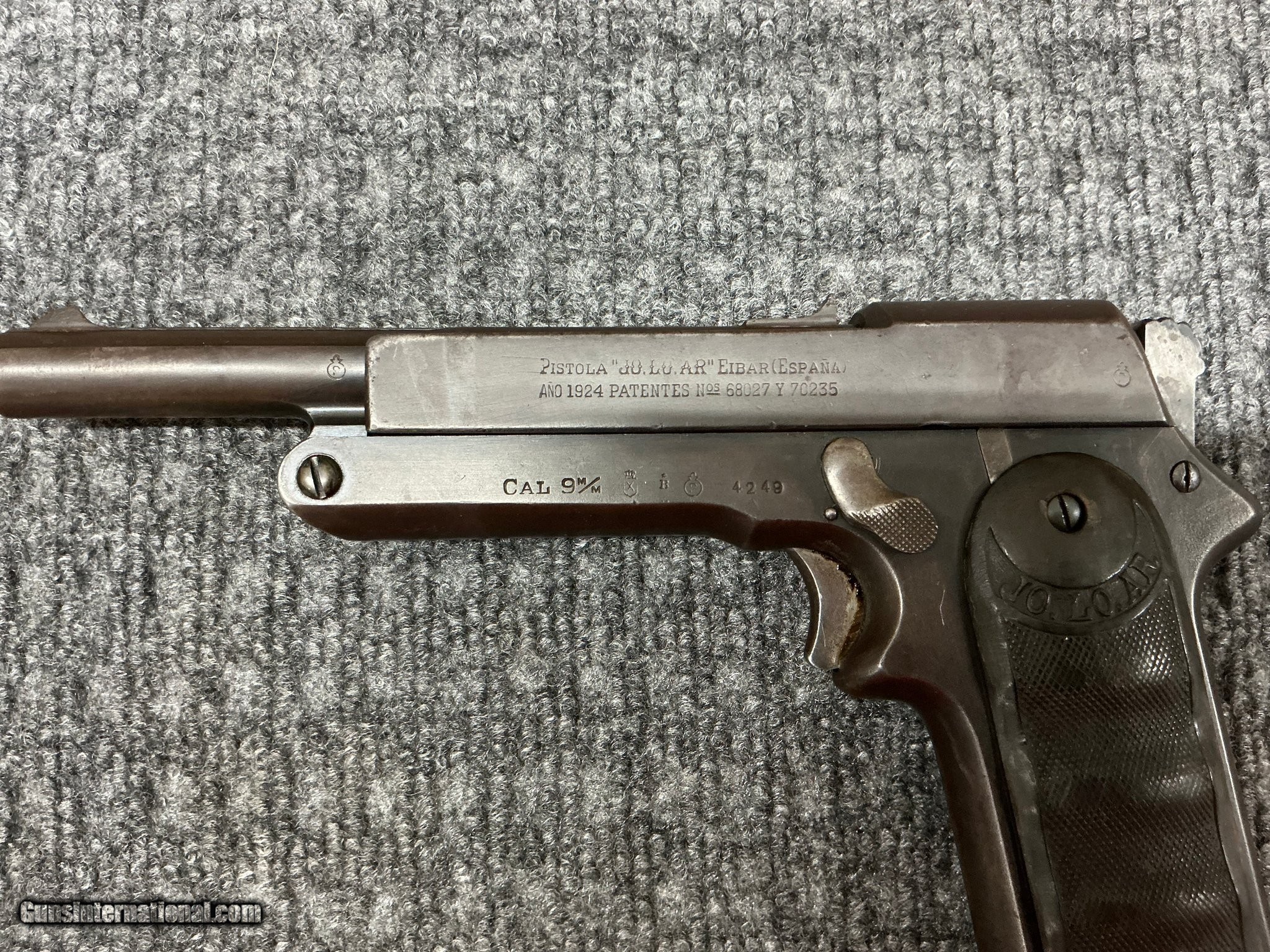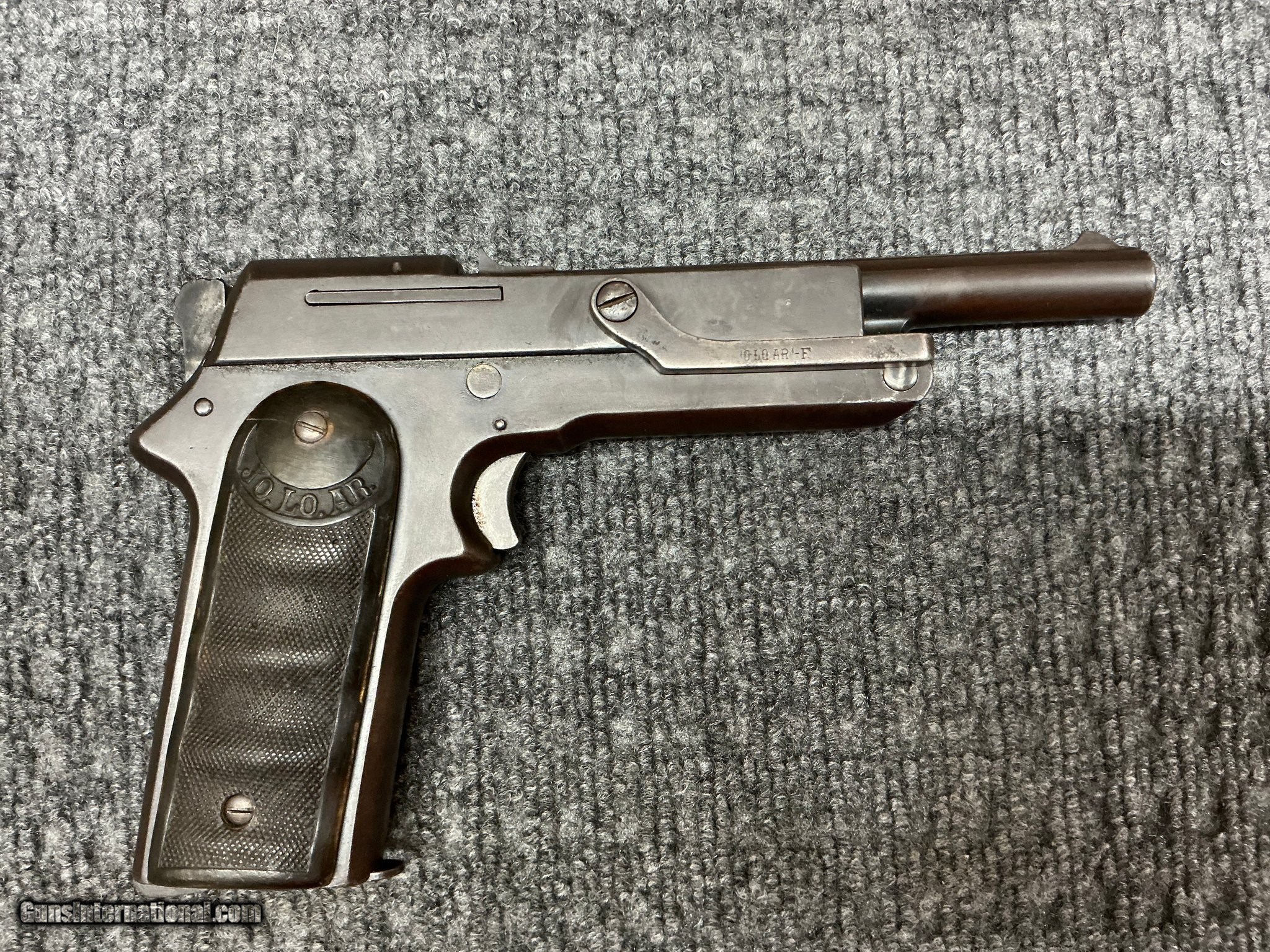 Description: Guns Listing ID: 549242 The JO.LO.AR. was a semi-automatic pistol of Spanish origin and is chambered in various calibres. It is a development of the Extractor Model Sharpshooter pistol and was manufactured from 1924 by Bonifacio Echeveria STAR, with patent by J. Lopez de Arnaiz and renamed the JO-LO-AR, hence the designer‚s initials. The new design lacked the trigger guard and it was chambered in a wide range of calibres from 6.35×16mm (.25 ACP), 7.65×17mm (.32 ACP), 9×17mm (.380 ACP), 9x23mm Largo, with most pistols exported to Peru in the 11.43×23mm (.45 ACP). The JO.LO.AR. pistols have a distinctive lever installed on the right hand side of the frame (referred as a Palanca) enabling the user to carry the pistol with the chamber empty and in time cock the weapon all with one hand which made it useful especially for the Peruvian Mounted Police who were on horseback. Many of these pistols were sold in the United States as surplus and can be considered as collectible firearms today. SOLD Manufacturer: JO.LO.AR. Model: JO.LO.AR Caliber Info: 9MM LUGER (9x19 PARA) Condition: Used - Non-Certified Barrels: 6" BARREL Action: SEMI AUTOMATIC Finish: blue |