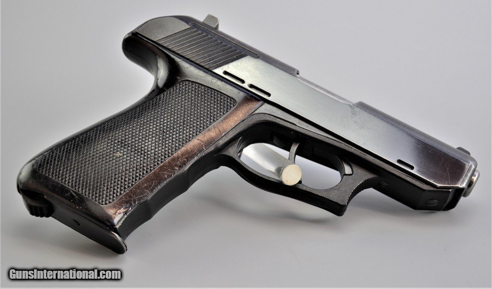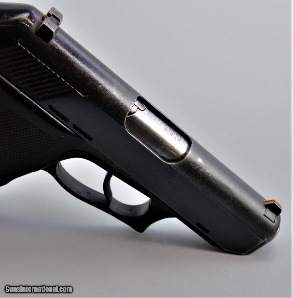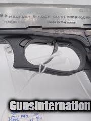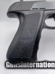 Description: Make: Heckler & Koch Model: P9S Serial Number: 103036 Year of Manufacture: 1973 (early issue) Caliber: 9mm Para Action Type: Double and Single Action with Removable Magazine. The decocker can be actuated to cock the hammer for a single action first shot. The P9S trigger operates as a traditional double action. There is a lever on the left side of the pistol grip to both decock a cocked hammer or to manually re-cock it for a single action first shot Markings: The left side of the slide is marked with the HK logo, “Mod. P9S”, “Heckler & Koch GMBH Oberndorf/Neckar / US.Pat.No.3.566.745 Made in Germany”, “1 03 036” and a Bundeswehr acceptance mark. The left frame has “103 036” and two BW acceptance marks. The right side of the frame is marked “73” indicating 1973 as year of manufacture. The barrel at the ejector port is marked with “103 036 HK” and “9 Para” as caliber. Barrel Length: 4 1/8” Sights / Optics: The tall front sight blade has a yellow vertical stripe and is dovetail set into the slide. The rear sight is a square notch with red vertical stripe on each side of the notch. Stock Configuration & Condition: The sculptured plastic grip has a thumb rest on left side and is finely checkered with a HK logo on the left side. The grip rates in about Very Good overall condition indicating that the pistol was not handled/shot much. Type of Finish: Both sides of the slide have smooth, high gloss finish. The top of the slide and the frame have a black matte phosphate finish. The edges of the muzzle and the left sideof the slight shows some holster wear. It looks that this German militarye gun was carried a lot but fired very seldom. There are small scratches or user’s marks anywhere on the pistol. Looks like carried in a holster but seldom taken to the range or into the fields. Finish Originality: 93% Original Bore Condition: The bore is bright and the rifling is polygonal. There is no erosion in the bore Overall Condition: This handgun retains about 93% of its metal finish. Overall, this handgun rates in about Very Good condition. It is a very rare EARLY edition of the H&K P9S with the heavy “Seals” trigger guard. Mechanics: The single / doubleaction trigger pull is crisp. The safety blocks the firing pin when engaged, allowing the hammer to fall without firing the pistol. The decocker serves to cock or un-cock the hammer as well as functioning as a slide release when fully depressed. To un-cock the hammer, the safety is engaged, the de-cocker depressed and the trigger then pulled and released while holding the de-cocker down. The pistol can be shot in single action only mode by swiveling the trigger stop in the trigger guard up until it blocks the trigger from going back far enough to cock and release the hammer. The single action trigger is light and very crisp, although with some take-up, as expected. You can adjust the trigger with the fine adjustment feature also found on this pistol. Assessment: This is a unique pistol with a multi-purpose decocker that can be used to cock and de-cock the hammer as well as release the slide It is great mechanical condition and it should be, as it was built with typical German reliability. Productions was ceased in 1986 and recent prices show a steep increase. The availability of more original HK mags sweetens the deal.oweer 48) Price $ 1,250 plus $50.00 (shipping lower 48) SOLD Curio/Relic: Yes Handgun Caliber: 9x19mm Parabellum (9mm Luger, 9x19mm NATO) Manufacturer: Heckler & Koch Model: P9S Combat Serial Number: 103036 Barrel Length: 4 1/8 Condition: Good Metal Condition: Good Item Location: Las Vegas NV |