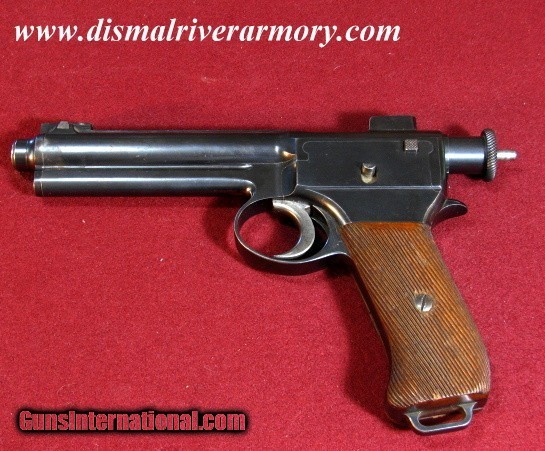 Description: Roth Steyr Model 1907 in 8mm Roth Steyr. This pistol was adopted by the Austro-Hungarian Army in 1907 and was the first semi-automatic pistol adopted by the land army of a major power. Total production was approximately 99,000 units. This piece exhibits vert strong rifling with slight corrosion in the grooves. A very shootable bore. Grips in very good condition. Bluing appears to be original and at 97% with slight speckling. Marked "Waffenfabrik Steyr" on the barrel rib. A very nice piece of militaria. SOLD |