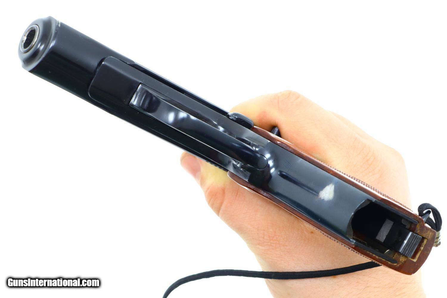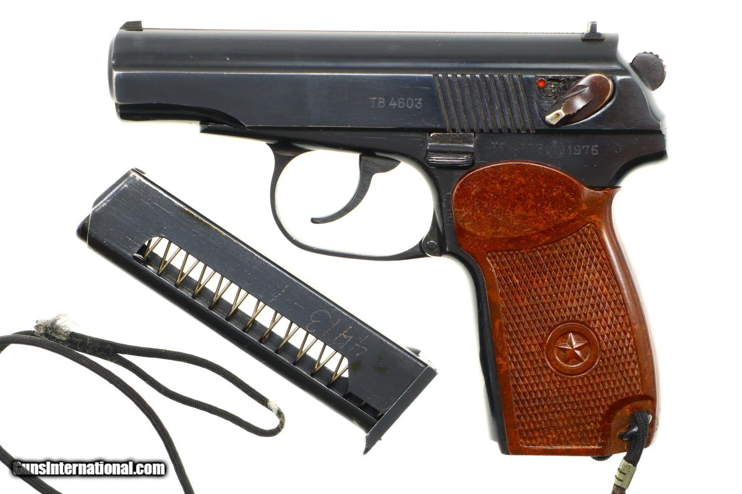 Standard configuration Makarov with fixed front sight and drift adjustable rear sight. Full serial number on left side of slide and left side of frame. Izhevsk Arsenal marking on left side of frame along with manufacturing date of "1976". Standard configuration safety and Bulgarian-style magazine electropenciled “4413-1”. Single piece reddish maroon plastic grip with two checkered panels impressed with encircled 5 pointed star. Black lanyard cord.