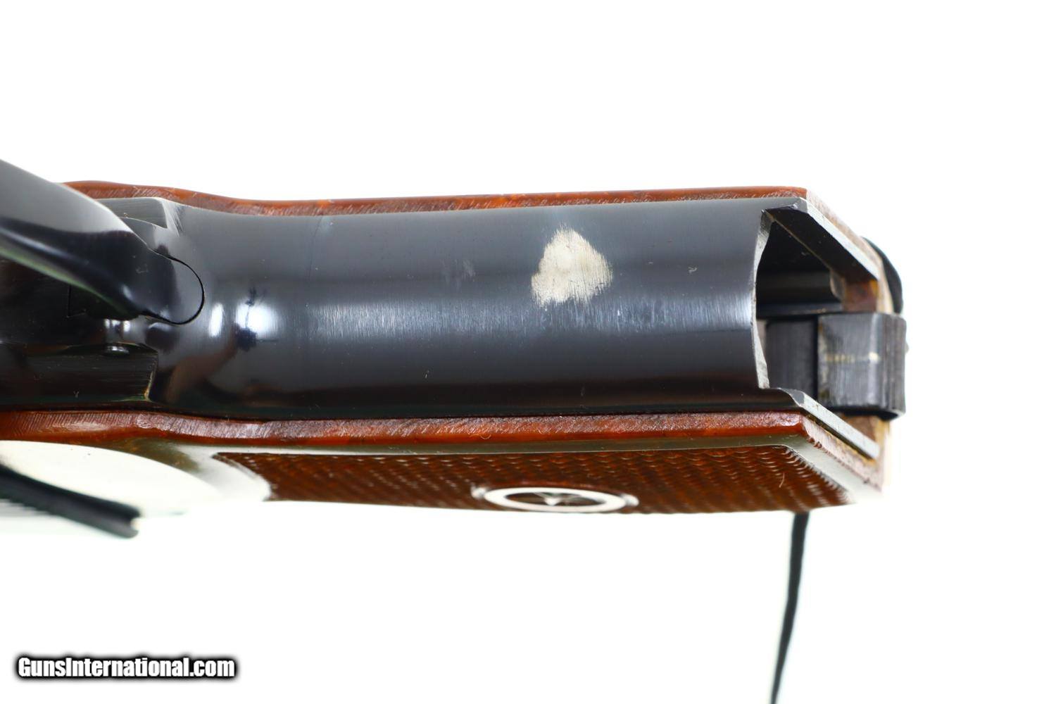 Description: Description: Standard configuration Makarov with fixed front sight and drift adjustable rear sight. Full serial number on left side of slide and left side of frame. Izhevsk Arsenal marking on left side of frame along with manufacturing date of "1976". Standard configuration safety and Bulgarian-style magazine electropenciled “4413-1”. Single piece reddish maroon plastic grip with two checkered panels impressed with encircled 5 pointed star. Black lanyard cord. Synopsis: Russian Izhevsk, Makarov, Military, 1976, TB4603, A-727 Condition: 98% bright original salt blue with fading of blue on front strap and barrel hood as imaged. Mirror bore. Perfect manual mechanics. SOLD Manufacturer: Izhevsk Model: Makarov Serial Number: TB4603 Caliber Info: 9mm Condition: Excellent |