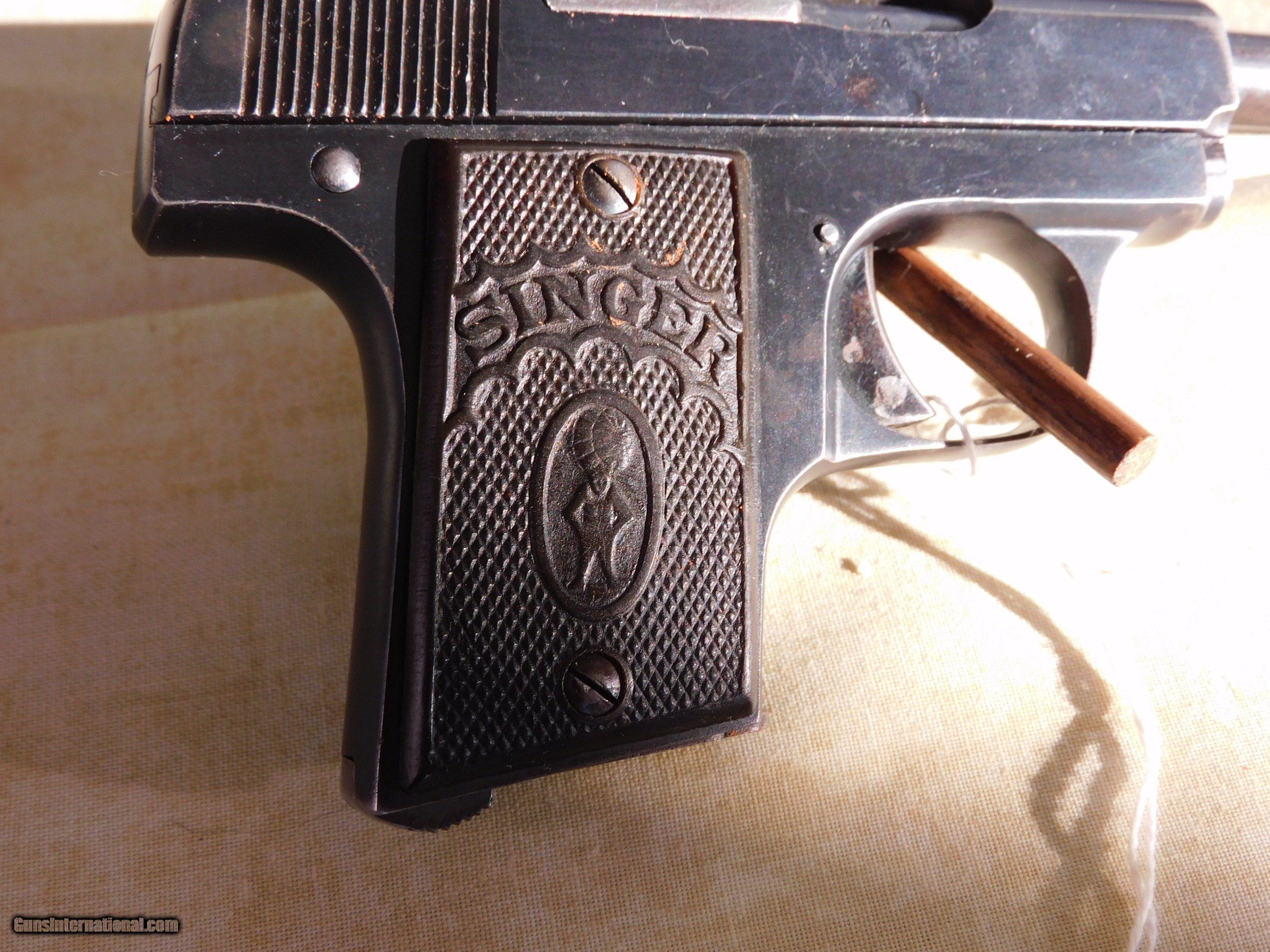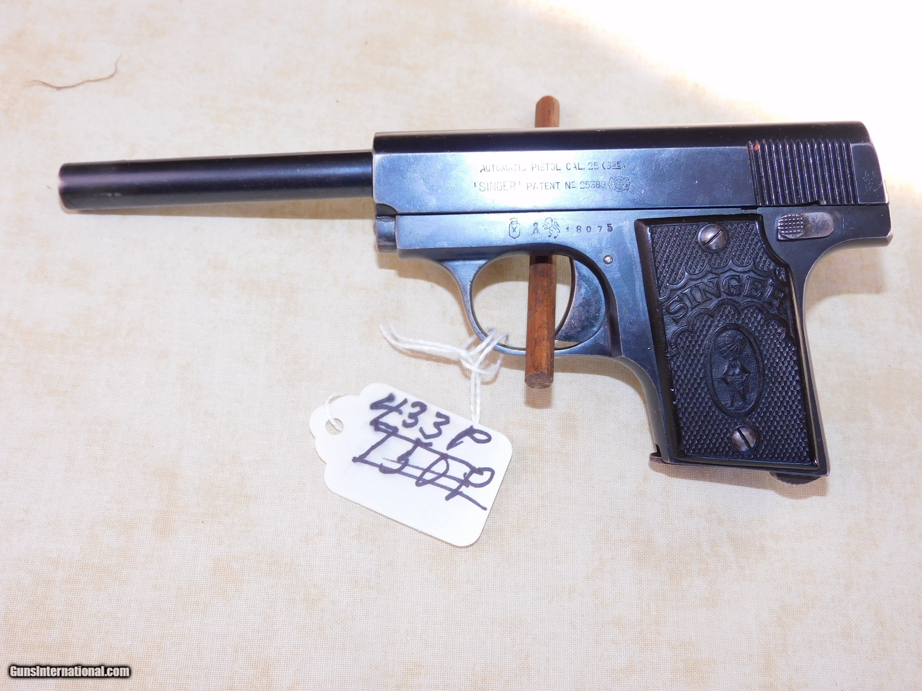 Description: #433P SINGER 25 CAL. AUTO PISTOL, 25 CF, SN 180XX, 5” unusual bbl., probably Belgian or Spanish, mint hard rubber grips marked “Singer”, with a figure of a man holding a globe, VG bore, 95% blue, very unusual, have never seen another. $750 FFL required Curio/Relic: Yes Price: $750.00 Contact Seller |