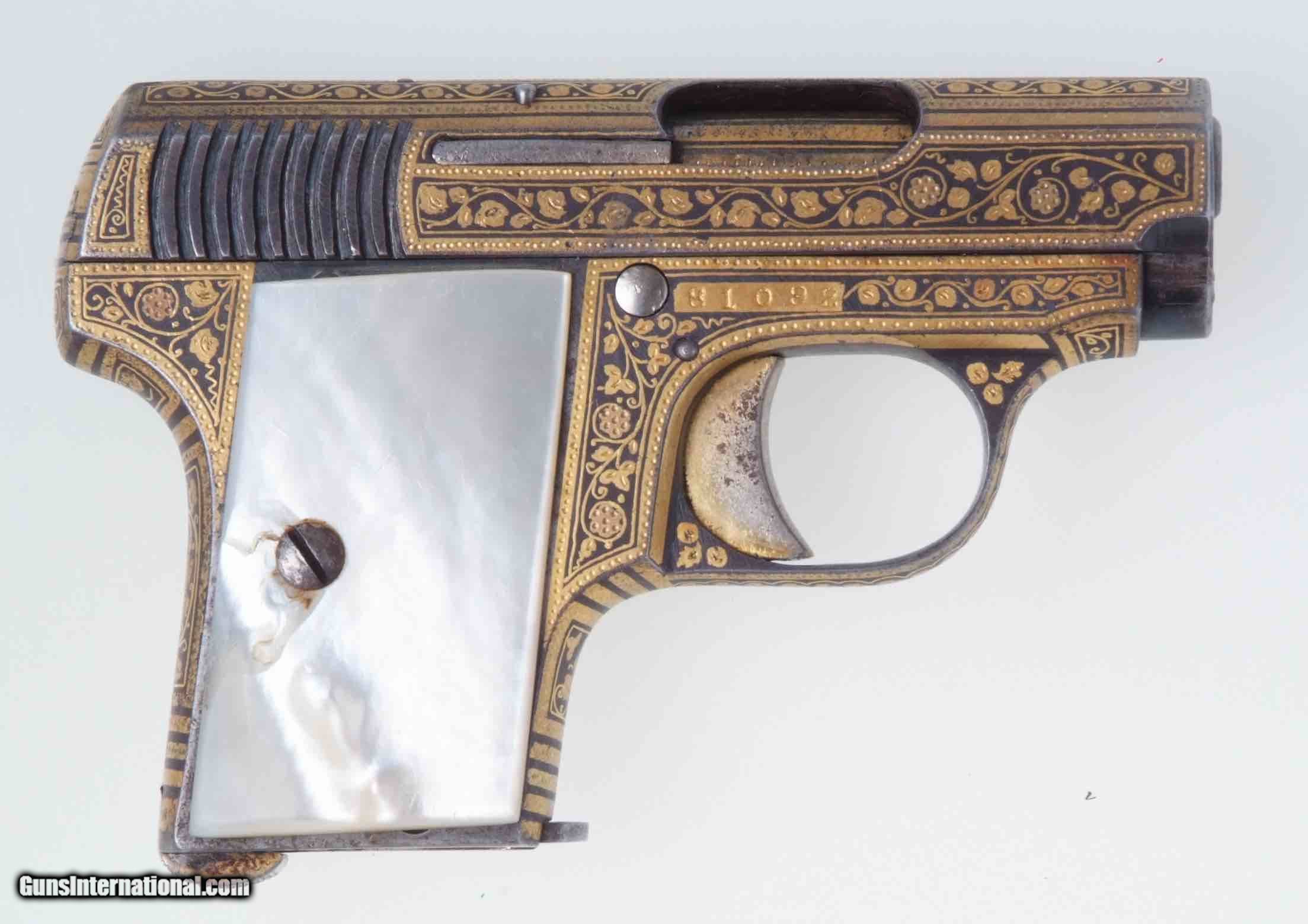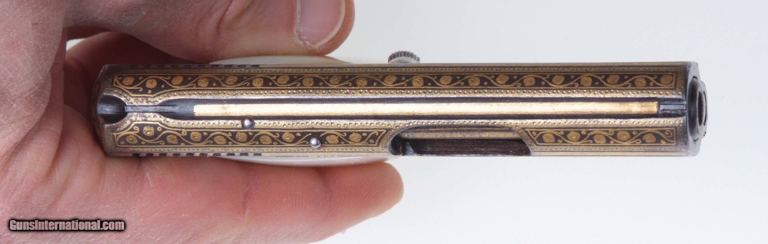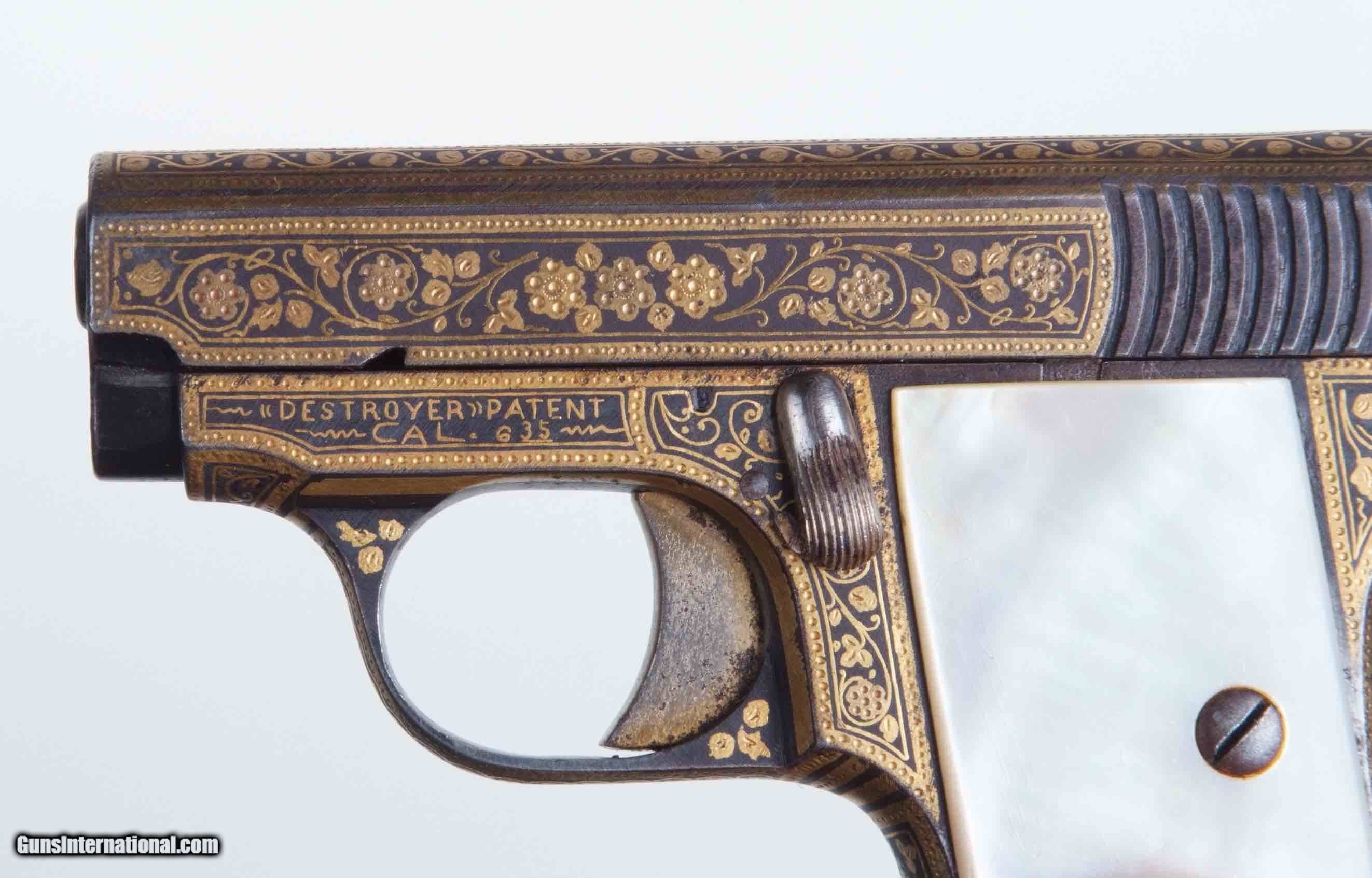 Description: Standard configuration Destroyer with fixed front and rear sight and 2.25” barrel measuring 4.5” length and 3” height. Left frame marked “DESTROYER PATENT/CAL. 6.35.” Full Serial number on right side of frame. Damascening applied in a floral/scroll pattern with accented border over most surfaces, including the exposed portion of the barrel hood, with classic Eibar-inspired dragon on backstrap. Magazine floorplate and screwheads are also damascened with a gold wash having been applied to the thumb safety, trigger, and magazine release. In fact, the only portions of this pistol not embellished are the front of the muzzle, the inside of the trigger guard and the bottom of the frame. Smooth mother-of-pearl grips. Blued magazine body with five indicator holes and damascened floorplate. Disassembly shows major parts with matching assembly number “336”. Synopsis: Luxurious Gold Damascened Destroyer, nearly 100% coverage, with mother of pearl grips. Condition: Approximately 97% of the gold damascening with sharp edge wear from careful use. As true for many of these pistols, much of the gold wash from the thumb safety has faded with comparable fading over grip screws. Left grip is nearly perfect. The right grip has a noticeable chip extending back from the screw. Bright bore with shallow rifling. Perfect manual mechanics. One of the most appealing of the Spanish pocket pistols with a REALLY memorable name. For more information about gold damascene guns, click here. A HISTORIC INVESTMENT! ~~Insured shipping fee of $65; most packages shipped using FedEx 2nd Day.~~ SOLD Manufacturer: Spanish Destroyer Serial Number: 81092 Caliber Info: 6.35 mm |