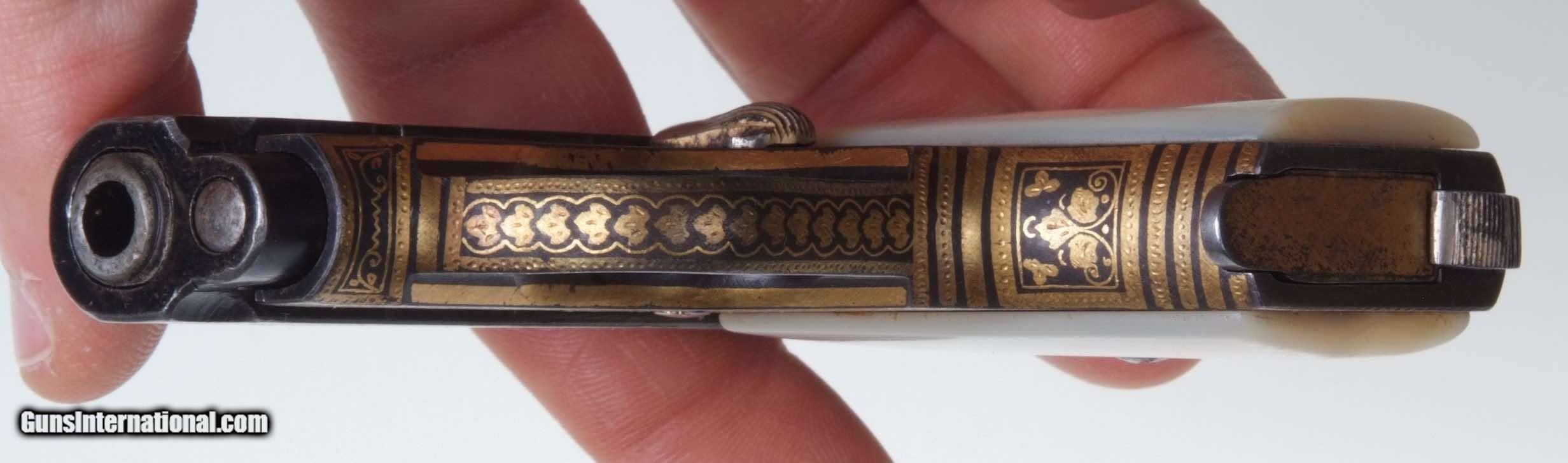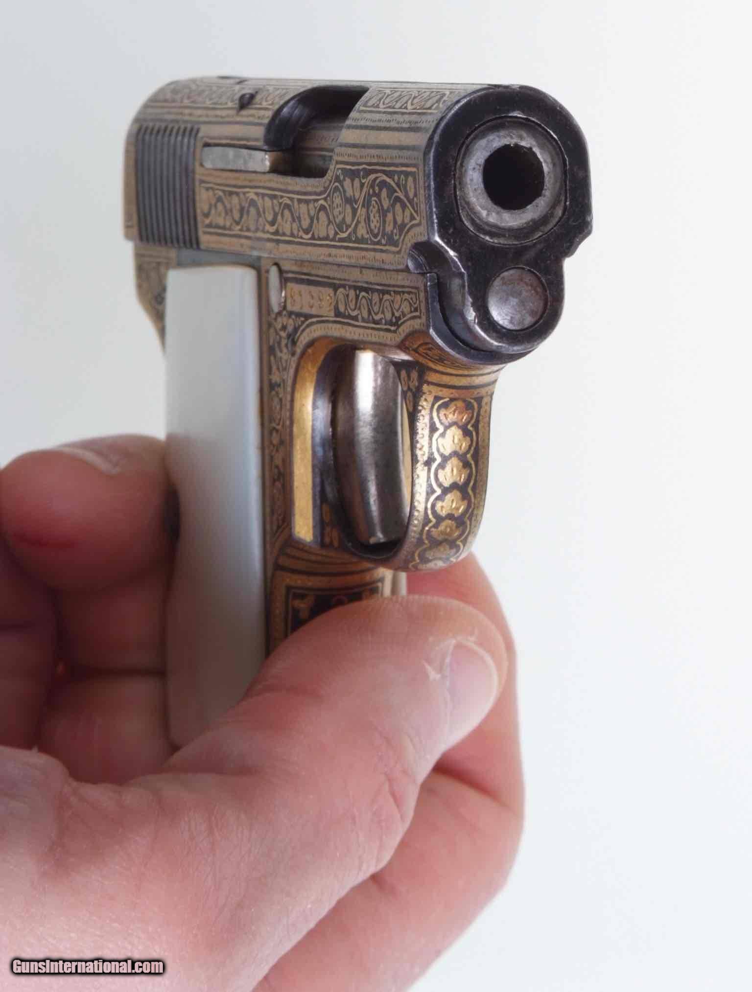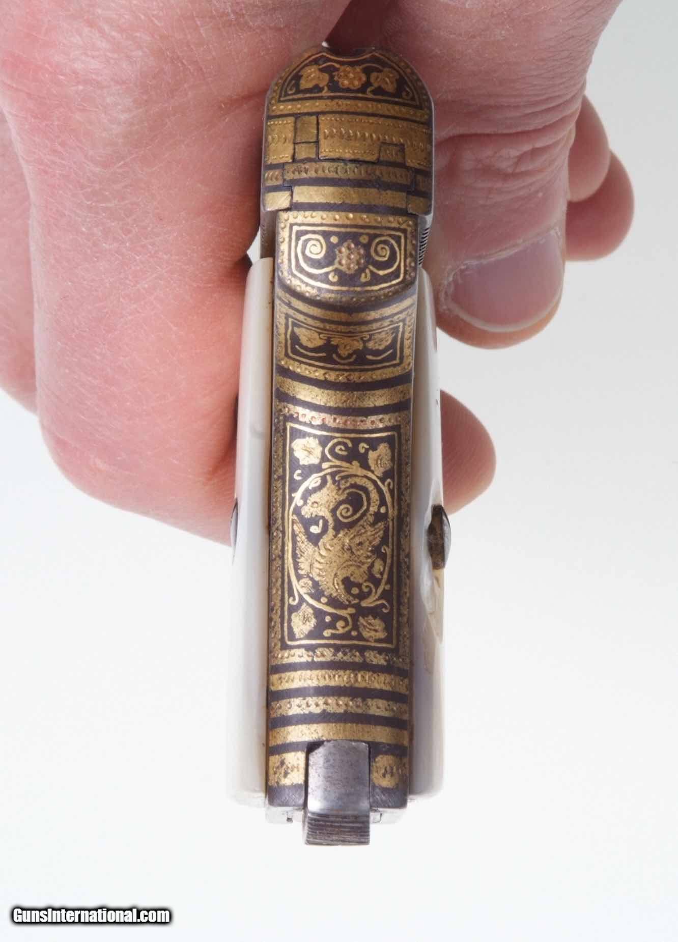 Description: Standard configuration Destroyer with fixed front and rear sight and 2.25” barrel measuring 4.5” length and 3” height. Left frame marked “DESTROYER PATENT/CAL. 6.35.” Full Serial number on right side of frame. Damascening applied in a floral/scroll pattern with accented border over most surfaces, including the exposed portion of the barrel hood, with classic Eibar-inspired dragon on backstrap. Magazine floorplate and screwheads are also damascened with a gold wash having been applied to the thumb safety, trigger, and magazine release. In fact, the only portions of this pistol not embellished are the front of the muzzle, the inside of the trigger guard and the bottom of the frame. Smooth mother-of-pearl grips. Blued magazine body with five indicator holes and damascened floorplate. Disassembly shows major parts with matching assembly number “336”. Synopsis: Luxurious Gold Damascened Destroyer, nearly 100% coverage, with mother of pearl grips. Condition: Approximately 97% of the gold damascening with sharp edge wear from careful use. As true for many of these pistols, much of the gold wash from the thumb safety has faded with comparable fading over grip screws. Left grip is nearly perfect. The right grip has a noticeable chip extending back from the screw. Bright bore with shallow rifling. Perfect manual mechanics. One of the most appealing of the Spanish pocket pistols with a REALLY memorable name. For more information about gold damascene guns, click here. A HISTORIC INVESTMENT! ~~Insured shipping fee of $65; most packages shipped using FedEx 2nd Day.~~ SOLD Manufacturer: Spanish Destroyer Serial Number: 81092 Caliber Info: 6.35 mm |