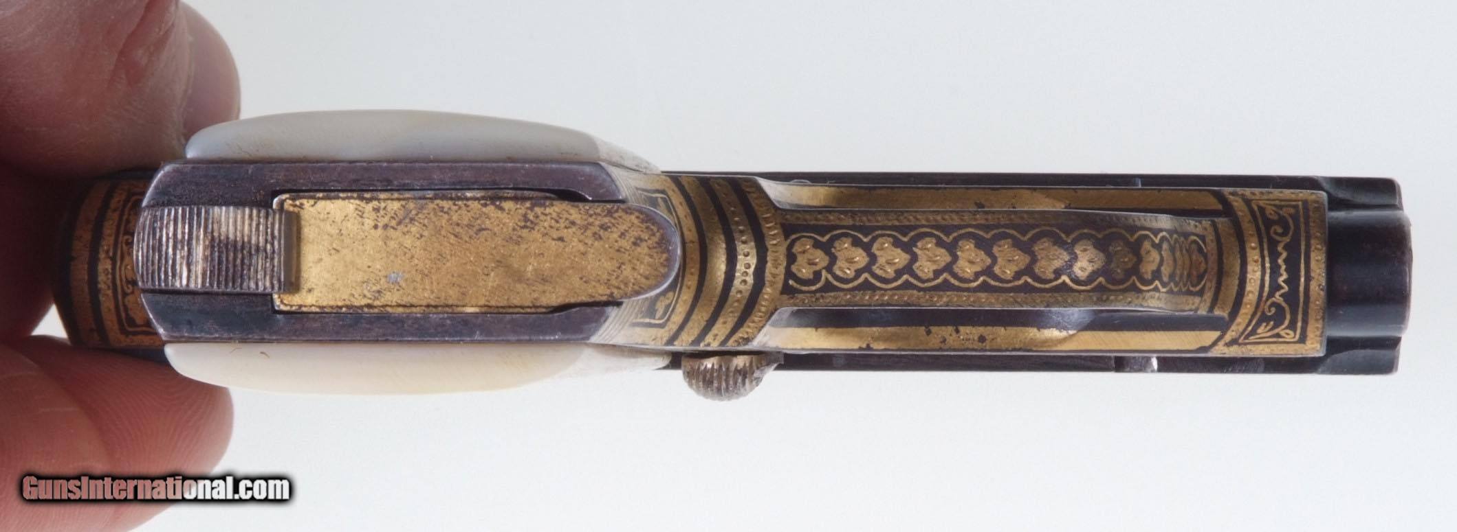 Approximately 97% of the gold damascening with sharp edge wear from careful use. As true for many of these pistols, much of the gold wash from the thumb safety has faded with comparable fading over grip screws. Left grip is nearly perfect. The right grip has a noticeable chip extending back from the screw. Bright bore with shallow rifling. Perfect manual mechanics. One of the most appealing of the Spanish pocket pistols with a REALLY memorable name. For more information about gold damascene guns, click here. A HISTORIC INVESTMENT!